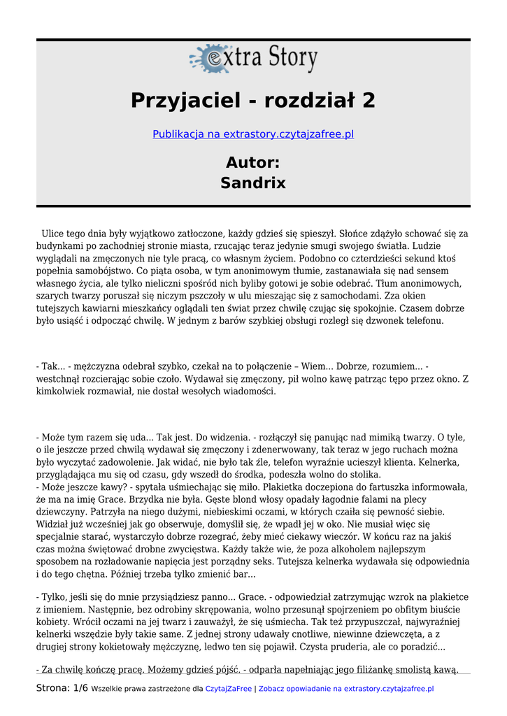 Przyjaciel - rozdział 2 Publikacja na extrastory.czytajzafree.pl Autor: Sandrix Ulice tego dnia były wyjątkowo zatłoczone, każdy gdzieś się spieszył. Słońce zdążyło schować się za budynkami po zachodniej stronie miasta, rzucając teraz jedynie smugi swojego światła. Ludzie wyglądali na zmęczonych nie tyle pracą, co własnym życiem. Podobno co czterdzieści sekund ktoś popełnia samobójstwo. Co piąta osoba, w tym anonimowym tłumie, zastanawiała się nad sensem własnego życia, ale tylko nieliczni spośród nich byliby gotowi je sobie odebrać. Tłum anonimowych, szarych twarzy poruszał się niczym pszczoły w ulu mieszając się z samochodami. Zza okien tutejszych kawiarni mieszkańcy oglądali ten świat przez chwilę czując się spokojnie. Czasem dobrze było usiąść i odpocząć chwilę. W jednym z barów szybkiej obsługi rozległ się dzwonek telefonu. - Tak... - mężczyzna odebrał szybko, czekał na to połączenie – Wiem... Dobrze, rozumiem... westchnął rozcierając sobie czoło. Wydawał się zmęczony, pił wolno kawę patrząc tępo przez okno. Z kimkolwiek rozmawiał, nie dostał wesołych wiadomości. - Może tym razem się uda... Tak jest. Do widzenia. - rozłączył się panując nad mimiką twarzy. O tyle, o ile jeszcze przed chwilą wydawał się zmęczony i zdenerwowany, tak teraz w jego ruchach można było wyczytać zadowolenie. Jak widać, nie było tak źle, telefon wyraźnie ucieszył klienta. Kelnerka, przyglądająca mu się od czasu, gdy wszedł do środka, podeszła wolno do stolika. - Może jeszcze kawy? - spytała uśmiechając się miło. Plakietka doczepiona do fartuszka informowała, że ma na imię Grace. Brzydka nie była. Gęste blond włosy opadały łagodnie falami na plecy dziewczyny. Patrzyła na niego dużymi, niebieskimi oczami, w których czaiła się pewność siebie. Widział już wcześniej jak go obserwuje, domyślił się, że wpadł jej w oko. Nie musiał więc się specjalnie starać, wystarczyło dobrze rozegrać, żeby mieć ciekawy wieczór. W końcu raz na jakiś czas można świętować drobne zwycięstwa. Każdy także wie, że poza alkoholem najlepszym sposobem na rozładowanie napięcia jest porządny seks. Tutejsza kelnerka wydawała się odpowiednia i do tego chętna. Później trzeba tylko zmienić bar... - Tylko, jeśli się do mnie przysiądziesz panno... Grace. - odpowiedział zatrzymując wzrok na plakietce z imieniem. Następnie, bez odrobiny skrępowania, wolno przesunął spojrzeniem po obfitym biuście kobiety. Wrócił oczami na jej twarz i zauważył, że się uśmiecha. Tak też przypuszczał, najwyraźniej kelnerki wszędzie były takie same. Z jednej strony udawały cnotliwe, niewinne dziewczęta, a z drugiej strony kokietowały mężczyznę, ledwo ten się pojawił. Czysta pruderia, ale co poradzić... - Za chwilę kończę pracę. Możemy gdzieś pójść. - odparła napełniając jego filiżankę smolistą kawą. Strona: 1/6 Wszelkie prawa zastrzeżone dla CzytajZaFree | Zobacz opowiadanie na extrastory.czytajzafree.pl Odeszła w stronę baru kołysząc kusząco biodrami świadoma tego, jakie uczucie wywołuje we wszystkich klientach. Teraz jednak skupiła swoją uwagę na jednym. Sprawiał wrażenie bogatego i dobrze usytuowanego. Garnitur wyglądający, jakby właściciel ubrał go wprost od krawca, włosy nienagannie ułożone. Okulary zarzucone niedbale na nos, krawat pasujący pod kolor garnituru, spinki współgrające z zegarkiem. Grace dostrzegła każdy szczegół i liczyła, że tym razem uda jej się złapać dobrą partię... Łóżko skrzypiąc uginało się w równym rytmie, stanowiąc tło dla jęków wydawanych przez kobietę. Ubrania leżały porozrzucane po całym pokoju będącym sypialnią i salonem w jednym. Trafili do mieszkania blondynki godzinę po tym, jak dopili kawę. Chociaż ciężko było nazwać mieszkaniem tą dziurę. Jeden pokój, maleńka kuchnia połączona z przedpokojem i łazienka, gdzie siedząc na toalecie trzeba było mieć nogi prawie pod prysznicem. - Mocniej...! - krzyczała raz po raz blondynka wypinając się bardziej w kierunku kochanka. Mężczyzna, zgodnie z życzeniem, zaczął brutalniej wbijać się między jej pośladki. Co jakiś czas uderzał w nie otwartą dłonią zostawiając czerwone ślady na skórze kobiety. W końcu, po kilku mocniejszych pchnięciach, Grace krzyknęła głośniej odrzucając głowę do tyłu i drgając w przypływie orgazmu. Brunet wykonał jeszcze kilka ruchów i również skończył. Nie należał do złych kochanków... Mógłby nawet pokusić się o stwierdzenie, że jest jednym z lepszych. Jednak nawet dla niego doprowadzenie kochanki do trzeciego szczytu z rzędu było ciężkim zadaniem. Opadł na łóżko koło kobiety i spojrzał bardziej przytomnym wzrokiem na otoczenie. Obdrapane z tapety ściany, wieczny dym, który Grace powiększała zapalając swojego papierosa... Dla niej seks bez dawki nikotyny „przed” i „po” nie był tym samym. Tak jak poranki. Mężczyzna przerzucił wzrok na drugą stronę mieszkania. Widząc wiszące w drzwiach koraliki, stertę naczyń w zlewie, nie ruszaną od co najmniej tygodnia zasłonił oczy dłonią powstrzymując się od kręcenia głową. Pomyśleć, że jego ulubiony garnitur leży gdzieś tam, na brudnej podłodze... Pomyśleć, że blondynka leżąca obok niego, mogła tutaj mieszkać. Brakowało jedynie kota, który roznosiłby wszędzie swoją sierść i zarazki. Albo karaluchów, choć te pewnie gdzieś się chowały. - Zrobię kawę. - usłyszał ciche słowa, po których poczuł jej usta na swoich. Smak kobiety mieszał się ze smakiem papierosa. Brunet nie palił, co najwyżej dobrej jakości cygara, więc skrzywił się nieznacznie. - Mówiłeś... Że jak się nazywasz? - rzuciła jeszcze pytanie wstając z łóżka i idąc wolnym krokiem nago do kuchni. Jej biodra znów kołysały się w kuszący sposób, na pośladkach miała jeszc