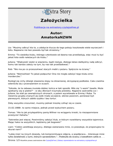 Założycielka Publikacja na extrastory.czytajzafree.pl Autor: AmatorkaNZWN Lio: "Musimy odkryć kto to, a zdobycie klucza do tego pokoju kosztowało wiele wyrzeczeń i bólu. Napewno nie bez powodu był tak strzeżony." Emma: "To siedziba klubu, którego członkowie od dawna nas prześladują, więc musi tu być jakaś lista osób należacych do klubu." Juliana: "Większość siedzi w więzieniu, bądź nieżyje, dlatego łatwo dalibyśmy radę odkryć, komu tak bardzo zależy na tym, by nas tak prześladować." Rob: "Nie ma po co przeszukiwać starych mebli z pożaru. Spójrzcie na ścianę." Juliana: "Niemożliwe! To jakaś podpucha! Ona nie mogła założyć tego klubu emomorderców." Rozległ się cichy dźwięk stawiania stopy na drewnianej, skrzypiącej podłodze. Cała czwórka odwróciła się z przerażeniem w oczach. "Szkoda, że ta zabawa musiała dobiec końca w taki sposób. Miło się "z wami" bawiło. Może spotkamy się w piekle?" - w obu dłoniach trzymała pistolety. Najpierw zastrzeliła Lio i Juliane, bo stali po zewnętrznych stronach, a potem wycelowała w Emmę i Roba. Ta niewinna grupka znanych jej osób miała szczęście, wbrew pozorom, ponieważ byli pierwszymi, których zabiła szybko i bez tortur. Żeby wszystko zrozumieć, musimy jednak troszkę cofnąć się w czasie. 15.02.1988r. to samo miejsce, jednak przed wybuchem pożaru. Tomas: "Ale to jak przyłapaliśmy panią Willner na wciąganiu kreski, to niezapomniane przeżycie! Hahaha." "Sekretów jest więcej. Powinniśmy założyć klub, w którym rozwikłamy wszystkie tajemnice. Mając haka na wszystkich, będziemy jak bogowie!" Liam: "Ciebie uwielbiają wszyscy, dlatego zastanawia mnie, co powoduje, że proponujesz to akurat nam?" "Lubię mieć na innych dowody, lub kompromitujące zdjęcia, a współpraca... Interesuje mnie tylko działalność z tymi, których sprawdziłam." - Podeszła do ściany z kawałkiem szkła w Strona: 1/3 Wszelkie prawa zastrzeżone dla CzytajZaFree | Zobacz opowiadanie na extrastory.czytajzafree.pl lewej dłoni. Zraniła się dość mocno, po czym, krwią napisała swoje imię i nazwisko na ścianie. - "Kto jest chętny dołączyć do mojego klubu. Pamiętajcie, że liczą się ci, gotowi za mnie zginąć!". Na ścianie zapisali się: Liam, Tomas, Adel, Mateo, Marika, Felix, Sara, Bryan, Otto, Kris, Dariusz oraz Natian. Obecna w gronie Lisha, nie planowała zapisać się. Liczyła, na pozwolenie odejścia, jakby nigdy nic. Niestety, reszta zbyt mocno fascynowała się krwią. Przywiązali ją do stołu, ranili ją nożem, patrząc jak spływa krew, badając ją i kosztując. Pozwolili jej się wykrwawiać i głodować, jednocześnie nieco podtrzymując ją przy życiu, by móc dłużej się bawić, patrząc jak rośnie jej nadzieja na nadejście ratunku. Spytacie, dlaczego nikt nie szukał Lishy? Otóż obecna młodzież była uciekinierami z sierocińca, którzy na własną rękę znaleźli sobie rodziny, które nie miały pojęcia, że w ich domu kryje się jeszcze ktoś. Czternaście osób, to nie przypadkowo wybrane dzieciaki, lecz starannie dobrana ekipa. Po co powstała? Jej założycielka zapewne wie, my nie mamy pojęcia, ewentualnie kilka teorii. 18.02.1988r. policja znalazła zwłoki Lishy Anthonyd. Nie udało się zebrać dowodów zbrodni, gdyż, nagle ktoś podłożył ogień. Jedyne co uratowano, to zwłoki szesnastoletniej dziewczyny, która umierała długo, cierpiąc z powodu odwodnienia, niedożywienia i wykrwawiania się, a wszystko to odczuwała jednocześnie. 01.02.1994r. Felix, założycielka ekipy, Marika i Tomas, wybrali się podglądać nauczycielkę Dianę Awersson, podczas erotycznych zbliżeń z mężczyzną, zdecydowanie nie podobnym do jej męża. Zostając z nauczycielką sam na sam dali jej jedną z wielu kopii nagrania. Pani Awersson dogadała się z założycielką, ale szczegóły tej rozmowy zostały między nimi dwoma. Reszta czekała na korytarzu. Szpiegowskich akcji było wiele. Jedna z misji poszła kiepsko, bo, chodź nagrania udowadniające zakup narkotyków od dilera były doskonałe, to policjantka nie zamierzała dobić targu z założycielką, więc skończyła gorzej niż Lisha, chodź jej szukano. Policyjne poszukiwania, dla naszej bohaterskiej ekipy, szły jak po maśle, ponieważ znali każdy zakątek, do którego na ogół nikt nie zagląda. Ich druga ofiara zginęła bardziej brutalnie. Liam, był bowiem z zamiłowania lekarzem. Testował, na stróżu prawa, nowe ziołowe mieszanki, przebijał jej ciało na wylot różnymi zardzewiałymi śrubami, by obserwować działania bakterii na organizm, itp. Z upływem czasu, ekipa znajdowała inne zainteresowania. Niektórzy przestali uczestniczyć w śledzeniu. Wszyscy jednak wiedzieli, że muszą dochować sekretu, zabierając go ze sobą do grobu. Łudzili się, że założycielka na nich poprzestanie, ale ona prawdopodobnie od samego początku miała plany, jak sterować grą zwaną życiem. Założycielka, była dla członków ekipy milczącą i zaufaną osobą, dlatego ona wiedziała o nich wszystko, a oni o niej nic nie odkryli. Na początku 1995r. Liam wynalazł mieszankę ziół, która otłumaniała człowieka do tego stopnia, że był jak kukiełka. wykonywał wszystkie polecenia, po czym po upływie doby nie pamiętał co się z nim działo. Ten środek pozwalał im zmanipulować każdego. Założycielka umiejętnie wybierała ofiary tak, by każda pracowała w innym zawodzie, dając im dostęp do nowych danych z różnych dziedzin i okolic nowych miejsc. Ich ofiarami padali: agent, prywatna pani detektyw, pielęgniarka, pani listonosz, diler narkotykowy, ochroniarz najpopularniejszego klubu w mieście, striptizerka, złodziej, opiekunka do dzieci, kierownik restauracji, itd. Z osiąganej władzy najbardziej korzystała założycielka, lecz powoli zaczęli ją prześcigać koledzy Liam i Bryan. Wtedy dało się spostrzec, że założycielka jest Strona: 2/3 Wszelkie praw