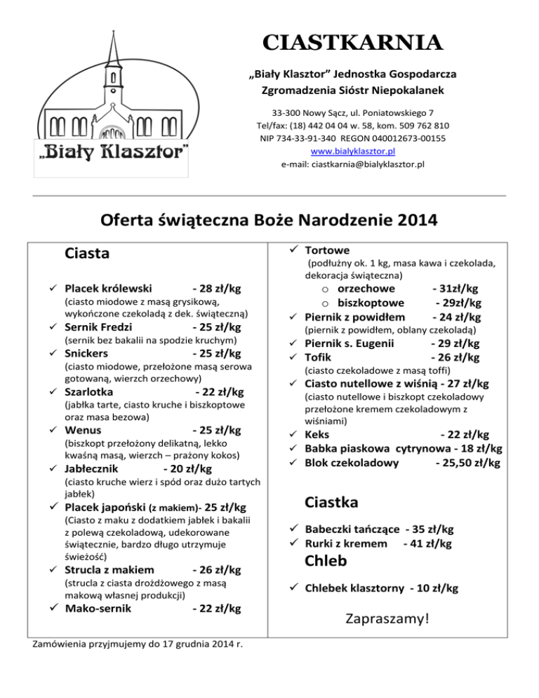 CIASTKARNIA „Biały Klasztor” Jednostka Gospodarcza Zgromadzenia Sióstr Niepokalanek 33-300 Nowy Sącz, ul. Poniatowskiego 7 Tel/fax: (18) 442 04 04 w. 58, kom. 509 762 810 NIP 734-33-91-340 REGON 040012673-00155 www.bialyklasztor.pl e-mail: [email protected] Oferta świąteczna Boże Narodzenie 2014 Tortowe Ciasta (podłużny ok. 1 kg, masa kawa i czekolada, dekoracja świąteczna) Placek królewski - 28 zł/kg (ciasto miodowe z masą grysikową, wykończone czekoladą z dek. świąteczną) Sernik Fredzi - 25 zł/kg (sernik bez bakalii na spodzie kruchym) Snickers - 25 zł/kg (ciasto miodowe, przełożone masą serowa gotowaną, wierzch orzechowy) Szarlotka - 22 zł/kg (jabłka tarte, ciasto kruche i biszkoptowe oraz masa bezowa) Wenus - 25 zł/kg (biszkopt przełożony delikatną, lekko kwaśną masą, wierzch – prażony kokos) Jabłecznik - 20 zł/kg (ciasto kruche wierz i spód oraz dużo tartych jabłek) Placek japoński (z makiem)- 25 zł/kg (Ciasto z maku z dodatkiem jabłek i bakalii z polewą czekoladową, udekorowane świątecznie, bardzo długo utrzymuje świeżość) Strucla z makiem - 26 zł/kg (strucla z ciasta drożdżowego z masą makową własnej produkcji) Mako-sernik - 22 zł/kg Zamówienia przyjmujemy do 17 grudnia 2014 r. o orzechowe o biszkoptowe Piernik z powidłem - 31zł/kg - 29zł/kg - 24 zł/kg (piernik z powidłem, oblany czekoladą) Piernik s. Eugenii - 29 zł/kg Tofik - 26 zł/kg (ciasto czekoladowe z masą toffi) Ciasto nutellowe z wiśnią - 27 zł/kg (ciasto nutellowe i biszkopt czekoladowy przełożone kremem czekoladowym z wiśniami) Keks - 22 zł/kg Babka piaskowa cytrynowa - 18 zł/kg Blok czekoladowy - 25,50 zł/kg Ciastka Babeczki tańczące - 35 zł/kg Rurki z kremem - 41 zł/kg Chleb Chlebek klasztorny - 10 zł/kg Zapraszamy!