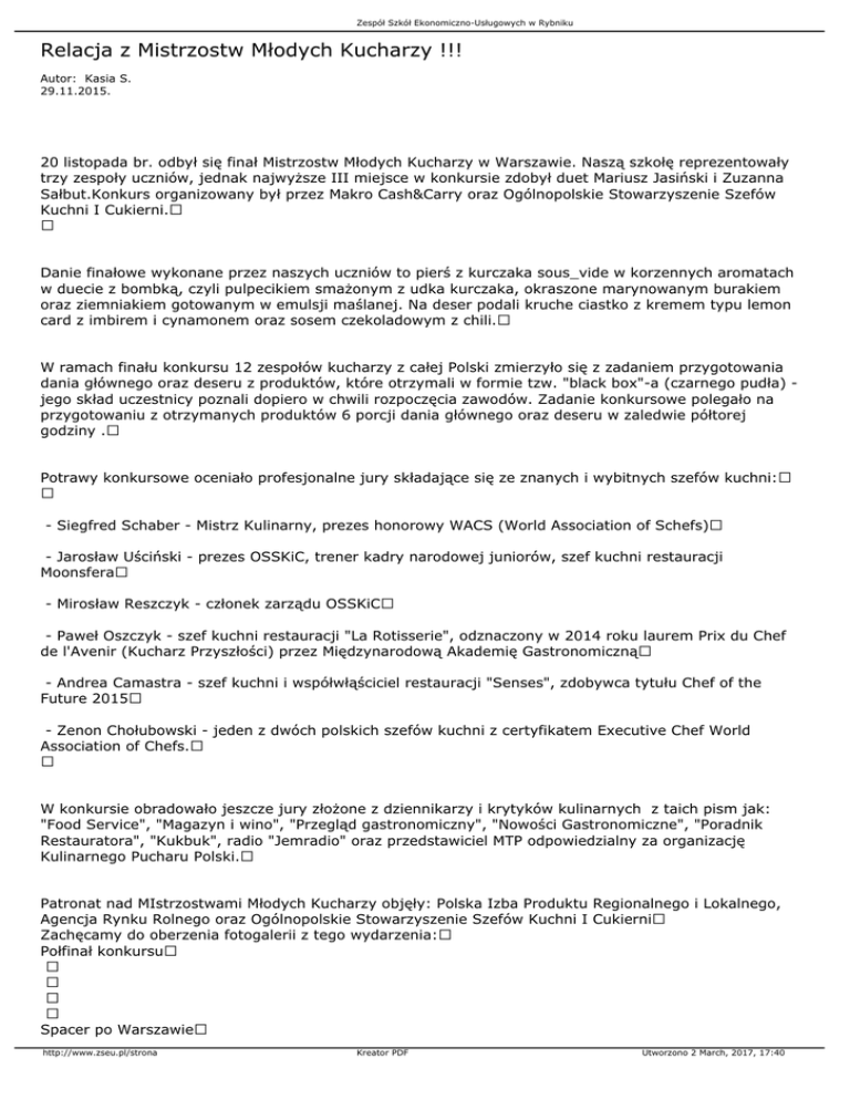 Zespół Szkół Ekonomiczno-Usługowych w Rybniku Relacja z Mistrzostw Młodych Kucharzy !!! Autor: Kasia S. 29.11.2015. 20 listopada br. odbył się finał Mistrzostw Młodych Kucharzy w Warszawie. Naszą szkołę reprezentowały trzy zespoły uczniów, jednak najwyższe III miejsce w konkursie zdobył duet Mariusz Jasiński i Zuzanna Sałbut.Konkurs organizowany był przez Makro Cash&Carry oraz Ogólnopolskie Stowarzyszenie Szefów Kuchni I Cukierni. Danie finałowe wykonane przez naszych uczniów to pierś z kurczaka sous_vide w korzennych aromatach w duecie z bombką, czyli pulpecikiem smażonym z udka kurczaka, okraszone marynowanym burakiem oraz ziemniakiem gotowanym w emulsji maślanej. Na deser podali kruche ciastko z kremem typu lemon card z imbirem i cynamonem oraz sosem czekoladowym z chili. W ramach finału konkursu 12 zespołów kucharzy z całej Polski zmierzyło się z zadaniem przygotowania dania głównego oraz deseru z produktów, które otrzymali w formie tzw. "black box"-a (czarnego pudła) jego skład uczestnicy poznali dopiero w chwili rozpoczęcia zawodów. Zadanie konkursowe polegało na przygotowaniu z otrzymanych produktów 6 porcji dania głównego oraz deseru w zaledwie półtorej godziny . Potrawy konkursowe oceniało profesjonalne jury składające się ze znanych i wybitnych szefów kuchni: - Siegfred Schaber - Mistrz Kulinarny, prezes honorowy WACS (World Association of Schefs) - Jarosław Uściński - prezes OSSKiC, trener kadry narodowej juniorów, szef kuchni restauracji Moonsfera - Mirosław Reszczyk - członek zarządu OSSKiC - Paweł Oszczyk - szef kuchni restauracji "La Rotisserie", odznaczony w 2014 roku laurem Prix du Chef de l'Avenir (Kucharz Przyszłości) przez Międzynarodową Akademię Gastronomiczną - Andrea Camastra - szef kuchni i współwłąściciel restauracji "Senses", zdobywca tytułu Chef of the Future 2015 - Zenon Chołubowski - jeden z dwóch polskich szefów kuchni z certyfikatem Executive Chef World Association of Chefs. W konkursie obradowało jeszcze jury złożone z dziennikarzy i krytyków kulinarnych z taich pism jak: "Food Service", "Magazyn i wino", "Przegląd gastronomiczny", "Nowości Gastronomiczne", "Poradnik Restauratora", "Kukbuk", radio "Jemradio" oraz przedstawiciel MTP odpowiedzialny za organizację Kulinarnego Pucharu Polski. Patronat nad MIstrzostwami Młodych Kucharzy objęły: Polska Izba Produktu Regionalnego i Lokalnego, Agencja Rynku Rolnego oraz Ogólnopolskie Stowarzyszenie Szefów Kuchni I Cukierni Zachęcamy do oberzenia fotogalerii z tego wydarzenia: Połfinał konkursu Spacer po Warszawie http://www.zseu.pl/strona Kreator PDF Utworzono 2 March, 2017, 17:40 Zespół Szkół Ekonomiczno-Usługowych w Rybniku Finał konkursu Gala finałowa http://www.zseu.pl/strona Kreator PDF Utworzono 2 March, 2017, 17:40