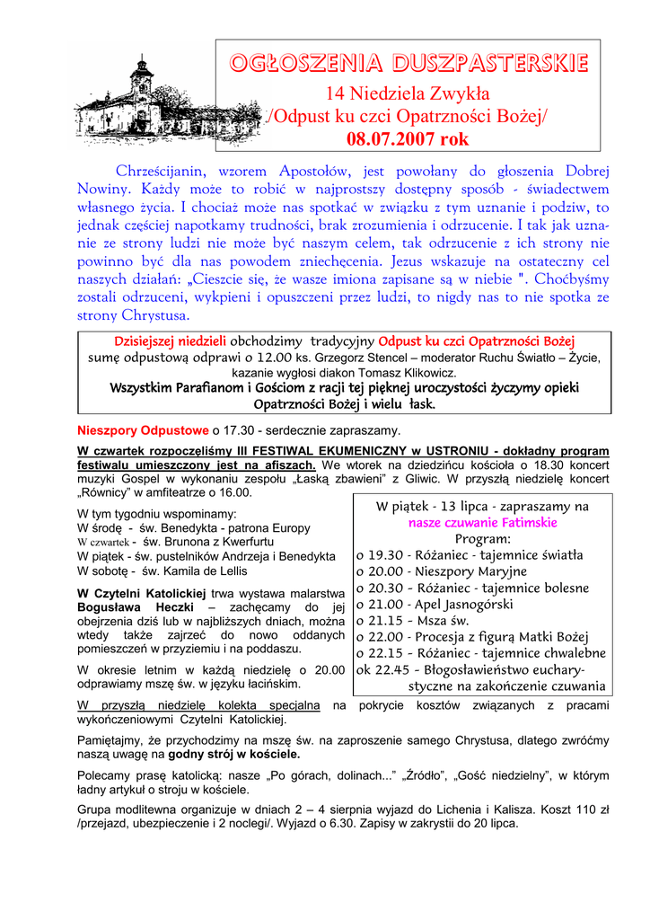 OGŁOSZENIA DUSZPASTERSKIE 14 Niedziela Zwykła /Odpust ku czci Opatrzności BoŜej/ 08.07.2007 rok Chrześcijanin, wzorem Apostołów, jest powołany do głoszenia Dobrej Nowiny. KaŜdy moŜe to robić w najprostszy dostępny sposób - świadectwem własnego Ŝycia. I chociaŜ moŜe nas spotkać w związku z tym uznanie i podziw, to jednak częściej napotkamy trudności, brak zrozumienia i odrzucenie. I tak jak uznanie ze strony ludzi nie moŜe być naszym celem, tak odrzucenie z ich strony nie powinno być dla nas powodem zniechęcenia. Jezus wskazuje na ostateczny cel naszych działań: „Cieszcie się, Ŝe wasze imiona zapisane są w niebie ". Choćbyśmy zostali odrzuceni, wykpieni i opuszczeni przez ludzi, to nigdy nas to nie spotka ze strony Chrystusa. Dzisiejszej niedzieli obchodzimy tradycyjny Odpust ku czci Opatrzności BoŜej sumę odpustową odprawi o 12.00 ks. Grzegorz Stencel – moderator Ruchu Światło – śycie, kazanie wygłosi diakon Tomasz Klikowicz. Wszystkim Parafianom i Gościom z racji tej pięknej uroczystości Ŝyczymy opieki Opatrzności BoŜej i wielu łask. Nieszpory Odpustowe o 17.30 - serdecznie zapraszamy. W czwartek rozpoczęliśmy III FESTIWAL EKUMENICZNY w USTRONIU - dokładny program festiwalu umieszczony jest na afiszach. We wtorek na dziedzińcu kościoła o 18.30 koncert muzyki Gospel w wykonaniu zespołu „Łaską zbawieni” z Gliwic. W przyszłą niedzielę koncert „Równicy” w amfiteatrze o 16.00. W piątek - 13 lipca - zapraszamy na W tym tygodniu wspominamy: nasze czuwanie Fatimskie W środę - św. Benedykta - patrona Europy Program: W czwartek - św. Brunona z Kwerfurtu o 19.30 - RóŜaniec - tajemnice światła W piątek - św. pustelników Andrzeja i Benedykta W sobotę - św. Kamila de Lellis o 20.00 - Nieszpory Maryjne W Czytelni Katolickiej trwa wystawa malarstwa o 20.30 – RóŜaniec - tajemnice bolesne Bogusława Heczki – zachęcamy do jej o 21.00 - Apel Jasnogórski obejrzenia dziś lub w najbliŜszych dniach, moŜna o 21.15 – Msza św. wtedy takŜe zajrzeć do nowo oddanych o 22.00 - Procesja z figurą Matki BoŜej pomieszczeń w przyziemiu i na poddaszu. o 22.15 – RóŜaniec - tajemnice chwalebne W okresie letnim w kaŜdą niedzielę o 20.00 ok 22.45 – Błogosławieństwo eucharyodprawiamy mszę św. w języku łacińskim. styczne na zakończenie czuwania W przyszłą niedzielę kolekta specjalna wykończeniowymi Czytelni Katolickiej. na pokrycie kosztów związanych z pracami Pamiętajmy, Ŝe przychodzimy na mszę św. na zaproszenie samego Chrystusa, dlatego zwróćmy naszą uwagę na godny strój w kościele. Polecamy prasę katolicką: nasze „Po górach, dolinach...” „Źródło”, „Gość niedzielny”, w którym ładny artykuł o stroju w kościele. Grupa modlitewna organizuje w dniach 2 – 4 sierpnia wyjazd do Lichenia i Kalisza. Koszt 110 zł /przejazd, ubezpieczenie i 2 noclegi/. Wyjazd o 6.30. Zapisy w zakrystii do 20 lipca.