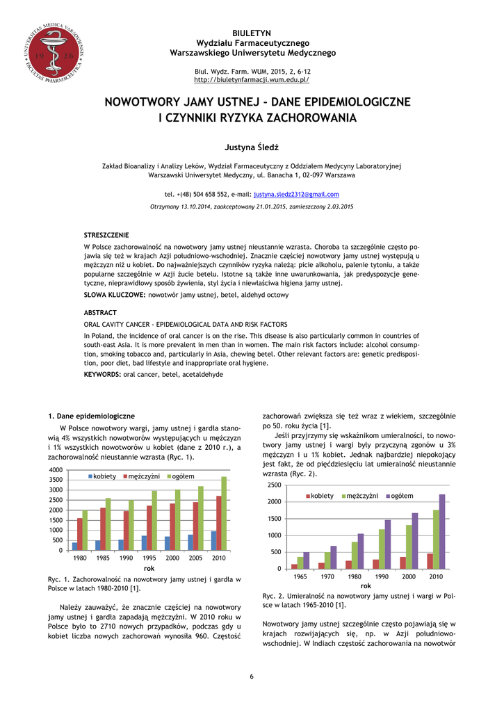 BIULETYN Wydziału Farmaceutycznego Warszawskiego Uniwersytetu Medycznego Biul. Wydz. Farm. WUM, 2015, 2, 6-12 http://biuletynfarmacji.wum.edu.pl/ NOWOTWORY JAMY USTNEJ - DANE EPIDEMIOLOGICZNE I CZYNNIKI RYZYKA ZACHOROWANIA Justyna Śledź Zakład Bioanalizy i Analizy Leków, Wydział Farmaceutyczny z Oddziałem Medycyny Laboratoryjnej Warszawski Uniwersytet Medyczny, ul. Banacha 1, 02-097 Warszawa tel. +(48) 504 658 552, e-mail: [email protected] Otrzymany 13.10.2014, zaakceptowany 21.01.2015, zamieszczony 2.03.2015 STRESZCZENIE W Polsce zachorowalność na nowotwory jamy ustnej nieustannie wzrasta. Choroba ta szczególnie często pojawia się też w krajach Azji południowo-wschodniej. Znacznie częściej nowotwory jamy ustnej występują u mężczyzn niż u kobiet. Do najważniejszych czynników ryzyka należą: picie alkoholu, palenie tytoniu, a także popularne szczególnie w Azji żucie betelu. Istotne są także inne uwarunkowania, jak predyspozycje genetyczne, nieprawidłowy sposób żywienia, styl życia i niewłaściwa higiena jamy ustnej. SŁOWA KLUCZOWE: nowotwór jamy ustnej, betel, aldehyd octowy ABSTRACT ORAL CAVITY CANCER - EPIDEMIOLOGICAL DATA AND RISK FACTORS In Poland, the incidence of oral cancer is on the rise. This disease is also particularly common in countries of south-east Asia. It is more prevalent in men than in women. The main risk factors include: alcohol consumption, smoking tobacco and, particularly in Asia, chewing betel. Other relevant factors are: genetic predisposition, poor diet, bad lifestyle and inappropriate oral hygiene. KEYWORDS: oral cancer, betel, acetaldehyde 1. Dane epidemiologiczne zachorowań zwiększa się też wraz z wiekiem, szczególnie po 50. roku życia [1]. Jeśli przyjrzymy się wskaźnikom umieralności, to nowotwory jamy ustnej i wargi były przyczyną zgonów u 3% mężczyzn i u 1% kobiet. Jednak najbardziej niepokojący jest fakt, że od pięćdziesięciu lat umieralność nieustannie wzrasta (Ryc. 2). W Polsce nowotwory wargi, jamy ustnej i gardła stanowią 4% wszystkich nowotworów występujących u mężczyzn i 1% wszystkich nowotworów u kobiet (dane z 2010 r.), a zachorowalność nieustannie wzrasta (Ryc. 1). 4000 kobiety 3500 mężczyźni ogółem 2500 3000 2500 kobiety 2000 mężczyźni ogółem 2000 1500 1500 1000 1000 500 0 1980 1985 1990 1995 2000 2005 500 2010 rok 0 1965 Ryc. 1. Zachorowalność na nowotwory jamy ustnej i gardła w Polsce w latach 1980-2010 [1]. 1970 1980 1990 2000 2010 rok Ryc. 2. Umieralność na nowotwory jamy ustnej i wargi w Polsce w latach 1965-2010 [1]. Należy zauważyć, że znacznie częściej na nowotwory jamy ustnej i gardła zapadają mężczyźni. W 2010 roku w Polsce było to 2710 nowych przypadków, podczas gdy u kobiet liczba nowych zachorowań wynosiła 960. Częstość Nowotwory jamy ustnej szczególnie często pojawiają się w krajach rozwijających się, np. w Azji południowowschodniej. W Indiach częstość zachorowania na nowotwór 6 J. Śledź/Biul. Wydz. Farm. WUM, 2015, 2, 6-12 języka u mężczyzn wynosi 7,6 na 100 000 osób. Zwiększona umieralność dodatkowo spowodowana jest niskim statusem społecznym i słabym dostępem do podstawowej opieki zdrowotnej, a leczenie często stanowi dla chorych ogromne obciążenie finansowe [2]. 2.2. Żucie betelu Betel to używka szczególnie popularna w krajach Dalekiego Wschodu, której głównym komponentem jest pieprz żuwny. Do regularnego zażywania betelu przyznaje się około 10% światowej populacji ludzi. Oddziaływanie pieprzu żuwnego może prowadzić do powstania zwłóknienia pośluzówkowego (OSMF) [2]. Jest to przewlekła choroba określana jako stan przednowotworowy, która prowadzi do nieodwracalnych zmian włóknistych w drogach oddechowych. Szacuje się, że w samych tylko Indiach około 5 mln ludzi cierpi na OSMF [9]. Betel można spożywać pod kilkoma postaciami. W południowo-wschodniej Azji popularne są dojrzałe owoce tej rośliny, natomiast Tajwańczycy najczęściej spożywają świeże niedojrzałe owoce z dodatkiem wapna gaszonego [10]. Wykazano, że ludzie uzależnieni od betelu zapadają na nowotwór w młodszym wieku oraz charakteryzuje ich niższa przeżywalność w porównaniu z osobami bez tego nałogu. Ryzyko zachorowania zmienia się też w zależności od spożywanej dawki i czasu uzależnienia [11]. Ekstrakt z pieprzu żuwnego wykazuje działanie cytotoksyczne na ludzkie komórki nabłonka jamy ustnej. Powoduje również rozpad nici DNA i tworzenie jąderek komórkowych, co jest elementem jego działania genotoksycznego [12]. Arekolina jest alkaloidem i głównym składnikiem aktywnym betelu, który może przyczyniać się do rozwoju kancerogenezy. Proces ten zachodzi w wyniku blokowania genów supresorowych poprzez ich hipermetylację. Geny te kodują białka p53, p14, p15 i p16, które regulują wiele procesów komórkowych, są m.in. odpowiedzialne za aktywację mechanizmów naprawy DNA i indukcję apoptozy. Arekolina, fosforylując czynnik H2AX, powoduje jego aktywację, a on z kolei staje się przyczyną uszkodzeń DNA. Substancja ta wpływa również na powstawanie aberracji chromosomowych i mutacji genowych, może też zatrzymywać cykl komórkowy w fazie G2/M [13]. Innym składnikiem aktywnym betelu jest hydroksychawikol. Może on nasilać ekspresję cyklooksygenazy 2 (COX2) oraz PGE2, które są związkami o charakterze prozapalnym. Dodatkowo hydroksychawikol indukuje pęknięcia w nici DNA oraz powstawanie 8-hydroksydeoksyguanozyny, która jest markerem oksydacyjnego rozpadu DNA [11,12]. Pacjenci, którzy jednocześnie żują betel i palą papierosy, bardzo często zapadają na nowotwór jamy ustnej w młodszym wieku w porównaniu do ludzi nieuzależnionych. Często też choroba w czasie stawiania diagnozy jest już bardzo zaawansowana. Duże znaczenie ma też dawka i wiek, w którym zaczęto spożywać betel [14]. 2. Przyczyny zachorowania Przyczyny zachorowania na nowotwory jamy ust