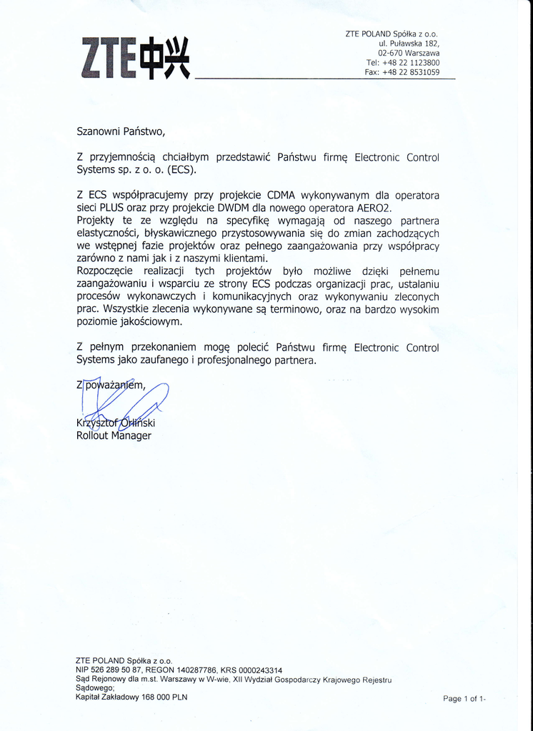 ZTE+X ZTE POLANDSpółkaz o.o' u|.Puławska 182, 02-670Warszawa Tel: +4822 1t23800 Fax:+4822 8531059 SzanowniPaństwo, Z przyjemnością chciałbymprzedstawićPaństwu firmę E|ectronicContro| Systemssp. z o. o. (ECS). przY projekcieCDMA wykonywanymd|a operatora Z EcS Współpracujemy sieciPLUSoraz przyprojekcieDWDMdla nowegooperatoraAEROZ. Projekty te ze wzg|ędu na specyfikęwymagają od naszego partnera przystosowywania elasĘczności, błyskawicznego się do zmian zachodzących We Wstępnejfazie projektóworaz pełnegoZaangazowania przy Współpracy zarównoZ namijak i z naszymik|ientami' Rozpoczęcie reaIizacji tych projektów było mozliwe dzięki pełnemu zaangazowaniu prac,ustalaniu i wsparciuze stronyECS podczasorganizacji procesów wykonawczychi komunikacyjnych oraz wykonywaniuz|econych prac.Wszystkiez|ecenia wykonywane są terminowo, oraz na bardzowysokim jakościowym. poziomie z pełnymprzekonaniemmogę po|ecićPaństwu firmę E|ectronicContro| partnera. Systemsjako zaufanegoi profesjonalnego ZTE POLAND Społkaz o.o' NtP 526 289 50 87, REGON 140287786,KRS 0000243314 Sąd Rejonowyd|a m.st.Warszawyw W-wie,X|l WydziałGospodarczyKrajowegoRejestru Sądowego; KapitałZakładovvy168 000 PLN Page1 of 1-