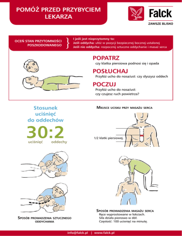 POMÓŻ PRZED PRZYBYCIEM LEKARZA I jeśli jest nieprzytomny to: Jeśli oddycha: ułóż w pozycji bezpiecznej bocznej ustalonej Jeśli nie oddycha: rozpocznij sztuczne oddychanie i masaż serca OCEŃ STAN PRZYTOMNOŚCI POSZKODOWANEGO POPATRZ czy klatka piersiowa podnosi się i opada POSŁUCHAJ Przyłóż ucho do nosa/ust: czy słyszysz oddech POCZUJ Przyłóż ucho do nosa/ust: czy czujesz ruch powietrza? Stosunek uciśnięć do oddechów MIEJSCE UCISKU PRZY MASAŻU SERCA 30:2 uciśnięć 1/2 klatki piersiowej. oddechy SPOSÓB PROWADZENIA MASAŻU SERCA SPOSÓB PROWADZENIA SZTUCZNEGO ODDYCHANIA Ręce wyprostowane w łokciach. Siła działa pionowo w dół. Częstość: 100 ucisnięć na minutę. [email protected] | www.falck.pl PIERWSZA POMOC PRZEDMEDYCZNA CZY POTRAFISZ POMÓC KOLEDZE W PRACY W PRZYPADKU ZAGROŻENIA ŻYCIA? PIERWSZA firma specjalizująca się w ratownictwie medycznym to Falck. Zależy nam na tym, by propagować idee i umiejętność niesienia pierwszej pomocy przedmedycznej. PIERWSZE minuty decydują o życiu i zdrowiu poszkodowanej osoby. PIERWSZA pomoc przedmedyczna jest bardzo ważna w ratowaniu ludzkiego życia. Bez niej na dalsze fachowe postępowanie może być za późno. Oferta szkoleń adresowana jest do różnych grup społecznych, a zajęcia przeprowadzana są przy pomocy najnowszego sprzętu ratowniczego i pomocy dydaktycznych. Podczas zajęć kładziemy nacisk na ćwiczenia i i symulację zdarzeń, tak aby sala szkoleniowa w jak największym stopniu odzwierciedlała rzeczywiste sytuacje na miejscu zdarzenia. Jesteśmy pewni, że nasze szkolenie pozwoli uzyskać każdemu uczestnikowi niezbędną wiedzę i praktyczne umiejętności zasad pierwszej pomocy przedmedycznej. Proponujemy następujące szkolenia: SZKOLENIE PODSTAWOWE Dla osób nie posiadających wykształcenia medycznego - dorosłych i młodzieży. SZKOLENIE ZAAWANSOWANE Dla osób i grup zawodowo związanych z niesieniem pomocy m.in. WOPR, GOPR. Udział może w nich wziąć każdy po ukończeniu kursu podstawowego. SZKOLENIE Z ZASAD PIERWSZEJ POMOCY PRZEDMEDYCZNEJ DLA UCZNIÓW Dla uczniów szkół ponadgimnazjalnych, gimnazjalnych i najmłodszych. SZKOLENIE DLA OPIEKUNEK / OPIEKUNÓW DLA DZIECI ORAZ DLA RODZICÓW Szkolenia organizujemy w całym kraju. Informacje można uzyskać w Oddziałach firmy Falck Medycyna Sp. z o.o. Osoby zainteresowane prosimy o skontaktowanie się z naszym Działem Handlowym: Biuro Regionalne w Warszawie ul. Obozowa 20, tel. 022 535 91 00 Biuro Regionalne w Krakowie ul. Mazowiecka 4/6, tel. 012 630 49 32 Biuro Regionalne w Katowicach ul. Pułaskiego 9, tel. 032 609 79 00 Biuro Regionalne w Olsztynie ul. Metalowa 6, tel. 089 533 40 92 Biuro Regionalne w Szczecinie ul. Staromłyńska 4-5, tel. 091 433 24 00 Biuro Regionalne w Poznaniu ul. Strzelecka 49, tel. 061 858 11 20 [email protected] | www.falck.pl