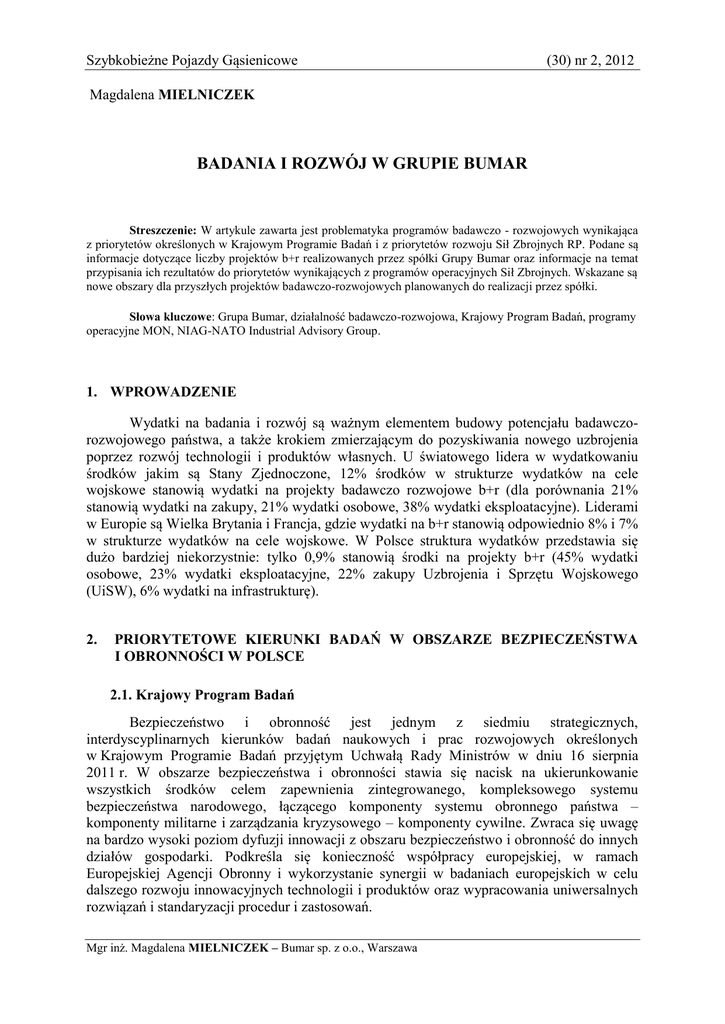Szybkobieżne Pojazdy Gąsienicowe (30) nr 2, 2012 Magdalena MIELNICZEK BADANIA I ROZWÓJ W GRUPIE BUMAR Streszczenie: W artykule zawarta jest problematyka programów badawczo - rozwojowych wynikająca z priorytetów określonych w Krajowym Programie Badań i z priorytetów rozwoju Sił Zbrojnych RP. Podane są informacje dotyczące liczby projektów b+r realizowanych przez spółki Grupy Bumar oraz informacje na temat przypisania ich rezultatów do priorytetów wynikających z programów operacyjnych Sił Zbrojnych. Wskazane są nowe obszary dla przyszłych projektów badawczo-rozwojowych planowanych do realizacji przez spółki. Słowa kluczowe: Grupa Bumar, działalność badawczo-rozwojowa, Krajowy Program Badań, programy operacyjne MON, NIAG-NATO Industrial Advisory Group. 1. WPROWADZENIE Wydatki na badania i rozwój są ważnym elementem budowy potencjału badawczorozwojowego państwa, a także krokiem zmierzającym do pozyskiwania nowego uzbrojenia poprzez rozwój technologii i produktów własnych. U światowego lidera w wydatkowaniu środków jakim są Stany Zjednoczone, 12% środków w strukturze wydatków na cele wojskowe stanowią wydatki na projekty badawczo rozwojowe b+r (dla porównania 21% stanowią wydatki na zakupy, 21% wydatki osobowe, 38% wydatki eksploatacyjne). Liderami w Europie są Wielka Brytania i Francja, gdzie wydatki na b+r stanowią odpowiednio 8% i 7% w strukturze wydatków na cele wojskowe. W Polsce struktura wydatków przedstawia się dużo bardziej niekorzystnie: tylko 0,9% stanowią środki na projekty b+r (45% wydatki osobowe, 23% wydatki eksploatacyjne, 22% zakupy Uzbrojenia i Sprzętu Wojskowego (UiSW), 6% wydatki na infrastrukturę). 2. PRIORYTETOWE KIERUNKI BADAŃ W OBSZARZE BEZPIECZEŃSTWA I OBRONNOŚCI W POLSCE 2.1. Krajowy Program Badań Bezpieczeństwo i obronność jest jednym z siedmiu strategicznych, interdyscyplinarnych kierunków badań naukowych i prac rozwojowych określonych w Krajowym Programie Badań przyjętym Uchwałą Rady Ministrów w dniu 16 sierpnia 2011 r. W obszarze bezpieczeństwa i obronności stawia się nacisk na ukierunkowanie wszystkich środków celem zapewnienia zintegrowanego, kompleksowego systemu bezpieczeństwa narodowego, łączącego komponenty systemu obronnego państwa – komponenty militarne i zarządzania kryzysowego – komponenty cywilne. Zwraca się uwagę na bardzo wysoki poziom dyfuzji innowacji z obszaru bezpieczeństwo i obronność do innych działów gospodarki. Podkreśla się konieczność współpracy europejskiej, w ramach Europejskiej Agencji Obronny i wykorzystanie synergii w badaniach europejskich w celu dalszego rozwoju innowacyjnych technologii i produktów oraz wypracowania uniwersalnych rozwiązań i standaryzacji procedur i zastosowań. Mgr inż. Magdalena MIELNICZEK – Bumar sp. z o.o., Warszawa Magdalena MIELNICZEK Krajowy Program Badań kładzie również nacisk na komercjalizację wyników prac rozwojowych i praktyczne ich wykorzystanie poprzez ścisłą współpracę pomiędzy podmiotami naukowymi i przemysłowymi oraz na ukierunkowanie środków wydawanych w tym obszarze na ściśle określone priorytety. Priorytetowe obszary rozwoju technologii w sferze bezpieczeństwa wewnętrznego, które mają wspierać proces wykrywania i zwalczania przestępczości, system zarządzania kryzysowego kraju i ochrony infrastruktury krytycznej, system ratunkowo-gaśniczy oraz bezpieczeństwo granic przedstawiają się następująco: - nowoczesne technologie i innowacyjne rozwiązania w zakresie wykrywania, zwalczania i neutralizacji zagrożeń, - technika kryminalistyczna, - indywidualne środki ochrony i wyposażenia, - profilaktyka społeczna, wiktymologia, kryminologia oraz badania społeczne, - organizacja i zarządzanie, - nowoczesne technologie lub rozwiązania innowacyjne w sferze bezpieczeństwa, teleinformatycznego, ochrony informacji w systemach i sieciach teleinformatycznych - oraz narodowej kryptografii. 2.2. Priorytetowe Kierunki Badań w obszarze obronności Określenie „Priorytetowych kierunków badań w resorcie obrony narodowej na lata 2013-2022” jest obowiązkiem spoczywającym na przedstawicielach Departamentu Nauki i Szkolnictwa Wojskowego MON (koordynator), Departamentu Strategii i Planowania Obronnego, Departamentu Polityki Bezpieczeństwa Międzynarodowego, Sztabu Generalnego WP, Inspektoratu Wojskowej Służby Zdrowia, Inspektoratu Wsparcia Sił Zbrojnych oraz Zespołu Naukowo-Przemysłowego, wynikającym z „Metodyki planowania i programowania rozwoju Sił Zbrojnych RP w latach 2013 – 2022” wprowadzonej decyzją Ministra Obrony Narodowej nr 64/Org./P5 z dnia 20.04.2011. Priorytetowe obszary rozwoju technologii w sferze obronności, które mają wspierać rozwój zdolności operacyjnych Sił Zbrojnych RP, określonych na najbliższe 10 lat jako: - zdolność do dowodzenia, - zdolność do rozpoznania, - zdolność do rażenia, - zdolność do wsparcia działań oraz do przerzutu i mobilności, - zdolność do przetrwania i ochrony wojsk, w tym zabezpieczenia medycznego, - zdolność do wsparcia układu pozamilitarnego w sytuacjach zagrożeń niemilitarnych, przedstawiają się następująco: - technologie informacyjne i sieciowe, - sensory i obserwacja, - broń precyzyjna i uzbrojenie, - platformy bezzałogowe (autonomiczne), - ochrona i przetrwanie na polu walki, - nowoczesne materiały, w tym wysokoenergetyczne i inteligentne. Badania i rozwój w Grupie Bumar Dodatkowo mają być rozwijane technologie przełomowe, mające na celu wspieranie nowych, dotychczas nie zdefiniowanych zdolności (lista 20 technologii przełomowych została zdefiniowana przez Organizację ds. Badań i Technologii NATO). Środki na badania w obszarze obronności są zapewnione przez Ministra Obrony Narodowej oraz przez Ministra Nauki i Szkolnictwa Wyższego za pośrednictwem Narodowego Centrum Badań i Rozwoju (NCBiR). Komitet Sterujący NCBiR, w skład którego wchodzą przedstawiciele