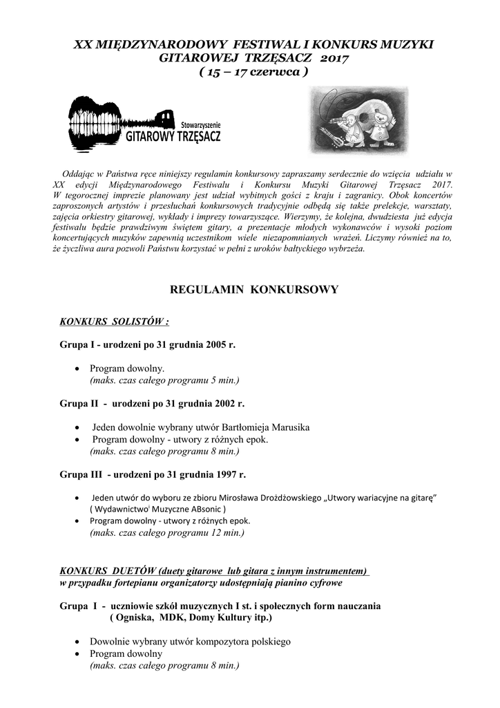 XX MIĘDZYNARODOWY FESTIWAL I KONKURS MUZYKI GITAROWEJ TRZĘSACZ 2017 ( 15 – 17 czerwca ) Oddając w Państwa ręce niniejszy regulamin konkursowy zapraszamy serdecznie do wzięcia udziału w XX edycji Międzynarodowego Festiwalu i Konkursu Muzyki Gitarowej Trzęsacz 2017. W tegorocznej imprezie planowany jest udział wybitnych gości z kraju i zagranicy. Obok koncertów zaproszonych artystów i przesłuchań konkursowych tradycyjnie odbędą się także prelekcje, warsztaty, zajęcia orkiestry gitarowej, wykłady i imprezy towarzyszące. Wierzymy, że kolejna, dwudziesta już edycja festiwalu będzie prawdziwym świętem gitary, a prezentacje młodych wykonawców i wysoki poziom koncertujących muzyków zapewnią uczestnikom wiele niezapomnianych wrażeń. Liczymy również na to, że życzliwa aura pozwoli Państwu korzystać w pełni z uroków bałtyckiego wybrzeża. REGULAMIN KONKURSOWY KONKURS SOLISTÓW : Grupa I - urodzeni po 31 grudnia 2005 r. Program dowolny. (maks. czas całego programu 5 min.) Grupa II - urodzeni po 31 grudnia 2002 r. Jeden dowolnie wybrany utwór Bartłomieja Marusika Program dowolny - utwory z różnych epok. (maks. czas całego programu 8 min.) Grupa III - urodzeni po 31 grudnia 1997 r. Jeden utwór do wyboru ze zbioru Mirosława Drożdżowskiego „Utwory wariacyjne na gitarę” ( Wydawnictwoi Muzyczne ABsonic ) Program dowolny - utwory z różnych epok. (maks. czas całego programu 12 min.) KONKURS DUETÓW (duety gitarowe lub gitara z innym instrumentem) w przypadku fortepianu organizatorzy udostępniają pianino cyfrowe Grupa I - uczniowie szkół muzycznych I st. i społecznych form nauczania ( Ogniska, MDK, Domy Kultury itp.) Dowolnie wybrany utwór kompozytora polskiego Program dowolny (maks. czas całego programu 8 min.) Grupa II - uczniowie szkół muzycznych II st. Dowolnie wybrany utwór kompozytora polskiego Program dowolny (maks. czas całego programu 12 min.) 1. Program dla solistów należy wykonać z pamięci ( nie dotyczy duetów ). 2. Przesłuchania konkursowe oceniać będzie międzynarodowe Jury złożone z zaproszonych gości festiwalowych. Decyzje Jury są ostateczne. 3. Uczestnicy konkursu mają obowiązek ( na ewentualne życzenie Jury ) udostępnić komisji nuty wykonywanych utworów. 4. Przesłuchania konkursowe są otwarte dla publiczności. 5. Wszyscy wykonawcy otrzymują dyplomy uczestnictwa, a laureaci nagrody i wyróżnienia. i