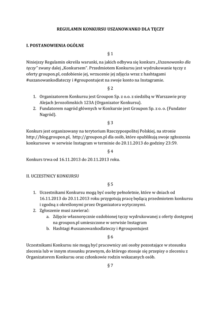 REGULAMIN KONKURSU USZANOWANKO DLA TĘCZY I. POSTANOWIENIA OGÓLNE §1 Niniejszy Regulamin określa warunki, na jakich odbywa się konkurs „Uszanowanko dla tęczy” zwany dalej „Konkursem”. Przedmiotem Konkursu jest wydrukowanie tęczy z oferty groupon.pl, ozdobienie jej, wrzucenie jej zdjęcia wraz z hashtagami #uszanowankodlateczy i #groupontujest na swoje konto na Instagramie. §2 1. Organizatorem Konkursu jest Groupon Sp. z o.o. z siedzibą w Warszawie przy Alejach Jerozolimskich 123A (Organizator Konkursu). 2. Fundatorem nagród głównych w Konkursie jest Groupon Sp. z o. o. (Fundator Nagród). §3 Konkurs jest organizowany na terytorium Rzeczypospolitej Polskiej, na stronie http://blog.groupon.pl, http://groupon.pl dla osób, które opublikują swoje zgłoszenia konkursowe w serwisie Instagram w terminie do 20.11.2013 do godziny 23:59. §4 Konkurs trwa od 16.11.2013 do 20.11.2013 roku. II. UCZESTNICY KONKURSU §5 1. Uczestnikami Konkursu mogą być osoby pełnoletnie, które w dniach od 16.11.2013 do 20.11.2013 roku przygotują pracę będącą przedmiotem konkursu i zgodną z określonymi przez Organizatora wytycznymi. 2. Zgłoszenie musi zawierać: a. Zdjęcie własnoręcznie ozdobionej tęczy wydrukowanej z oferty dostępnej na groupon.pl umieszczone w serwisie Instagram b. Hashtagi #uszanowankodlateczy i #groupontujest §6 Uczestnikami Konkursu nie mogą być pracownicy ani osoby pozostające w stosunku zlecenia lub w innym stosunku prawnym, do którego stosuje się przepisy o zleceniu z Organizatorem Konkursu oraz członkowie rodzin wskazanych osób. §7 Administratorem danych osobowych uczestników Konkursu jest Organizator. Dane osobowe przekazane Organizatorowi przez wyłonionych laureatów Konkursu będą przetwarzane w celu realizacji Konkursu. III. ZASADY I PRZEBIEG KONKURSU §8 1. Nad prawidłowym przebiegiem Konkursu i przyznaniem nagród czuwają Moderatorzy powołani przez Organizatora. 2. Zadaniem osób uczestniczących w konkursie jest wydrukowanie tęczy z oferty groupon.pl, ozdobienie jej, wrzucenie jej zdjęcia wraz z hashtagami #uszanowankodlateczy i #groupontujest na swoje konto na Instagramie. 3. Wyboru zwycięzców Konkursu dokonują samodzielnie i jednogłośnie Moderatorzy powołani przez Organizatora. 4. Moderatorzy konkursu wybiorą 13 prac, które wezmą udział w II etapie konkursu – głosowaniu użytkowników, które odbędzie się na stronie http://blog.groupon.pl. Głosowanie potrwa od 21.11.2013 do godziny 23:59 dnia 23.11.2013 roku 5. Ostateczne wyniki konkursu zostaną opublikowane na stronie http://blog.groupon.pl w dniu 24.09.2013 . §9 1. Aby przystąpić do Konkursu należy: a. zapoznać się z niniejszym Regulaminem Konkursu b. opublikować swoje zgłoszenie w serwisie Instagram zgodnie z zawartymi w regulaminie wytycznymi (patrz § 1 i § 5 niniejszego regulaminu) 2. Konkurs jest moderowany. Każde zgłoszenie, przed przystąpieniem do rywalizacji, musi zostać zaakceptowana przez moderatorów. Zgłoszenie pracy nie jest jednoznaczne z przyjęciem go do Konkursu. 3. Warunkiem udziału w Konkursie jest publikowanie zgłoszeń konkursowych w terminie od 16.11.2013 do 20.11.2013 do godz. 23.59 i jego akceptacja przez moderatorów. 4. Każdy z uczestników Konkursu może opublikować dowolną liczbę zgłoszeń. 5. Prawidłowe zgłoszenie konkursowe musi spełniać wszystkie warunki określone w § 5 pkt. 2 niniejszego regulaminu. Zgłoszenia nie spełniające tego wymogu formalnego będą odrzucane. 6. Przesyłając swoje zgłoszenie Uczestnik oświadcza i potwierdza, że przedstawiona praca jest jego własnością i została wykonana przez niego samego, oraz że przysługują prawa autorskie i prawa pokrewne do przedstawionej pracy, w tym prawo do wysyłania go na Konkurs. 7. Rozstrzygnięcie Konkursu (opublikowanie wyników) nastąpi 24.11.2013 roku. Wyniki Konkursu, wraz z informacją o sposobie odebrania nagród zostaną opublikowane również na stronie http://blog.groupon.pl. 8. Imiona i nazwiska laureatów (zgodnie z danymi udostępnionymi przez uczestników) zostaną opublikowane na stronie http://blog.groupon.pl. IV. NAGRODY § 10 1. W konkursie przewidziano 13 nagród w postaci: I miejsce: luksusowy weekendowy pobyt w Pałacu Wojanów II miejsce: 6 doładowań o wartości 200 zł na zakupy na groupon.pl III miejsce: 6 doładowań o wartości 100 zł na zakupy na groupon.pl 2. Fundatorem nagród jest: Groupon Sp. z o.o. V. POSTANOWIENIA KOŃCOWE § 11 1. Zgłoszenie uczestnictwa w Konkursie oznacza wyrażenie przez Uczestnika Konkursu zgody na zamieszczenie ich wizerunku, przesłanych prac oraz niektórych danych wymienionych w § 9 (w szczególności imienia i nazwiska) we wszystkich materiałach, niezależnie od formy ich wyrażenia, mających za przedmiot propagowanie Konkursu oraz relacje z jego przebiegu. Autorzy zgłoszeń z chwilą ich opublikowania Organizatorowi upoważniają go do korzystania z nich w zakresie i celu opisanym powyżej. Zgłoszenie uczestnictwa w konkursie oznacza również zgodę na przetwarzanie danych przez Groupon Sp. z o.o., Aleje Jerozolimskie 123A, 02-017 Warszawa dla celów realizacji niniejszego konkursu. 2. Uczestnik oświadcza, że przysługują mu wszelkie prawa autorskie i prawa pokrewne do zgłoszonej pracy konkursowej i nie jest ona obciążona prawami osób trzecich oraz jest uprawniony do rozporządzania nimi w zakresie i celu opisanym w § 11 pkt. 1. 3. Organizator zastrzega sobie prawo do zmiany zasad Konkursu nawet w trakcie jego trwania. Informacja o istotnych zmianach będzie umieszczona na stronie Groupon Polska w serwisie Facebook oraz blogu Organizatora. Zmiany wchodzą w życie z dniem ich ogłoszenia na stronach internetowych. 4. Organizator samodzielnie lub na wniosek innych użytkowników ma prawo usunąć film z Konkursu z powodu nieprzestrzegania zasad Regulaminu (w tym w szczególności, gdy zaistnieje podejrzenie, że naruszono prawa autorskie i prawa pokrewne osób 