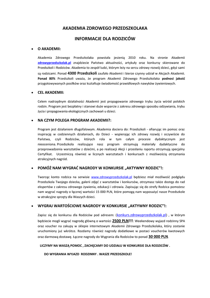 AKADEMIA ZDROWEGO PRZEDSZKOLAKA INFORMACJE DLA RODZICÓW O AKADEMII: Akademia Zdrowego Przedszkolaka powstała jesienią 2010 roku. Na stronie Akademii zdrowyprzedszkolak.pl znajdziecie Państwo aktualności, artykuły oraz konkursy skierowane do Przedszkoli i Rodziców. Akademia to zespół ludzi, którym leży na sercu zdrowy rozwój dzieci, gdyż sami są rodzicami. Ponad 4300 Przedszkoli zaufało Akademii i bierze czynny udział w Akcjach Akademii. Ponad 80% Przedszkoli uważa, że program Akademii Zdrowego Przedszkolaka podnosi jakość przygotowywanych posiłków oraz kształtuje świadomość prawidłowych nawyków żywieniowych. CEL AKADEMII: Celem nadrzędnym działalności Akademii jest propagowanie zdrowego trybu życia wśród polskich rodzin. Program jest bezpłatny i stanowi duże wsparcie z zakresu zdrowego sposobu odżywiania, trybu życia i propagowania ekologicznych zachowań u dzieci. NA CZYM POLEGA PROGRAM AKADEMII?: Program jest działaniem długofalowym. Akademia dociera do: Przedszkoli - ofiarując im pomoc oraz inspirację w codziennych działaniach, do Dzieci - wspierając ich zdrowy rozwój i oczywiście do Państwa, czyli Rodziców, których rola w tym całym procesie dydaktycznym jest nieoceniona. Przedszkola realizujące nasz program otrzymują materiały dydaktyczne do przeprowadzenia warsztatów z dziećmi, a po realizacji Akcji i przesłaniu raportu otrzymują specjalny Certyfikat. Uczestniczą również w licznych warsztatach i konkursach z możliwością otrzymania atrakcyjnych nagród. POMÓŻ NAM WYGRAĆ NAGRODY W KONKURSIE „AKTYWNY RODZIC”!: Tworząc konto rodzica na serwisie www.zdrowyprzedszkolak.pl będziesz miał możliwość podglądu Przedszkola Twojego dziecka, galerii zdjęć z warsztatów i konkursów, otrzymasz także dostęp do rad ekspertów z zakresu zdrowego żywienia, edukacji i zdrowia. Zapisując się do strefy Rodzica pomożesz nam wygrać nagrody o łącznej wartości 15 000 PLN, które pomogą nam wyposażyć nasze Przedszkole w atrakcyjne sprzęty dla Waszych dzieci. WYGRAJ WARTOŚCIOWE NAGRODY W KONKURSIE „AKTYWNY RODZIC”!: Zapisz się do konkursu dla Rodziców pod adresem: ( konkurs.zdrowyprzedszkolak.pl) , w którym będziecie mogli wygrać nagrodę główną o wartości 2500 PLN!!!: Weekendowy wyjazd rodzinny SPA oraz voucher na zakupy w sklepie internetowym Akademii Zdrowego Przedszkolaka, który zostanie uruchomiony już wkrótce. Rozdamy również nagrody dodatkowe w postaci voucherów kwotowych oraz darmową dostawę. Łączne nagrody do Wygrania dla Rodziców to ponad 30 000 PLN. LICZYMY NA WASZĄ POMOC , ZACHĘCAMY DO UDZIAŁU W KONKURSIE DLA RODZICÓW . DO WYGRANIA WYJAZD RODZINNY . WASZE PRZEDSZKOLE!