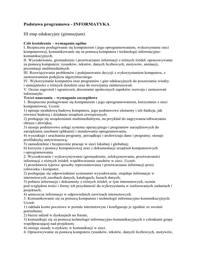 Podstawa programowa - INFORMATYKA III etap edukacyjny (gimnazjum) Cele kształcenia – wymagania ogólne I. Bezpieczne posługiwanie się komputerem i jego oprogramowaniem, wykorzystanie sieci komputerowej; komunikowanie się za pomocą komputera i technologii informacyjnokomunikacyjnych. II. Wyszukiwanie, gromadzenie i przetwarzanie informacji z różnych źródeł; opracowywanie za pomocą komputera: rysunków, tekstów, danych liczbowych, motywów, animacji, prezentacji multimedialnych. III. Rozwiązywanie problemów i podejmowanie decyzji z wykorzystaniem komputera, z zastosowaniem podejścia algorytmicznego. IV. Wykorzystanie komputera oraz programów i gier edukacyjnych do poszerzania wiedzy i umiejętności z różnych dziedzin oraz do rozwijania zainteresowań. V. Ocena zagrożeń i ograniczeń, docenianie społecznych aspektów rozwoju i zastosowań informatyki. Treści nauczania – wymagania szczegółowe 1. Bezpieczne posługiwanie się komputerem i jego oprogramowaniem, korzystanie z sieci komputerowej. Uczeń: 1) opisuje modułową budowę komputera, jego podstawowe elementy i ich funkcje, jak również budowę i działanie urządzeń zewnętrznych; 2) posługuje się urządzeniami multimedialnymi, na przykład do nagrywania/odtwarzania obrazu i dźwięku; 3) stosuje podstawowe usługi systemu operacyjnego i programów narzędziowych do zarządzania zasobami (plikami) i instalowania oprogramowania; 4) wyszukuje i uruchamia programy, porządkuje i archiwizuje dane i programy; stosuje profilaktykę antywirusową; 5) samodzielnie i bezpiecznie pracuje w sieci lokalnej i globalnej; 6) korzysta z pomocy komputerowej oraz z dokumentacji urządzeń komputerowych i oprogramowania. 2. Wyszukiwanie i wykorzystywanie (gromadzenie, selekcjonowanie, przetwarzanie) informacji z różnych źródeł; współtworzenie zasobów w sieci. Uczeń: 1) przedstawia typowe sposoby reprezentowania i przetwarzania informacji przez człowieka i komputer; 2) posługując się odpowiednimi systemami wyszukiwania, znajduje informacje w internetowych zasobach danych, katalogach, bazach danych; 3) pobiera informacje i dokumenty z różnych źródeł, w tym internetowych, ocenia pod względem treści i formy ich przydatność do wykorzystania w realizowanych zadaniach i projektach; 4) umieszcza informacje w odpowiednich serwisach internetowych. 3. Komunikowanie się za pomocą komputera i technologii informacyjno-komunikacyjnych. Uczeń: 1) zakłada konto pocztowe w portalu internetowym i konfiguruje je zgodnie ze swoimi potrzebami; 2) bierze udział w dyskusjach na forum; 3) komunikuje się za pomocą technologii informacyjno-komunikacyjnych z członkami grupy współpracującej nad projektem; 4) stosuje zasady n-etykiety w komunikacji w sieci. 4. Opracowywanie za pomocą komputera rysunków, tekstów, danych liczbowych, motywów, animacji, prezentacji multimedialnych. Uczeń: 1) przy użyciu edytora grafiki tworzy kompozycje z figur, fragmentów rysunków i zdjęć, umieszcza napisy na rysunkach, tworzy animacje, przekształca formaty plików graficznych; 2) przy użyciu edytora tekstu tworzy kilkunastostronicowe publikacje, z nagłówkiem i stopką, przypisami, grafiką, tabelami itp., formatuje tekst w kolumnach, opracowuje dokumenty tekstowe o różnym przeznaczeniu; 3) wykorzystuje arkusz kalkulacyjny do rozwiązywania zadań rachunkowych z programu nauczania gimnazjum (na przykład z matematyki lub fizyki) i z codziennego życia (na przykład planowanie wydatków), posługuje się przy tym adresami bezwzględnymi, względnymi i mieszanymi; 4) stosuje arkusz kalkulacyjny do gromadzenia danych i przedstawiania ich w postaci graficznej, z wykorzystaniem odpowiednich typów wykresów; 5) tworzy prostą bazę danych w postaci jednej tabeli i wykonuje na niej podstawowe operacje bazodanowe; 6) tworzy dokumenty zawierające różne obiekty (np: tekst, grafikę, tabele, wykresy itp.) pobrane z różnych programów i źródeł; 7) tworzy i przedstawia prezentację z wykorzystaniem różnych elementów multimedialnych, graficznych, tekstowych, filmowych i dźwiękowych własnych lub pobranych z innych źródeł; 8) tworzy prostą stronę internetową zawierającą: tekst, grafikę, elementy aktywne, linki, korzystając ewentualnie z odpowiedniego edytora stron, wyjaśnia znaczenie podstawowych poleceń języka HTML. 5. Rozwiązywanie problemów i podejmowanie decyzji z wykorzystaniem komputera, stosowanie podejścia algorytmicznego. Uczeń: 1) wyjaśnia pojęcie algorytmu, podaje odpowiednie przykłady algorytmów rozwiązywania różnych problemów; 2) formułuje ścisły opis prostej sytuacji problemowej, analizuje ją i przedstawia rozwiązanie w postaci algorytmicznej; 3) stosuje arkusz kalkulacyjny do rozwiązywania prostych problemów algorytmicznych; 4) opisuje sposób znajdowania wybranego elementu w zbiorze nieuporządkowanym i uporządkowanym, opisuje algorytm porządkowania zbioru elementów; 5) wykonuje wybrane algorytmy za pomocą komputera. 6. Wykorzystywanie komputera oraz programów i gier edukacyjnych do poszerzania wiedzy i umiejętności z różnych dziedzin. Uczeń: 1) wykorzystuje programy komputerowe, w tym edukacyjne, wspomagające i wzbogacające naukę różnych przedmiotów; 2) wykorzystuje programy komputerowe, np. arkusz kalkulacyjny, do analizy wyników eksperymentów, programy specjalnego przeznaczenia, programy edukacyjne; 3) posługuje się programami komputerowymi, służącymi do tworzenia modeli zjawisk i ich symulacji, takich jak zjawiska: fizyczne, chemiczne, biologiczne, korzysta z internetowych map; 4) przygotowuje za pomocą odpowiednich programów zestawienia danych i sprawozdania na lekcje z różnych przedmiotów. 7. Wykorzystywanie komputera i technologii informacyjno-komunikacyjnych do rozwijania zainteresowań; opisywanie innych zastosowań informatyki; ocena zagrożeń i ograniczeń, aspekty społeczne rozwoju i zastosowań informatyki. Uczeń: 1) opisuje wybrane