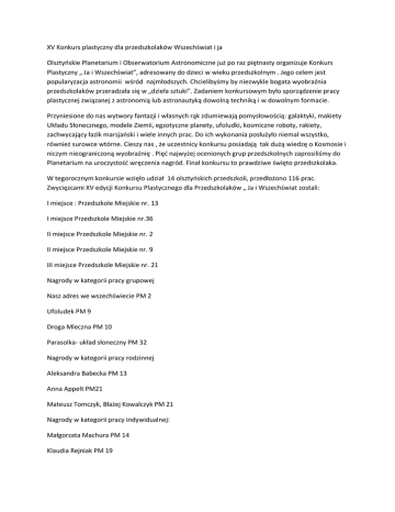 XV Konkurs plastyczny dla przedszkolaków Wszechświat i ja Olsztyoskie Planetarium i Obserwatorium Astronomiczne już po raz piętnasty organizuje Konkurs Plastyczny „ Ja i Wszechświat”, adresowany do dzieci w wieku przedszkolnym . Jego celem jest popularyzacja astronomii wśród najmłodszych. Chcielibyśmy by niezwykle bogata wyobraźnia przedszkolaków przeradzała się w „dzieła sztuki”. Zadaniem konkursowym było sporządzenie pracy plastycznej związanej z astronomią lub astronautyką dowolną techniką i w dowolnym formacie. Przyniesione do nas wytwory fantazji i własnych rąk zdumiewają pomysłowością: galaktyki, makiety Układu Słonecznego, modele Ziemii, egzotyczne planety, ufoludki, kosmiczne roboty, rakiety, zachwycający łazik marsjaoski i wiele innych prac. Do ich wykonania posłużyło niemal wszystko, również surowce wtórne. Cieszy nas , że uczestnicy konkursu posiadają tak dużą wiedzę o Kosmosie i niczym nieograniczoną wyobraźnię . Pięd najwyżej ocenionych grup przedszkolnych zaprosiliśmy do Planetarium na uroczystośd wręczenia nagród. Finał konkursu to prawdziwe święto przedszkolaka. W tegorocznym konkursie wzięło udział 14 olsztyoskich przedszkoli, przedłożono 116 prac. Zwycięzcami XV edycji Konkursu Plastycznego dla Przedszkolaków „ Ja i Wszechświat zostali: I miejsce : Przedszkole Miejskie nr. 13 I miejsce Przedszkole Miejskie nr.36 II miejsce Przedszkole Miejskie nr. 2 II miejsce Przedszkole Miejskie nr. 9 III miejsce Przedszkole Miejskie nr. 21 Nagrody w kategorii pracy grupowej Nasz adres we wszechświecie PM 2 Ufoludek PM 9 Droga Mleczna PM 10 Parasolka- układ słoneczny PM 32 Nagrody w kategorii pracy rodzinnej Aleksandra Babecka PM 13 Anna Appelt PM21 Mateusz Tomczyk, Błażej Kowalczyk PM 21 Nagrody w kategorii pracy indywidualnej: Małgorzata Machura PM 14 Klaudia Rejniak PM 19 Jagoda Bałabaoska PM 10 Wyróżnienia: Dominika Herman PM 39 Maja Michniewicz, Karol Michniewicz PM 39 Basia Zgódka PM39 Filip Miakisz PM 39 Dominika Ryszka PM 21 Ania Grzyb PM 10