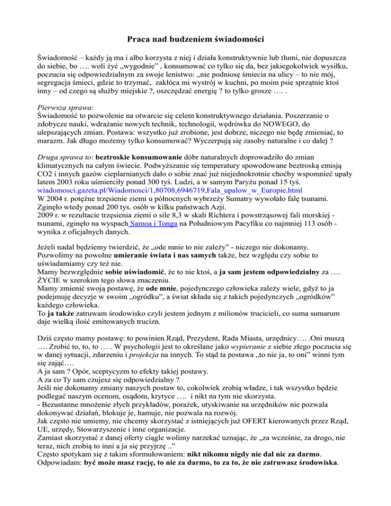Praca nad budzeniem świadomości Świadomość – każdy ją ma i albo korzysta z niej i działa konstruktywnie lub tłumi, nie dopuszcza do siebie, bo …. woli żyć „wygodnie” , konsumować co tylko się da, bez jakiegokolwiek wysiłku, poczucia się odpowiedzialnym za swoje lenistwo: „nie podniosę śmiecia na ulicy – to nie mój, segregacja śmieci, gdzie to trzymać, zakłóca mi wystrój w kuchni, po moim psie sprzątnie ktoś inny – od czego są służby miejskie ?, oszczędzać energię ? to tylko grosze …. . Pierwsza sprawa: Świadomość to pozwolenie na otwarcie się celem konstruktywnego działania. Poszerzanie o zdobycze nauki, wdrażanie nowych technik, technologii, wędrówka do NOWEGO, do ulepszających zmian. Postawa: wszystko już zrobione, jest dobrze, niczego nie będę zmieniać, to marazm. Jak długo możemy tylko konsumować? Wyczerpują się zasoby naturalne i co dalej ? Druga sprawa to: beztroskie konsumowanie dóbr naturalnych doprowadziło do zmian klimatycznych na całym świecie. Podwyższanie się temperatury spowodowane beztroską emisją CO2 i innych gazów cieplarnianych dało o sobie znać już niejednokrotnie choćby wspomnieć upały latem 2003 roku uśmierciły ponad 300 tyś. Ludzi, a w samym Paryżu ponad 15 tyś. wiadomosci.gazeta.pl/Wiadomosci/1,80708,6946719,Fala_upalow_w_Europie.html W 2004 r. potężne trzęsienie ziemi u północnych wybrzeży Sumatry wywołało falę tsunami. Zginęło wtedy ponad 200 tys. osób w kilku państwach Azji. 2009 r. w rezultacie trzęsienia ziemi o sile 8,3 w skali Richtera i powstrząsowej fali morskiej tsunami, zginęło na wyspach Samoa i Tonga na Południowym Pacyfiku co najmniej 113 osób wynika z oficjalnych danych. Jeżeli nadal będziemy twierdzić, że „ode mnie to nie zależy” - niczego nie dokonamy. Pozwolimy na powolne umieranie świata i nas samych także, bez względu czy sobie to uświadamiamy czy też nie. Mamy bezwzględnie sobie uświadomić, że to nie ktoś, a ja sam jestem odpowiedzialny za …. ŻYCIE w szerokim tego słowa znaczeniu. Mamy zmienić swoją postawę, że ode mnie, pojedynczego człowieka zależy wiele, gdyż to ja podejmuję decyzje w swoim „ogródku”, a świat składa się z takich pojedynczych „ogródków” każdego człowieka. To ja także zatruwam środowisko czyli jestem jednym z milionów trucicieli, co suma sumarum daje wielką ilość emitowanych trucizn. Dziś często mamy postawę: to powinien Rząd, Prezydent, Rada Miasta, urzędnicy…. .Oni muszą …. Zrobić to, to, to … . W psychologii jest to określane jako wypieranie z siebie złego poczucia się w danej sytuacji, zdarzeniu i projekcja na innych. To stąd ta postawa „to nie ja, to oni” winni tym się zająć…. A ja sam ? Opór, sceptycyzm to efekty takiej postawy. A za co Ty sam czujesz się odpowiedzialny ? Jeśli nie dokonamy zmiany naszych postaw to, cokolwiek zrobią władze, i tak wszystko będzie podlegać naszym ocenom, osądom, krytyce …. i nikt na tym nie skorzysta. - Bezustanne mnożenie złych przykładów, porażek, utyskiwanie na urzędników nie pozwala dokonywać działań, blokuje je, hamuje, nie pozwala na rozwój. Jak często nie umiemy, nie chcemy skorzystać z istniejących już OFERT kierowanych przez Rząd, UE, urzędy, Stowarzyszenie i inne organizacje. Zamiast skorzystać z danej oferty ciągle wolimy narzekać uznając, że „za wcześnie, za drogo, nie teraz, nich zrobią to inni a ja się przyjrzę ..” Często spotykam się z takim sformułowaniem: nikt nikomu nigdy nie dał nic za darmo. Odpowiadam: być może masz rację, to nie za darmo, to za to, że nie zatruwasz środowiska. No i jest to niezrozumiałe!!? Opór, sceptycyzm i brak przyzwolenia na zadanie sobie trudu wzięły górę. Oczekiwania nasze to: Zmiana systemu gospodarczego na model oparty na tzw. „zrównoważonym rozwoju”, który preferuje: - najlepsze rozwiązania, także najtańsze ale uwzględniające pełny rachunek wszystkich kosztów tzw. wewnętrznych i zewnętrznych np. środowiskowych; - najbardziej dostępne dla człowieka, powodujące trwały wzrost gospodarczy oparty na poszanowaniu zasad konkurencji, praw człowieka, konsumenta, społeczeństwie obywatelskim, autentycznej- nie przedstawicielskiej, demokracji. No cóż, wiele już w tym zakresie władze robią, a społeczeństwo co ? Tłum gapiów, kibiców, sędziów” …… ? A Kim Ty Jesteś ? W którym „klubie” grasz ? Mniejsze zużycie energii elektrycznej to oszczędzanie środowiska, to także mniejsze rachunki za prąd. Większość osób może bezproblemowo zmniejszyć zużycie energii elektrycznej w swoim mieszkaniu nie rezygnując z komfortu. Czy naprawdę musimy trzymać ładowarkę telefonu komórkowego w gniazdku? To tylko jeden przykład… . Wymiana żarówek na energooszczędne, wyłącznie tzw. czuwania poprzez zastosowanie listwy z wyłącznikiem i wiele innych drobnych zmian. Oczywiście najpierw trzeba zainwestować i dość wymierny efekt nastąpi po pół roku, kiedy otrzymamy nowe rozliczenie zużycia energii. Może to niewielkie pieniądze, ale ziarnko do ziarnka… Mamy już wiele innych możliwości np. możemy bezproblemowo zmienić dostawcę energii elektrycznej – tak, jak dziś możemy już przenieść swój numer do innej telefonii komórkowej składając tylko pisemny wniosek w tej sprawie, tak możemy to zrobić. Musimy wiedzieć, że obecne przepisy zapewniają pomoc finansową Państwa i stwarzają warunki do wykorzystania nowych technologii i technik przez mieszkańców domków jednorodzinnych, wspólnot mieszkaniowych, przedsiębiorców celem dokonania zmiany źródła energii cieplnej, co daje dużą energooszczędność i znacznie zmniejsza emisję CO2 i innych gazów cieplarnianych do atmosfery.