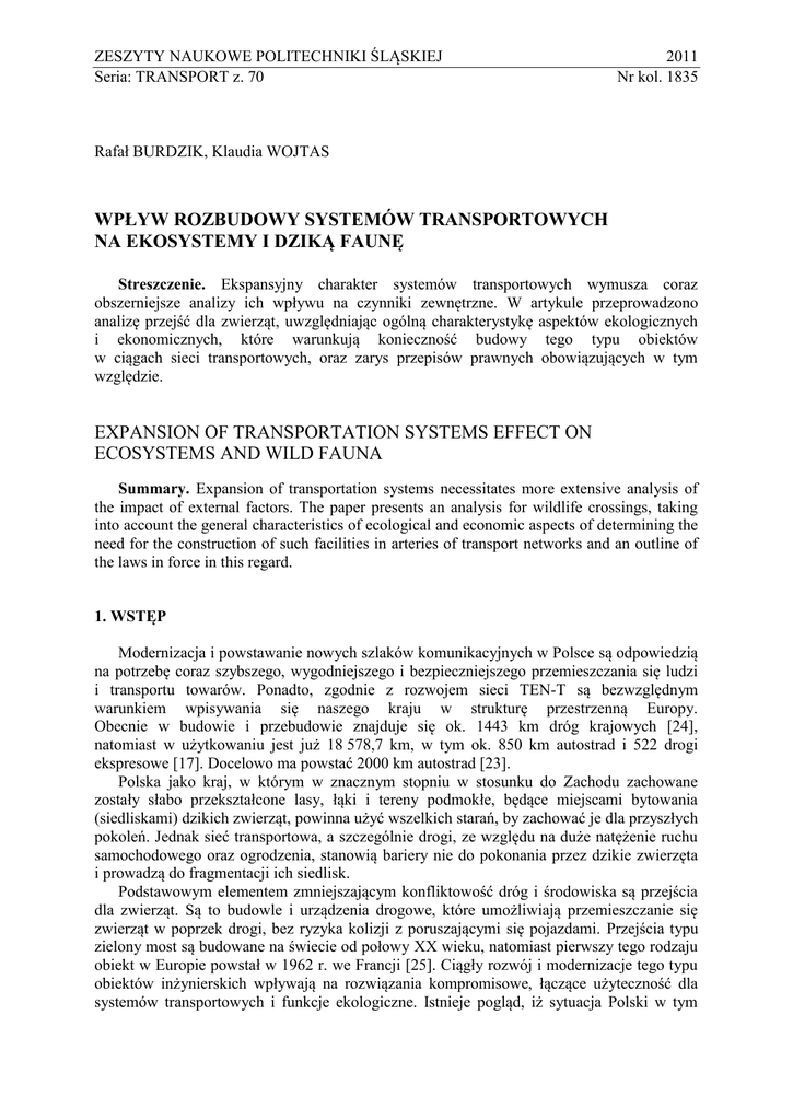 ZESZYTY NAUKOWE POLITECHNIKI ŚLĄSKIEJ Seria: TRANSPORT z. 70 2011 Nr kol. 1835 Rafał BURDZIK, Klaudia WOJTAS WPŁYW ROZBUDOWY SYSTEMÓW TRANSPORTOWYCH NA EKOSYSTEMY I DZIKĄ FAUNĘ Streszczenie. Ekspansyjny charakter systemów transportowych wymusza coraz obszerniejsze analizy ich wpływu na czynniki zewnętrzne. W artykule przeprowadzono analizę przejść dla zwierząt, uwzględniając ogólną charakterystykę aspektów ekologicznych i ekonomicznych, które warunkują konieczność budowy tego typu obiektów w ciągach sieci transportowych, oraz zarys przepisów prawnych obowiązujących w tym względzie. EXPANSION OF TRANSPORTATION SYSTEMS EFFECT ON ECOSYSTEMS AND WILD FAUNA Summary. Expansion of transportation systems necessitates more extensive analysis of the impact of external factors. The paper presents an analysis for wildlife crossings, taking into account the general characteristics of ecological and economic aspects of determining the need for the construction of such facilities in arteries of transport networks and an outline of the laws in force in this regard. 1. WSTĘP Modernizacja i powstawanie nowych szlaków komunikacyjnych w Polsce są odpowiedzią na potrzebę coraz szybszego, wygodniejszego i bezpieczniejszego przemieszczania się ludzi i transportu towarów. Ponadto, zgodnie z rozwojem sieci TEN-T są bezwzględnym warunkiem wpisywania się naszego kraju w strukturę przestrzenną Europy. Obecnie w budowie i przebudowie znajduje się ok. 1443 km dróg krajowych [24], natomiast w użytkowaniu jest już 18 578,7 km, w tym ok. 850 km autostrad i 522 drogi ekspresowe [17]. Docelowo ma powstać 2000 km autostrad [23]. Polska jako kraj, w którym w znacznym stopniu w stosunku do Zachodu zachowane zostały słabo przekształcone lasy, łąki i tereny podmokłe, będące miejscami bytowania (siedliskami) dzikich zwierząt, powinna użyć wszelkich starań, by zachować je dla przyszłych pokoleń. Jednak sieć transportowa, a szczególnie drogi, ze względu na duże natężenie ruchu samochodowego oraz ogrodzenia, stanowią bariery nie do pokonania przez dzikie zwierzęta i prowadzą do fragmentacji ich siedlisk. Podstawowym elementem zmniejszającym konfliktowość dróg i środowiska są przejścia dla zwierząt. Są to budowle i urządzenia drogowe, które umożliwiają przemieszczanie się zwierząt w poprzek drogi, bez ryzyka kolizji z poruszającymi się pojazdami. Przejścia typu zielony most są budowane na świecie od połowy XX wieku, natomiast pierwszy tego rodzaju obiekt w Europie powstał w 1962 r. we Francji [25]. Ciągły rozwój i modernizacje tego typu obiektów inżynierskich wpływają na rozwiązania kompromisowe, łączące użyteczność dla systemów transportowych i funkcje ekologiczne. Istnieje pogląd, iż sytuacja Polski w tym 22 R. Burdzik, K. Wojtas zakresie wymaga jeszcze wielu zintegrowanych działań, gdyż nadal większość przejść jest mało efektywna z uwagi na nieodpowiednie parametry. Celowe jest zatem prowadzenie edukacji społecznej w dziedzinie ochrony dzikiej fauny w kontekście inwestycji transportowych. 2. WPŁYW INWESTYCJI DROGOWYCH NA DZIKO ŻYJĄJCE ZWIERZĘTA Oprócz pozytywnych aspektów ekonomicznych i społecznych budowa lub rozbudowa dróg mogą powodować wiele negatywnych oddziaływań na środowisko w bezpośrednim otoczeniu drogi. W przypadku zwierząt ujemny wpływ inwestycji drogowych dzieli się na: bezpośredni (śmiertelność zwierząt w wyniku kolizji z pojazdami i utrudnienia lub uniemożliwienie przemieszczania się zwierząt przez drogę) oraz pośredni (przerwanie ciągłości korytarzy migracyjnych i zanieczyszczenie bądź zniszczenie siedlisk fauny) [15]. Populacje zwierząt dziko żyjących, czyli ogół osobników poszczególnych gatunków na danym terenie, po wybudowaniu inwestycji liniowej w wyniku tzw. efektu cięcia [7], są niejednokrotnie zmuszone do opuszczenia swoich terytoriów. Ponadto, wiele cennych gatunków dzikich zwierząt, takich jak: łosie, wilki i rysie, charakteryzuje się wysoką skłonnością do odbywania dalekich wędrówek, nawet do 350 km [8]. W wyniku tego przemieszczania często dochodzi do kolizji z pojazdami mechanicznymi. Europejskie badania i prognozy dotyczące liczby ginących na drogach zwierząt wskazują na wzrost tego zjawiska. W Szwecji, według statystyk policyjnych, ginie na rok 4,5 tys. łosi na rok i 24 tys. saren. W Hiszpanii minimalną liczbę kręgowców (ssaków, ptaków, gadów i płazów) zabitych na drogach ocenia się na 10 mln rocznie, co daje 31 osobników/km [1]. W Belgii liczba ta oscyluje wokół 4 mln, a w Danii ginie 1,5 mln ssaków, 3,7 mln ptaków i 3 mln płazów [20]. W Polsce, według statystyk policyjnych z 2009 roku w wyniku najechania na zwierzę zarejestrowano 177 wypadków drogowych, co stanowi około 0,4% ogółu wszystkich wypadków [21]. Naukowcy sądzą jednak, iż tych zdarzeń w rzeczywistości jest co najmniej 10 razy więcej, tylko nie są zgłaszane [20]. Największa śmiertelność zwierząt występuje na drogach krajowych i wojewódzkich [1]. Szczegółowe dane przedstawiono na rys. 1. Rys. 1. Procentowy udział śmiertelności dużych oraz średnich i małych ssaków na różnych klasach dróg Fig. 1. The percentage of death rate of large and medium-sized and small mammals to different classes of roads Bardzo istotnymi negatywnymi dla zwierząt konsekwencjami rozwoju infrastruktury drogowej są: powstanie bariery ekologicznej, czyli uniemożliwienie przemieszczania się zwierząt oraz fragmentacja obszarów leśnych [12]. Szacuje się, iż ok. 20% dróg krajowych stanowi całkowicie nieprzekraczalną barierę, ponieważ średnie dobowe natężenie ruchu przekracza na nich 10 tys. poj./dobę, co stanowi tzw. barierę psychofizyczną [1]. Analizując Wpływ rozbudowy systemów transportowych na ekosystemy i dziką faunę 23 rysunek 2 można stwierdzić, że przy natężeniu ruchu, które wynosi do 2 500 poj./dobę ok. 5