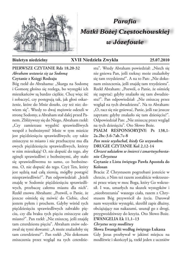 Parafia Matki Bożej Częstochowskiej w Józefowie Biuletyn niedzielny XVII Niedziela Zwykła PIERWSZE CZYTANIE Rdz 18,20-32 Abraham wstawia się za Sodomą Czytanie z Księgi Rodzaju Bóg rzekł do Abrahama: „Skarga na Sodomę i Gomorę głośno się rozlega, bo występki ich mieszkańców są bardzo ciężkie. Chcę więc iść i zobaczyć, czy postępują tak, jak głosi oskarżenie, które do Mnie doszło, czy też nie; dowiem się”. Wtedy to dwaj mężowie odeszli w stronę Sodomy, a Abraham stał dalej przed Panem. Zbliżywszy się do Niego, Abraham rzekł: „Czy zamierzasz wygubić sprawiedliwych wespół z bezbożnymi? Może w tym mieście jest pięćdziesięciu sprawiedliwych; czy także zniszczysz to miasto i nie przebaczysz mu dla owych pięćdziesięciu sprawiedliwych, którzy w nim mieszkają? O, nie dopuść do tego, aby zginęli sprawiedliwi z bezbożnymi, aby stało się sprawiedliwemu to samo, co bezbożnemu. O, nie dopuść do tego. Czyż Ten, który jest sędzią nad całą ziemią, mógłby postąpić niesprawiedliwie?”. Pan odpowiedział: „Jeżeli znajdę w Sodomie pięćdziesięciu sprawiedliwych, przebaczę całemu miastu dla nich”. Rzekł znowu Abraham: „Pozwól, o Panie, że jeszcze ośmielę się mówić do Ciebie, choć jestem pyłem i prochem. Gdyby wśród tych pięćdziesięciu sprawiedliwych zabrakło pięciu, czy dla braku tych pięciu zniszczysz całe miasto?”. Pan rzekł: „Nie zniszczę, jeśli znajdę tam czterdziestu pięciu”. Abraham znów odezwał się tymi słowami: „A może znalazłoby się tam czterdziestu?”. Pan rzekł: „Nie dokonam zniszczenia przez wzgląd na tych czterdzie- 25.07.2010 stu”. Wtedy Abraham powiedział: „Niech się nie gniewa Pan, jeśli rzeknę: może znalazłoby się tam trzydziestu!”. A na to Pan: „Nie dokonam zniszczenia, jeśli znajdę tam trzydziestu”. Rzekł Abraham: „Pozwól, o Panie, że ośmielę się zapytać: gdyby znalazło się tam dwudziestu?”. Pan odpowiedział: „Nie zniszczę przez wzgląd na tych dwudziestu”. Na to Abraham: „O, racz się nie gniewać, Panie, jeśli raz jeszcze zapytam: gdyby znalazło się tam dziesięciu?”. Odpowiedział Pan: „Nie zniszczę przez wzgląd na tych dziesięciu”. Oto Słowo Boże. PSALM RESPONSORYJNY: Ps 138,12a.2bc-3.6-7ab.7c-8 Pan mnie wysłuchał, kiedy Go wzywałem. DRUGIE CZYTANIE Kol 2,12-14 Chrzest udziałem w śmierci i zmartwychwstaniu Chrystusa Czytanie z Listu świętego Pawła Apostoła do Kolosan Bracia: Z Chrystusem pogrzebani jesteście w chrzcie, z Nim też razem zostaliście wskrzeszeni przez wiarę w moc Boga, który Go wskrzesił. I was, umarłych na skutek występków i „nieobrzezania” waszego ciała, razem z Chrystusem Bóg przywrócił do życia. Darował nam wszystkie występki, skreślił zapis dłużny, obciążający nas nakazami, usunął go z drogi, przygwoździwszy do krzyża. Oto Słowo Boże. EWANGELIA Łk 11,1–13 Chrystus uczy modlitwy Słowa Ewangelii według świętego Łukasza Gdy Jezus przebywał w jakimś miejscu na modlitwie i skończył ją, rzekł jeden z uczniów do Niego: „Panie, naucz nas się modlić, jak i Jan nauczył swoich uczniów”. A On rzekł do nich: „Kiedy się modlicie, mówcie: Ojcze, niech się święci Twoje imię; niech przyjdzie Twoje królestwo. Naszego chleba powszedniego dawaj nam na każdy dzień, i przebacz nam nasze grzechy, bo i my przebaczymy każdemu, kto nam zawini; i nie dopuść, byśmy ulegli pokusie”. Dalej mówił do nich: „Ktoś z was, mając przyjaciela, pójdzie do niego o północy i powie mu: »Przyjacielu, użycz mi trzech chlebów, bo mój przyjaciel przybył do mnie z drogi, a nie mam co mu podać«. Lecz tamten odpowie z wewnątrz: »Nie naprzykrzaj mi się! Drzwi są już zamknięte i moje dzieci leżą ze mną w łóżku. Nie mogę wstać i dać tobie«. Mówię wam: Chociażby nie wstał i nie dał z tego powodu, że jest jego przyjacielem, to z powodu jego natręctwa wstanie i da mu, ile potrzebuje. I Ja wam powiadam: Proście, a będzie wam dane; szukajcie, a znajdziecie; kołaczcie, a otworzą wam. Każdy bowiem, kto prosi, otrzymuje; kto szuka, znajduje; a kołaczącemu otworzą. Jeżeli którego z was, ojców, syn poprosi o chleb, czy poda mu kamień? Lub też gdy prosi o jajko, czy poda mu skorpiona? Jeśli więc wy, choć źli jesteście, umiecie dawać dobre dary swoim dzieciom, o ileż bardziej Ojciec z nieba da Ducha Świętego tym, którzy Go proszą”. Oto słowo Pańskie. Pn Jr 13,1-11 Pwt 32 Mt 13,31-35 /Wt Jr 14,17-22 Ps 79 Mt 13,36-43 /Œr Jr 15,10.16-21 Ps 59 Mt 13,44-46 /Cz Hbr 13,1-2.14-16 Ps 34 J 11,19-27 /Pt Jr 26,19 Ps 69 Mt 13,54-58 /So Jr 26,11-16.24 Ps 69 Mt 14,1-12 /Ndz Koh 1,2;2,21-23 Ps 95 Kol 3,1-5.9-11 £k 12,13-21. INTENCJE MSZALNE Niedziela 25.07. – 17 niedziela zwykła ŚW. JAKUBA, APOSTOŁA 7:00 + Krzysztofa Majznera i jego rodzi- ców: Władysława i Mariannę. 8:30 + Onufrego i Mariannę Pielaków. 10:00 + Lucjana, Stefanię, Romana i Wita Ciechowskich, Zofię i Władysława Tenderendów. 11:30 + Krzysztofa Smolaka. 13:00 Za Parafian. 15:00 Msza wg mszału Jana XXIII. + Krzysztofa. 18:00 Dz.-bł. 25 r. ślubu Bożeny i Artura Morgałów. Poniedziałek 26.07. – Św. Joachima i Anny, rodziców NMP 7:00 + Krzysztofa Kondeja. 8:30 + Annę Józefa Axentowiczów, Annę Chyczewską. 18:00 + Annę Wolińską (im.). Wtorek 27.07. 7:00 + Bonifacego Waśkiewicza (rocz. śm.). 8:30 18:00 + Kazimierza Nojszewskiego (11 r. śm.) i rodziców Nojszewskich. Środa 28.07. 7:00 8:30 18:00 Nowenna do MB Nieustającej Pomocy + Izabelę Grabowską (1 r. śm.). Czwartek 29.07. – Św. Marty 7:00 8:30 + Zofię Wyszyńską (mies. po pog.). 18:00 + Tadeusza Soszyńskiego (8 r. śm.) i jego rodziców: Władysławę i Juliana. Piątek 30.07. 7:00 8:30 + Jana Kuczyńskiego (40 r. śm.) i cr. Kuczyńskich. 18:00 Dz.-bł. w 2 r. ślubu Karoliny i Piotra Bogdalskich. Sobota 31.07. - Św. Ignacego z Loyoli, prezbitera 7:00