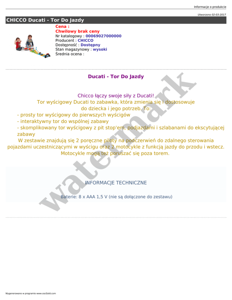 Informacje o produkcie Utworzono 02-03-2017 CHICCO Ducati - Tor Do Jazdy Cena : Chwilowy brak ceny Nr katalogowy : 00069027000000 Producent : CHICCO Dostępność : Dostępny Stan magazynowy : wysoki Średnia ocena : er m ar k Ducati - Tor Do Jazdy at Chicco łączy swoje siły z Ducati! Tor wyścigowy Ducati to zabawka, która zmienia się i dostosowuje do dziecka i jego potrzeb. To: - prosty tor wyścigowy do pierwszych wyścigów - interaktywny tor do wspólnej zabawy - skomplikowany tor wyścigowy z pit stop'em, podjazdami i szlabanami do ekscytującej zabawy W zestawie znajdują się 2 poręczne piloty na podczerwień do zdalnego sterowania pojazdami uczestniczącymi w wyścigu oraz 2 motocykle z funkcją jazdy do przodu i wstecz. Motocykle mogą też poruszać się poza torem. INFORMACJE TECHNICZNE w Baterie: 8 x AAA 1,5 V (nie są dołączone do zestawu) Wygenerowano w programie www.oscGold.com
