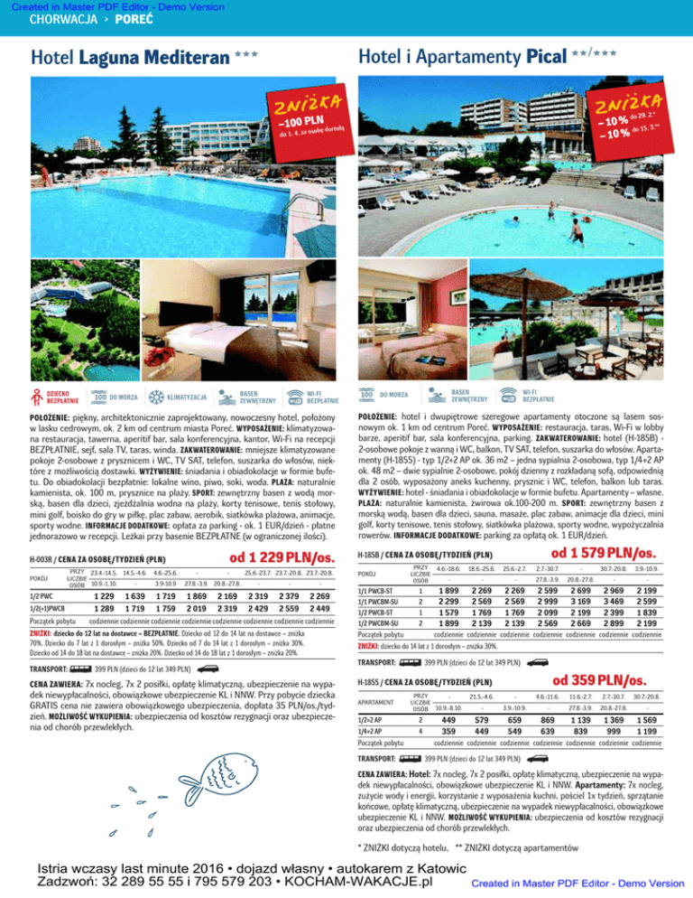 Created in Master PDF Editor - Demo Version CHORWACJA > POREĆ Hotel i Apartamenty Pical Hotel Laguna Mediteran / do 29. 2.* −100 PosLobNę dorosłą − 10 % do 15. 3.** − 10 % do 1. 4. za DZIECKO BEZPŁATNIE 100 DO MORZA BASEN ZEWNĘTRZNY KLIMATYZACJA WI-FI BEZPŁATNIE POŁOŻENIE: piękny, architektonicznie zaprojektowany, nowoczesny hotel, położony w lasku cedrowym, ok. 2 km od centrum miasta Poreć. WYPOSAŻENIE: klimatyzowa- na restauracja, tawerna, aperitif bar, sala konferencyjna, kantor, Wi-Fi na recepcji BEZPŁATNIE, sejf, sala TV, taras, winda. ZAKWATEROWANIE: mniejsze klimatyzowane pokoje 2-osobowe z prysznicem i WC, TV SAT, telefon, suszarka do włosów, niektóre z możliwością dostawki. WYŻYWIENIE: śniadania i obiadokolacje w formie bufetu. Do obiadokolacji bezpłatnie: lokalne wino, piwo, soki, woda. PLAŻA: naturalnie kamienista, ok. 100 m, prysznice na plaży. SPORT: zewnętrzny basen z wodą morską, basen dla dzieci, zjeżdżalnia wodna na plaży, korty tenisowe, tenis stołowy, mini golf, boisko do gry w piłkę, plac zabaw, aerobik, siatkówka plażowa, animacje, sporty wodne. INFORMACJE DODATKOWE: opłata za parking - ok. 1 EUR/dzień - płatne jednorazowo w recepcji. Leżkai przy basenie BEZPŁATNE (w ograniczonej ilości). od 1 229 PLN/os. H-003R / CENA ZA OSOBĘ/TYDZIEŃ (PLN) POKÓJ PRZY 23.4.-14.5. 14.5.-4.6. LICZBIE OSÓB 10.9.-1.10. 1/2 PWC 1/2(+1)PWCB Początek pobytu 1 229 1 289 1 639 1 719 4.6.-25.6. 3.9-10.9 1 719 1 759 - - 27.8.-3.9. 20.8.-27.8. 1 869 2 019 2 169 2 319 25.6.-23.7. 23.7.-20.8. 23.7.-20.8. - 2 319 2 429 - 2 379 2 559 codziennie codziennie codziennie codziennie codziennie codziennie codziennie codziennie ZNIŻKI: dziecko do 12 lat na dostawce – BEZPŁATNIE. Dziecko od 12 do 14 lat na dostawce – zniżka 70%. Dziecko do 7 lat z 1 dorosłym – zniżka 50%. Dziecko od 7 do 14 lat z 1 dorosłym – zniżka 30%. Dziecko od 14 do 18 lat na dostawce – zniżka 20%. Dziecko od 14 do 18 lat z 1 dorosłym – zniżka 20%. TRANSPORT: 399 PLN (dzieci do 12 lat 349 PLN) CENA ZAWIERA: 7x nocleg, 7x 2 posiłki, opłatę klimatyczną, ubezpieczenie na wypa- dek niewypłacalności, obowiązkowe ubezpieczenie KL i NNW. Przy pobycie dziecka GRATIS cena nie zawiera obowiązkowego ubezpieczenia, dopłata 35 PLN/os./tydzień. MOŻLIWOŚĆ WYKUPIENIA: ubezpieczenia od kosztów rezygnacji oraz ubezpieczenia od chorób przewlekłych. WI-FI BEZPŁATNIE POŁOŻENIE: hotel i dwupiętrowe szeregowe apartamenty otoczone są lasem sosnowym ok. 1 km od centrum Poreć. WYPOSAŻENIE: restauracja, taras, Wi-Fi w lobby barze, aperitif bar, sala konferencyjna, parking. ZAKWATEROWANIE: hotel (H-185B) - 2-osobowe pokoje z wanną i WC, balkon, TV SAT, telefon, suszarka do włosów. Apartamenty (H-1855) - typ 1/2+2 AP ok. 36 m2 – jedna sypialnia 2-osobowa, typ 1/4+2 AP ok. 48 m2 – dwie sypialnie 2-osobowe, pokój dzienny z rozkładaną sofą, odpowiednią dla 2 osób, wyposażony aneks kuchenny, prysznic i WC, telefon, balkon lub taras. WYŻYWIENIE: hotel - śniadania i obiadokolacje w formie bufetu. Apartamenty – własne. PLAŻA: naturalnie kamienista, żwirowa ok.100-200 m. SPORT: zewnętrzny basen z morską wodą, basen dla dzieci, sauna, masaże, plac zabaw, animacje dla dzieci, mini golf, korty tenisowe, tenis stołowy, siatkówka plażowa, sporty wodne, wypożyczalnia rowerów. INFORMACJE DODATKOWE: parking za opłatą ok. 1 EUR/dzień. od 1 579 PLN/os. H-185B / CENA ZA OSOBĘ/TYDZIEŃ (PLN) POKÓJ - 2 269 2 449 BASEN ZEWNĘTRZNY 100 DO MORZA 1/1 PWCB-ST 1/1 PWCBM-SU 1/2 PWCB-ST 1/2 PWCBM-SU PRZY 4.6.-18.6. LICZBIE OSÓB 1 2 1 2 1 899 2 299 1 579 1 899 18.6.-25.6. 25.6.-2.7. 2.7.-30.7. - 30.7.-20.8. - - 27.8.-3.9. 20.8.-27.8. - 3.9.-10.9. - 2 269 2 569 1 769 2 139 2 269 2 569 1 769 2 139 2 599 2 999 2 099 2 569 2 699 3 169 2 199 2 669 2 969 3 469 2 399 2 899 2 199 2 599 1 839 2 199 Początek pobytu codziennie codziennie codziennie codziennie codziennie codziennie codziennie ZNIŻKI: dziecko do 14 lat z 1 dorosłym – zniżka 30%. TRANSPORT: 399 PLN (dzieci do 12 lat 349 PLN) od 359 PLN/os. H-1855 / CENA ZA OSOBĘ/TYDZIEŃ (PLN) APARTAMENT PRZY LICZBIE OSÓB 10.9.-8.10. 1/2+2 AP 2 1/4+2 AP 4 Początek pobytu TRANSPORT: 449 359 21.5.-4.6. - 4.6.-11.6. 11.6.-2.7. 2.7.-30.7. - 3.9.-10.9. - 27.8.-3.9. 20.8.-27.8. 30.7.-20.8. - 579 449 659 549 869 639 1 139 839 1 369 999 1 569 1 199 codziennie codziennie codziennie codziennie codziennie codziennie codziennie 399 PLN (dzieci do 12 lat 349 PLN) CENA ZAWIERA: Hotel: 7x nocleg, 7x 2 posiłki, opłatę klimatyczną, ubezpieczenie na wypadek niewypłacalności, obowiązkowe ubezpieczenie KL i NNW. Apartamenty: 7x nocleg, zużycie wody i energii, korzystanie z wyposażenia kuchni, pościel 1x tydzień, sprzątanie końcowe, opłatę klimatyczną, ubezpieczenie na wypadek niewypłacalności, obowiązkowe ubezpieczenie KL i NNW. MOŻLIWOŚĆ WYKUPIENIA: ubezpieczenia od kosztów rezygnacji oraz ubezpieczenia od chorób przewlekłych. * ZNIŻKI dotyczą hotelu, ** ZNIŻKI dotyczą apartamentów Istria wczasy last minute 2016 • dojazd własny • autokarem z Katowic Zadzwoń: 32 289 55 55 i 795 579 203 • KOCHAM-WAKACJE.pl Created in Master PDF Editor - Demo Version
