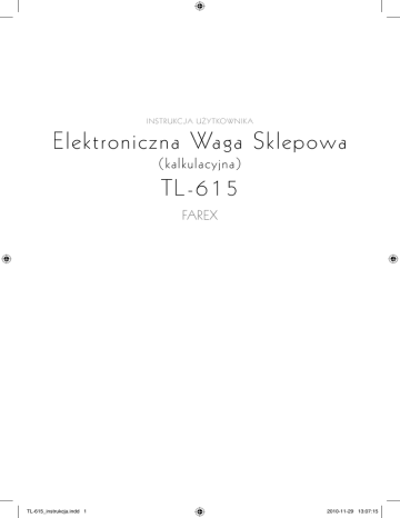 INSTRUKCJA UŻYTKOWNIKA Elektroniczna Waga Sklepowa (kalkulacyjna) TL -615 FAREX TL-615_instrukcja.indd 1 2010-11-29 13:07:15 TL-615_instrukcja.indd 2 2010-11-29 13:07:16 SPIS TREŚCI 1. Wstęp 4 1.1 Przygotowanie do pracy 4 1.2 Zalecenia i uwagi 4 1.3 Charakterystyka 5 2. Obsługa i programowanie 6 2.1 Ważenie zwykłe 6 2.2 Ważenie wielokrotne z zapamiętywaniem poszczególnych pozycji i wydawaniem reszty 6 Sprzedaż przy wykorzystaniu uprzednio zaprogramowanych pozycji PLU 7 2.4 Klawiatura 7 2.5 Użycie klawisza ZERO 8 2.6 Użycie klawisza STAŁA CENA 8 2.7 Użycie tary 8 2.8 Użycie przycisku PLU z bezpośrednim dostępem do pamięci 8 2.9 Użycie przycisku PLU z pośrednim dostępem do pamięci 9 2.3 2.10 Programowanie PLU 9 3. Komunikacja przez port RS – 232 10 4. Schemat instalacji wagi FAREX TL-615 11 5. Wybór protokołu komunikacyjnego 14 6. Sposób podłączenia kabla transmisyjnego do ramienia wyświetlacza przed jego osadzeniem w obudowie 15 7. Montaż wyświetlacza 16 3 TL-615_instrukcja.indd 3 2010-11-29 13:07:16 WSTĘP 1. Wstęp 1.1. Przygotowanie do pracy • Umieścić wagę z założoną szalką na płaskim i stabilnym podłożu. • Sprawdzić napięcie w gniazdku sieciowym. • Wypoziomować wagę poprzez pokręcanie nóżkami w czterech rogach wagi. Należy tak wyregulować, aby pęcherzyk powietrza poziomnicy znalazł się w środku koła. Poziomnica znajduje się przy podstawie wyświetlacza. • Włożyć wtyczkę przewodu zasilacza do gniazda zasilania Wagi (gniazdo umieszczone jest w obudowie Wagi, ukryte od spodu Wagi za specjalną plastikową pokrywą). • Włożyć wtyczkę sieciową zasilacza do gniazda sieciowego. • Włączyć wagę przełącznikiem znajdującym się od spodu Wagi. (przełącznik umieszczony jest w obudowie Wagi, ukryty od spodu Wagi za specjalną plastikową pokrywą). Po włączeniu układ elektroniczny wagi wykonuje auto -test. Polega on na sprawdzeniu poprawności działania wszystkich obwodów elektronicznych wagi. Na wyświetlaczu wagi wyświetlane są kolejno jego segmenty zgodnie z ruchem wskazówek zegara. Po zakończeniu testu wszystkie wyświetlacze powinny się wyzerować. 1.2. Zalecenia i uwagi • Nie kłaść mokrych, ociekających wodą przedmiotów bezpośrednio na szalce wagi. • Nie zostawiać wagi z przedmiotami położonymi na szalce. • Nie kroić niczego na szalce. • Nie wstrząsać i nie uderzać w szalkę. • Brudną wagę wytrzeć przy pomocy wilgotnej ściereczki. • Nie stosować do mycia Wagi żadnych substancji chemicznych mogących uszkodzić fakturę plastikowej obudowy urządzenia. • Używając wagi do ważenia przedmiotów zanieczyszczonych, używać specjalnych pojemników bądź opakowań chroniących Wagę przed możliwym zabrudzeniem. • Po każdym użytkowaniu szalki należy ją umyć stosując do tego celu wyłącznie wodę z ewentualnym dodatkiem detergentów. • Naładować baterię po długim okresie przechowywania (co 3-4 miesiące), a także przed każdym rozpoczęciem pracy. • Używać i przechowywać wagę z daleka od źródeł pól elektromagnetycznych, np.: silników, odbiorników telewizyjnych, sprężarek, chłodziarek itp., gdyż grozi to trwałym uszkodzeniem wagi. • Chronić wagę przed nagłymi zmianami temperatury. 4 TL-615_instrukcja.indd 4 w w w. f a r e x . b i z . p l 2010-11-29 13:07:16 WSTĘP UWAGA! To urządzenie posiada elementy elektroniczne, wyrzucanie go do śmieci jest zabronione! Zużyte lub uszkodzone urządzenia należy oddać do odpowiedniego punktu zbiórki, gdyż zawierają materiały zanieczyszczające środowisko. 1.3. Charakterystyka • Zakres ważenia do 15 kg. • 8 cyfr dla cen przyporządkowanych do poszczególnych towarów. • 10 cyfr określających sumę ogólną. • 16 pozycji pamięci. • 40 PLU bezpośredniego dostępu. • Ogólna liczba 200 PLU. • Zabezpieczenie przed przeciążeniem. • Duży (4,5 Ah 6 V), pozwalający na ponad 15 godzin pracy akumulator (OPCJONALNIE). • Duży, łatwo czytelny, jasny wyświetlacz LED. • Ostrzeżenie o wyczerpaniu baterii. • Podświetlane cyfry na wyświetlaczu. • Zasilacz zewnętrzny (AC 8,0 V, 700 mA). 5 TL-615_instrukcja.indd 5 2010-11-29 13:07:16 OBSŁUGA I PROGRAMOWANIE 2. Obsługa i programowanie 2.1. Ważenie zwykłe • Położyć towar na szalce. • Za pomocą klawiatury wprowadzić cenę jednostkową. • Odczytać należność i masę-Zdjąć towar z szalki. 2.2. Ważenie wielokrotne z zapamiętywaniem poszczególnych pozycji i wydawaniem reszty • Położyć towar na szalce. • Za pomocą klawiatury wprowadzić cenę jednostkową. • Odczytać należność i masę • Wcisnąć klawisz „M+” w celu zapamiętania należności • Po wprowadzonej pierwszej pozycji • Zdjąć towar z szalki -Położyć kolejny towar na szalce. • Za pomocą klawiatury wprowadzić nową cenę jednostkową • Odczytać należność i masę • Ponownie wcisnąć klawisz „M+” w celu zapamiętania kolejnej należności • Zdjąć towar z szalki. • W czasie sprzedaży można również odejmować bądź dodawać wartości pieniężne od całego rachunku pozostającego w pamięci. Należy w tym celu na nieobciążonej szalce wprowadzić konkretną wartość anastępnie wcisnąć klawisz „+” lub „–” • Waga posiada możliwość zapamiętania łącznie 16-tu pozycji należności, upustów i narzutów. • Po zakończeniu sprzedaży kolejnych uprzednio ważonych i wprowadzanych do pamięci towarów należy wcisnąć klawisz „MR” • Po jednokrotnym wciśnięciu klawisza „MR” wyświetlona zostanie pierwsza zapamiętana w pamięci pozycja oraz jej numer • Kolejne naciśnięcia klawisza „MR” wywołują z pamięci kolejne uprzednio zapamiętane pozycje • Każdemu naciśnięciu klawisza „MR” towarzyszy pojedynczy sygnał dźwiękowy • Po wyświetleniu ostatniej zapamiętanej pozycji, ponowne wciśnięcie klawisza „MR” spowoduje wyświetlenie całej sumy 