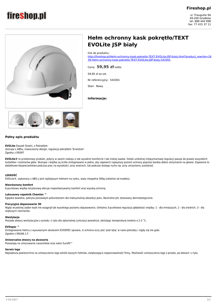 Fireshop.pl ul. Traugutta 9A 49-200 Grodków tel: 888 444 998 fax: 77 415 37 11 Hełm ochronny kask pokrętło/TEXT EVOLite JSP biały link do produktu: http://fireshop.pl/Helm-ochronny-kask-pokretlo-TEXT-EVOLite-JSP-bialy.html?product_rewrite=16 39-Helm-ochronny-kask-pokretlo-TEXT-EVOLite-JSP-bialy-543301 Cena: 59,95 zł netto 59,95 zł za szt. Nr referencyjny: 543301 Stan: Nowy Informacje: Pełny opis produktu EVOLite Daszek Średni, z Pokrętłem skorupa z ABSu, nowoczesny design, regulacja pokrętłem 'Evolution' Zgodny z EN397 EVOLite® to przełomowy produkt, jedyny w swoim rodzaju o tak wysokim komforcie i tak niskiej wadze. Dzięki unikalnej trójwymiarowej regulacji pasuje do prawie wszystkich kształtów i rozmiarów głów. Skorupa i więźba są ściśle zintegrowane w jedno, aby zapewnći najwyższy poziom ochrony poprzez bardzo dobre utrzymanie na głowie. Zapewnia to dodatkowe bezpieczeństwo podczas prac na wysokości, przy wiatrach, lub podczas dużego ruchu np. przy utrzymaniu autostrad. LEKKOŚĆ EVOLite®, wykonany z ABS-u jest najlżejszym hełmem na rynku, waży niespełna 300g (zależnie od modelu). Niezrównany komfort 6-punktowa więźba terylenową oferuje nieporównywalny komfort oraz wysoką ochronę. Luksusowy napotnik Chamlon ™ Egipska bawełna, pokryta porowatym poliuretanem dla maksymalnej absorbcji potu. Neutralne pH, testowany dermatologicznie. Precyzyjne dopasowanie 3D Nigdy wcześniej żaden kask nie osiągnął tak wysokiego poziomu dopasowania. Unikalna 3-punktowa regulacja głębokości więźby: 1 - dla mniejszych, 2 - dla średnich, 3 - dla większych rozmiarów. Wentylacja Posiada otwory wentylacyjne z przodu i z tyłu dla optymalnej cyrkulacji powietrza, obniżając temperaturę średnio o 2-3 ˚C. EVOspec ™ Zintegrowanie hełmu z wysuwanymi okularami EVOSPEC sprawia, iż ochrona oczu jest ‘pod ręką’ w razie potrzeby i nigdy się nie gubi. Zgodne z EN166.1.F. Uniwersalne otwory na akcesoria Pozwalają na umocowanie nauszników oraz osłon Surefit™ Serwis logo Największa powierzchnia na umieszczenie logo wśród naszych hełmów, zwiększająca rozpoznawalność firmy. Możliwość umieszczenia logo z przodu, po bokach i z tyłu. 2-03-2017 1/1