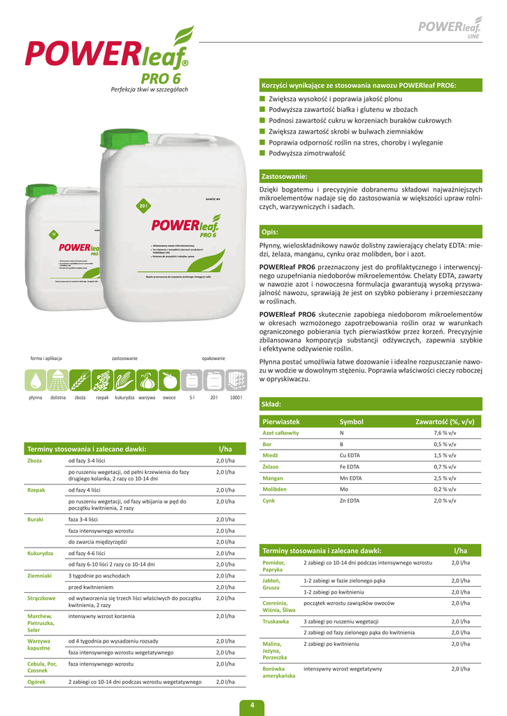 Korzyści wynikające ze stosowania nawozu POWERleaf PRO6: Perfekcja tkwi w szczegółach QQ Zwiększa wysokość i poprawia jakość plonu QQ Podwyższa zawartość białka i glutenu w zbożach QQ Podnosi zawartość cukru w korzeniach buraków cukrowych QQ Zwiększa zawartość skrobi w bulwach ziemniaków QQ Poprawia odporność roślin na stres, choroby i wyleganie QQ Podwyższa zimotrwałość Zastosowanie: Dzięki bogatemu i precyzyjnie dobranemu składowi najważniejszych mikroelementów nadaje się do zastosowania w większości upraw rolniczych, warzywniczych i sadach. Opis: 5l Płynny, wieloskładnikowy nawóz dolistny zawierający chelaty EDTA: miedzi, żelaza, manganu, cynku oraz molibden, bor i azot. POWERleaf PRO6 przeznaczony jest do profilaktycznego i interwencyjnego uzupełniania niedoborów mikroelementów. Chelaty EDTA, zawarty w nawozie azot i nowoczesna formulacja gwarantują wysoką przyswajalność nawozu, sprawiają że jest on szybko pobierany i przemieszczany w roślinach. POWERleaf PRO6 skutecznie zapobiega niedoborom mikroelementów w okresach wzmożonego zapotrzebowania roślin oraz w warunkach ograniczonego pobierania tych pierwiastków przez korzeń. Precyzyjnie zbilansowana kompozycja substancji odżywczych, zapewnia szybkie i efektywne odżywienie roślin. forma i aplikacja płynna dolistna zastosowanie zboża rzepak kukurydza warzywa opakowanie owoce 5l Terminy stosowania i zalecane dawki: Zboża 20 l Płynna postać umożliwia łatwe dozowanie i idealne rozpuszczanie nawozu w wodzie w dowolnym stężeniu. Poprawia właściwości cieczy roboczej w opryskiwaczu. 1000 l Skład: l/ha Pierwiastek Symbol Azot całkowity N Zawartość (%, v/v) 7,6 % v/v Bor B 0,5 % v/v Miedź Cu EDTA 1,5 % v/v Żelazo Fe EDTA 0,7 % v/v od fazy 3-4 liści 2,0 l/ha po ruszeniu wegetacji, od pełni krzewienia do fazy drugiego kolanka, 2 razy co 10-14 dni 2,0 l/ha Mangan Mn EDTA 2,5 % v/v od fazy 4 liści 2,0 l/ha Molibden Mo 0,2 % v/v po ruszeniu wegetacji, od fazy wbijania w pęd do początku kwitnienia, 2 razy 2,0 l/ha Cynk Zn EDTA 2,0 % v/v faza 3-4 liści 2,0 l/ha faza intensywnego wzrostu 2,0 l/ha do zwarcia międzyrzędzi 2,0 l/ha Kukurydza od fazy 4-6 liści 2,0 l/ha Terminy stosowania i zalecane dawki: od fazy 6-10 liści 2 razy co 10-14 dni 2,0 l/ha 2,0 l/ha 3 tygodnie po wschodach 2,0 l/ha Pomidor, Papryka 2 zabiegi co 10-14 dni podczas intensywnego wzrostu Ziemniaki przed kwitnieniem 2,0 l/ha Jabłoń, Grusza 1-2 zabiegi w fazie zielonego pąka 2,0 l/ha Strączkowe od wytworzenia się trzech liści właściwych do początku kwitnienia, 2 razy 2,0 l/ha 1-2 zabiegi po kwitnieniu 2,0 l/ha początek wzrostu zawiązków owoców 2,0 l/ha Marchew, Pietruszka, Seler intensywny wzrost korzenia 2,0 l/ha Czereśnia, Wiśnia, Śliwa Truskawka 3 zabiegi po ruszeniu wegetacji 2,0 l/ha 2 zabiegi od fazy zielonego pąka do kwitnienia 2,0 l/ha Warzywa kapustne od 4 tygodnia po wysadzeniu rozsady 2,0 l/ha 2 zabiegi po kwitnieniu 2,0 l/ha faza intensywnego wzrostu wegetatywnego 2,0 l/ha Cebula, Por, Czosnek faza intensywnego wzrostu 2,0 l/ha Malina, Jeżyna, Porzeczka intensywny wzrost wegetatywny 2,0 l/ha Ogórek 2 zabiegi co 10-14 dni podczas wzrostu wegetatywnego 2,0 l/ha Borówka amerykańska Rzepak Buraki 4 l/ha