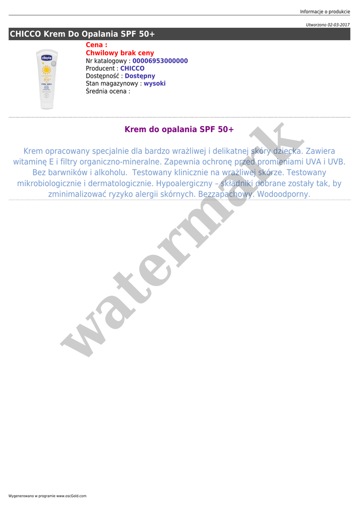 Informacje o produkcie Utworzono 02-03-2017 CHICCO Krem Do Opalania SPF 50+ Cena : Chwilowy brak ceny Nr katalogowy : 00006953000000 Producent : CHICCO Dostępność : Dostępny Stan magazynowy : wysoki Średnia ocena : er m ar k Krem do opalania SPF 50+ w at Krem opracowany specjalnie dla bardzo wrażliwej i delikatnej skóry dziecka. Zawiera witaminę E i filtry organiczno-mineralne. Zapewnia ochronę przed promieniami UVA i UVB. Bez barwników i alkoholu. Testowany klinicznie na wrażliwej skórze. Testowany mikrobiologicznie i dermatologicznie. Hypoalergiczny – składniki dobrane zostały tak, by zminimalizować ryzyko alergii skórnych. Bezzapachowy. Wodoodporny. Wygenerowano w programie www.oscGold.com