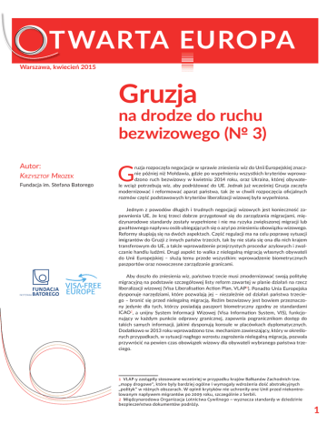 PEN EUROPE TWARTA EUROPA Warsaw/Tbilisi, October 2014 Warszawa, kwiecień 2015 It’s Georgia’s Gruzja na drodze do ruchu bezwizowego (№ 3) Autor: Authors: KRZYSZTOF MROZEK Fundacja im. Stefana Batorego Vano Chkhikvadze Krzysztof Mrozek Contributor: Jakub Benedyczak Proofreading: Alan Parsons G ruzja rozpoczęła negocjacje w sprawie zniesienia wiz do Unii Europejskiej znacznie później niż Mołdawia, gdzie po wypełnieniu wszystkich kryteriów wprowadzono ruch bezwizowy w kwietniu 2014 roku, oraz Ukraina, której obywatele wciąż potrzebują wiz, aby podróżować do UE. Jednak już wcześniej Gruzja zaczęła modernizować i reformować aparat państwa, tak że w chwili rozpoczęcia oficjalnych rozmów część podstawowych kryteriów liberalizacji wizowej była wypełniona. Moldova can now travel to the European Union without needing a visa a Jednym z powodów długich i trudnych negocjacji wizowych jest konieczność zapewnienia UE, że kraj trzeci dobrze przygotował się do zarządzania migracjami, międzynarodowe standardy zostały wypełnione i nie ma ryzyka zwiększonej migracji lub This sets a precedent for the other Eastern Partnership (EaP) countries, gwałtownego napływu osób ubiegających się o azyl po zniesieniu obowiązku wizowego. Azerbaijan, Ukraine travel is achievab Reformy skupiają sięBelarus, na dwóchGeorgia aspektach.and Część regulacjithat ma navisa-free celu poprawę sytuacji imigrantów do Gruzji z innych państw trzecich, tak by nie stała się ona dla nich krajem transferowym do UE, a także wprowadzenie przejrzystych procedur azylowych i zwalczanie handlu ludźmi. Drugi aspekt to walka z nielegalną migracją własnych obywateli do Unii Europejskiej – służą temu przede wszystkim: wprowadzenie Parliament and the Council, is not impossible and shouldbiometrycznych not be considered as paszportów oraz nowoczesne zarządzanie granicami. Aby doszło do zniesienia wiz, państwo trzecie musi zmodernizować swoją politykę migracyjną na podstawie szczegółowej listy reform zawartej w planie działań na rzecz liberalizacji wizowej (Visa Liberalisation Action Plan, VLAP1). Ponadto Unia Europejska dysponuje narzędziami, które pozwalają jej – niezależnie od działań państwa trzeciego – bronić się przed nielegalną migracją. Reżim bezwizowy jest bowiem przeznaczony jedynie dla tych, którzy posiadają paszport biometryczny zgodny ze standardami of 2015 and to achieve visa free travel from the start of 2016. ICAO2, a unijny System Informacji Wizowej (Visa Information System, VIS), funkcjonujący w każdym punkcie odprawy granicznej, zapewnia pogranicznikom dostęp do The informacji, aim of this policy paper konsule is to discuss the progress made by Georgia takich samych jakimi dysponują w placówkach dyplomatycznych. Dodatkowo w 2013 roku wprowadzono tzw. mechanizm zawieszający, który w określoving a visa-free regime with the EU, to analyse the main challenges faced in t nych przypadkach, w sytuacji nagłego wzrostu zagrożenia nielegalną migracją, pozwala przywrócić na pewien czas obowiązek wizowy dla obywateli wybranego państwa trzeciego. 1 1 VLAP-y zastąpiły stosowane wcześniej w przypadku krajów Bałkanów Zachodnich tzw. to the list Georgia belongs „mapy drogowe”, które były bardziej ogólne i wymagały wdrożenia dość abstrakcyjnych „polityk” w różnych obszarach. W opinii krytyków nie uchroniły one Unii przed niekontrolowanym napływem po 2009 roku, szczególnie other hand, migrantów took a unilateral decision on 1stz Serbii. June 2006 to abolish visa require 2 Międzynarodowa Organizacja Lotnictwa Cywilnego – wyznacza standardy w dziedzinie bezpieczeństwa dokumentów podróży. 1 Gruzja na drodze do ruchu bezwizowego (№ 3) Liberalizacja wizowa z Mołdawią, wprowadzona 28 kwietnia 2014 roku, jako pierwsza w oparciu o nowe procedury i pierwsza dla kraju inicjatywy Partnerstwa Wschodniego, działa sprawnie i nie miała wyraźnego przełożenia na wzrost nieregularnej migracji. Po otrzymaniu VLAP-u w lutym 2013 roku Gruzja wdrożyła podobny proces, jaki Mołdawia ukończyła w zeszłym roku. Pierwszy aspekt reform został w Gruzji zasadniczo zrealizowany w 2014 roku: 1 września weszła w życie ustawa o statusie prawnym cudzoziemców i bezpaństwowców, do której przepisy wykonawcze uchwalono w sierpniu ubiegłego roku. W lutym 2014 roku rozpoczęto prace nad jednolitym migracyjnym systemem analitycznym, który ma gromadzić informacje o tendencjach migracyjnych. Zostanie on ukończony w połowie 2016 roku. Do programu szkolenia policji i służb granicznych włączono nowy moduł treningowy, mający ułatwić postępowanie z osobami ubiegającymi się o azyl i uchodźcami. Ustawodawstwo regulujące kwestię azylu zostało znowelizowane i obecnie spełnia międzynarodowe standardy. Istniejące przepisy i polityka zwalczania handlu ludźmi dają gruzińskim władzom wystarczające narzędzia, aby efektywnie wykorzeniać tę patologię. Zgodnie z oceną UE prawodawstwo dotyczące migracji zostało przyjęte i na bieżąco jest wprowadzane w życie3. Z drugiej strony Gruzja zmaga się z problemem separatyzmu w Abchazji i Osetii Południowej, których to regionów Tbilisi nie kontroluje. Mimo to gruzińskie służby efektywnie kontrolują migrację poprzez linię administracyjną oddzielającą Gruzję od regionów separatystycznych4. Druga część reform reguluje przede wszystkim kwestię paszportów biometrycznych, które są w Gruzji wydawane już od 2010 roku, a Tbilisi współpracuje z Interpolem, przekazując informacje o skradzionych bądź zagubionych dokumentach. Strategia zarządzania granicami państwowymi na lata 2014–2018 została przyjęta w marcu 2014 roku, natomiast plan działań określający ramy czasowe realizacji strategii – w maju 2014 roku. Jak pokazuje raport Komisji Europejskiej, Gruzja współpracuje z innymi państwami i organizacjami międzynarodowymi w celu pop