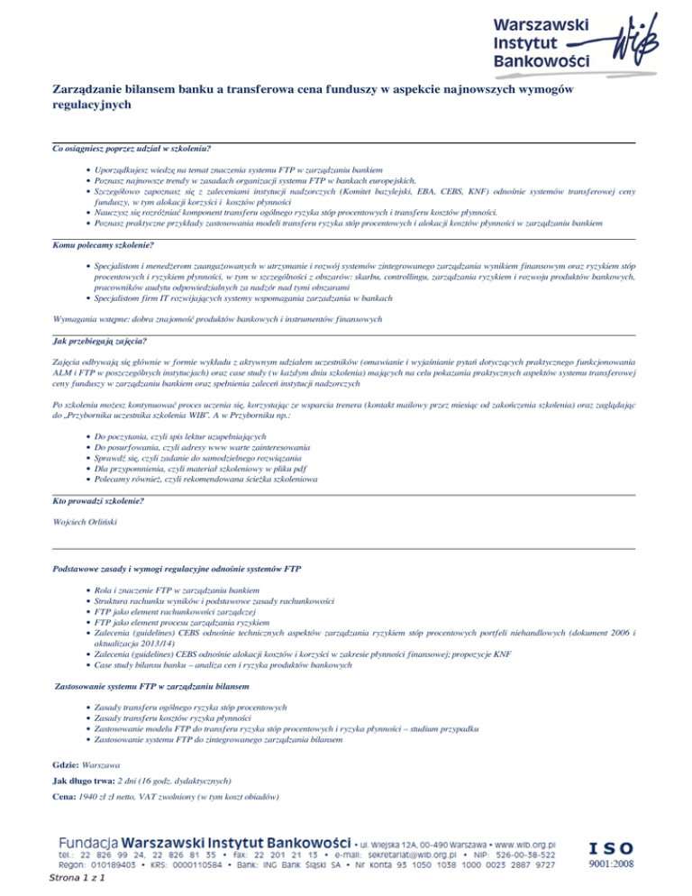 Zarządzanie bilansem banku a transferowa cena funduszy w aspekcie najnowszych wymogów regulacyjnych Co osiągniesz poprzez udział w szkoleniu? Uporządkujesz wiedzę na temat znaczenia systemu FTP w zarządzaniu bankiem Poznasz najnowsze trendy w zasadach organizacji systemu FTP w bankach europejskich. Szczegółowo zapoznasz się z zaleceniami instytucji nadzorczych (Komitet bazylejski, EBA, CEBS, KNF) odnośnie systemów transferowej ceny funduszy, w tym alokacji korzyści i kosztów płynności Nauczysz się rozróżniać komponent transferu ogólnego ryzyka stóp procentowych i transferu kosztów płynności. Poznasz praktyczne przykłady zastosowania modeli transferu ryzyka stóp procentowych i alokacji kosztów płynności w zarządzaniu bankiem Komu polecamy szkolenie? Specjalistom i menedżerom zaangażowanych w utrzymanie i rozwój systemów zintegrowanego zarządzania wynikiem finansowym oraz ryzykiem stóp procentowych i ryzykiem płynności, w tym w szczególności z obszarów: skarbu, controllingu, zarządzania ryzykiem i rozwoju produktów bankowych, pracowników audytu odpowiedzialnych za nadzór nad tymi obszarami Specjalistom firm IT rozwijających systemy wspomagania zarzadzania w bankach Wymagania wstępne: dobra znajomość produktów bankowych i instrumentów finansowych Jak przebiegają zajęcia? Zajęcia odbywają się głównie w formie wykładu z aktywnym udziałem uczestników (omawianie i wyjaśnianie pytań dotyczących praktycznego funkcjonowania ALM i FTP w poszczególnych instytucjach) oraz case study (w każdym dniu szkolenia) mających na celu pokazania praktycznych aspektów systemu transferowej ceny funduszy w zarządzaniu bankiem oraz spełnienia zaleceń instytucji nadzorczych Po szkoleniu możesz kontynuować proces uczenia się, korzystając ze wsparcia trenera (kontakt mailowy przez miesiąc od zakończenia szkolenia) oraz zaglądając do „Przybornika uczestnika szkolenia WIB”. A w Przyborniku np.: Do poczytania, czyli spis lektur uzupełniających Do posurfowania, czyli adresy www warte zainteresowania Sprawdź się, czyli zadanie do samodzielnego rozwiązania Dla przypomnienia, czyli materiał szkoleniowy w pliku pdf Polecamy również, czyli rekomendowana ścieżka szkoleniowa Kto prowadzi szkolenie? Wojciech Orliński Podstawowe zasady i wymogi regulacyjne odnośnie systemów FTP Rola i znaczenie FTP w zarządzaniu bankiem Struktura rachunku wyników i podstawowe zasady rachunkowości FTP jako element rachunkowości zarządczej FTP jako element procesu zarządzania ryzykiem Zalecenia (guidelines) CEBS odnośnie technicznych aspektów zarządzania ryzykiem stóp procentowych portfeli niehandlowych (dokument 2006 i aktualizacja 2013/14) Zalecenia (guidelines) CEBS odnośnie alokacji kosztów i korzyści w zakresie płynności finansowej; propozycje KNF Case study bilansu banku – analiza cen i ryzyka produktów bankowych Zastosowanie systemu FTP w zarządzaniu bilansem Zasady transferu ogólnego ryzyka stóp procentowych Zasady transferu kosztów ryzyka płynności Zastosowanie modelu FTP do transferu ryzyka stóp procentowych i ryzyka płynności – studium przypadku Zastosowanie systemu FTP do zintegrowanego zarządzania bilansem Gdzie: Warszawa Jak długo trwa: 2 dni (16 godz. dydaktycznych) Cena: 1940 zł zł netto, VAT zwolniony (w tym koszt obiadów) Strona 1 z 1 Powered by TCPDF (www.tcpdf.org)