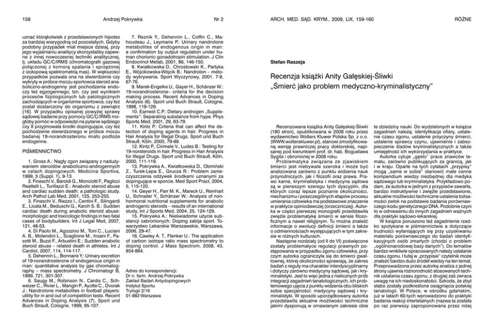 158 Andrzej Pokrywka uznać którąkolwiek z przedstawionych hipotez za bardziej wiarygodną od pozostałych. Gdyby podobny przypadek miał miejsce dzisiaj, przy jego wyjaśnianiu analitycy skorzystaliby zapewne z innej nowoczesnej techniki analitycznej, tj. układu Gc/c/irMS (chromatografii gazowej połączonej z komorą spalania i sprzężonej z izotopową spektrometrią mas). W większości przypadków pozwala ona na stwierdzenie czy wykryty w próbce moczu sportowca steroid anaboliczno-androgenny jest pochodzenia endoczy też egzogennego, tzn. czy jest wynikiem procesów fizjologicznych lub patologicznych zachodzących w organizmie sportowca, czy też został dostarczony do organizmu z zewnątrz [16]. W przypadku opisanej powyżej sprawy sądowej badanie przy pomocy Gc/c/irMS mogłoby pomóc w odpowiedzi na pytanie sędziego czy X przyjmowała środki dopingujące, czy też pochodzenie stwierdzonego w próbce moczu badanej 19-norandrosteronu miało podłoże endogenne. PiśMiennicTWO 1. Gross A.: nagły zgon związany z nadużywaniem steroidów anaboliczno-androgennych w celach dopingowych. Medicina Sportiva, 1999, 3 (Suppl. 1), 9-13. 2. Fineschi V., Baroldi G., Monciotti F., Paglicci reattelli L., Turillazzi e.: Anabolic steroid abuse and cardiac sudden death: a pathologic study. Arch Pathol Lab Med, 2001, 125, 253-255. 3. Fineschi V., riezzo i., centini F., Silingardi e., Licata M., Beduschi G., Karch S. B.: Sudden cardiac death during anabolic steroid abuse: morphologic and toxicologic findings in two fatal cases of bodybuilders. int J Legal Med, 2007, 121, 48-53. 4. Di Paolo M., Agozzino M., Toni c., Luciani A. B., Molendini L., Scaglione M., inzani F., Pasotti M., Buzzi F., Arbustini e.: Sudden anabolic steroid abuse – related death in athletes. int J cardiol, 2007, 114, 114-117. 5. Dehennin L., Bonnaire Y.: Urinary excretion of 19-norandrosterone of endogenous origin in man: quantitative analysis by gas chromatography – mass spectrometry. J chromatogr B, 1999, 721, 301-307. 6. Saugy M., robinson n., cardis c., Schweizer c., rivier L., Mangin P., Ayotte c., Dvorak J.: nandrolone metabolites in football players: utility for in and out of competition tests. recent Advances in Doping Analysis (7), Sport und Buch Strauß, cologne, 1999, 95-107. nr 2 7. reznik Y., Dehennin L., coffin c., Mahoudeau J., Leymarie P.: Urinary nandrolone metabolites of endogenous origin in man: a confirmation by output regulation under human chorionic gonadotropin stimulation. J clin endocrinol Metab, 2001, 86, 146-150. 8. Kwiatkowska D., chrostowski K., Partyka e., Wójcikowska-Wójcik B.: nandrolon – metody wykrywania. Sport Wyczynowy, 2001, 7-8, 67-76. 9. Marek-engelke U., Gayer H., Schänzer W.: 19-norandrosterone– criteria for the decision making process. recent Advances in Doping Analysis (6). Sport und Buch Strauß, cologne, 1998, 119-129. 10. earnest c.P.: Dietary androgen „Supplements”: Separating substance from hype. Phys Sports Med, 2001, 29, 63-79. 11. Kintz P.: criteria that can affect the detection of doping agents in hair. Progress in Hair Analysis for illegal Drugs. Sport und Buch Strauß, Köln, 2000, 79-89. 12. Kintz P., cirimele V., Ludes B.: Testing for 19-norsteroids in hair. Progress in Hair Analysis for illegal Drugs. Sport und Buch Strauß, Köln, 2000, 111-119. 13. Pokrywka A., Kwiatkowska D., Obmiński Z., Turek-Lepa e., Grucza r.: Problem zanieczyszczenia odżywek środkami uznanymi za dopingujące w sporcie. Med Sport Pract, 2004, 5, 115-120. 14. Geyer H., Parr M. K., Mareck U., reinhart U., Schrader Y., Schänzer W.: Analysis of nonhormonal nutritional supplements for anabolic androgenic steroids – results of an international study, int J Sports Med, 2004, 25, 124-129. 15. Pokrywka A.: nieświadome użycie substancji zabronionych. Doping zabija sport. Towarzystwo Lekarskie Warszawskie, Warszawa, 2006, 29-47. 16. cawley A. T., Flenker U.: The application of carbon isotope ratio mass spectrometry to doping control. J Mass Spectrom, 2008, 43, 854-864. Adres do korespondencji: Dr n. farm. Andrzej Pokrywka Zakład Badań Antydopingowych instytut Sportu Trylogii 2/16 01-982-Warszawa ArcH. MeD. SĄD. KrYM., 2009, LiX, 159-160 rÓŻne Stefan Raszeja recenzja książki Anity Gałęskiej-śliwki „śmierć jako problem medyczno-kryminalistyczny” recenzowana książka Anity Gałęskiej-śliwki (180 stron), opublikowana w 2008 roku przez wydawnictwo Wolters Kluwer Polska Sp. z o.o. (WWW.wolterskluwer.pl), stanowi zmodyfikowaną wersję prawniczej pracy doktorskiej, napisanej pod kierunkiem prof. dr. hab. Bogusława Sygita i obronionej w 2008 roku. Problematyka związana ze zjawiskiem śmierci jest niebywale szeroka i może być analizowana zarówno z punktu widzenia nauk przyrodniczych, jak i filozofii oraz prawa. Prawo karne, kryminalistyka i medycyna sądowa są w pierwszym szeregu tych dyscyplin, dla których coraz lepsze poznanie okoliczności, mechanizmu i poszczególnych etapów procesu umierania człowieka ma podstawowe znaczenie w praktyce opiniodawczej (orzeczniczej). Autorka w części pierwszej monografii przedstawiła zwięźle problematykę śmierci w sensie filozoficznym a nawet religijnym. Tu można znaleźć informacje o ewolucji definicji śmierci a także o odmiennościach występujących w tym zakresie w różnych kulturach. następne rozdziały (od ii do Vi) poświęcone zostały problematyce regulacji prawnych postępowania w przypadku zgonu człowieka, przy czym autorka ograniczyła się do śmierci gwałtownej, której okoliczności sprawiają, że zakres badań z reguły ma charakter interdyscyplinarny i dotyczy zarówno medycyny sądowej, jak i kryminalistyki. Jest to więc jedna z nielicznych prób integracji zagadnień tanatologicznych, ich problemowego ujęcia z punktu widzenia obu bliskich sobie specjalności: medycyny sądowej i kryminalistyki. W sposób uporządkowany autorka przedstawiła aktualne możliwości techniczne jakimi dysponują w