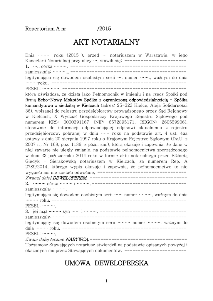 Repertorium A nr /2015 AKT NOTARIALNY Dnia ……… roku (2015-), przed … notariuszem w Warszawie, w jego Kancelarii Notarialnej przy ulicy …, stawili się: ----------------------1. ….. córka ………, ------------------------------------------zamieszkała: ……….., ------------------------------------------legitymująca się dowodem osobistym serii …. numer ……., ważnym do dnia ………roku, -------------------------------------------------PESEL: …………, ---------------------------------------------która oświadcza, że działa jako Pełnomocnik w imieniu i na rzecz Spółki pod firmą Echo-Nowy Mokotów Spółka z ograniczoną odpowiedzialnością - Spółka komandytowa z siedzibą w Kielcach (adres: 25-323 Kielce, Aleja Solidarności 36), wpisanej do rejestru przedsiębiorców prowadzonego przez Sąd Rejonowy w Kielcach, X Wydział Gospodarczy Krajowego Rejestru Sądowego pod numerem KRS: 0000391167 (NIP: 6572895171, REGON: 260559906), stosownie do informacji odpowiadającej odpisowi aktualnemu z rejestru przedsiębiorców, pobranej w dniu …… roku na podstawie art. 4 ust. 4aa ustawy z dnia 20 sierpnia 1997 roku o Krajowym Rejestrze Sądowym (Dz.U. z 2007 r., Nr 168, poz. 1186, z późn. zm.), którą okazuje i zapewnia, że dane w niej zawarte nie uległy zmianie, na podstawie pełnomocnictwa sporządzonego w dniu 23 października 2014 roku w formie aktu notarialnego przed Elżbietą Giedyk – Sierakowską notariuszem w Kielcach, za numerem Rep. A 2789/2014, którego wypis okazuje i zapewnia, że pełnomocnictwo to nie wygasło ani nie zostało odwołane, --------------------------------- Zwanej dalej DEWELOPEREM, -----------------------------------2. ……… córka ……… i ………, ----------------------------------zamieszkała: ………, -------------------------------------------legitymująca się dowodem osobistym serii …… numer ………, ważnym do dnia ……… roku, -------------------------------------------------PESEL: ………, 3. jej mąż ……… syn …… i ………, -------------------------------zamieszkały: ……… -------------------------------------------legitymujący się dowodem osobistym serii ……… numer ………, ważnym do dnia ……… roku, ---------------------------------------------PESEL: ………, Zwani dalej łącznie NABYWCĄ.-----------------------------------Tożsamość Stawających notariusz stwierdził na podstawie opisanych powyżej i okazanych mu przez Stawających dokumentów. ----------------------- UMOWA DEWELOPERSKA 1 PREAMBUŁA Strony zawierają niniejszą umowę w celu ustanowienia odrębnej własności lokalu mieszkalnego przez Dewelopera i przeniesienia własności tego lokalu na stronę Nabywcę, w wykonaniu przepisów ustawy z dnia 16 września 2011 roku - o ochronie praw nabywcy lokalu mieszkalnego lub domu jednorodzinnego (Dz.U. z dnia 28 października 2011 roku, Nr 232, poz. 1377). §1. OŚWIADCZENIA DOTYCZĄCE NIERUCHOMOŚCI Pełnomocnik Dewelopera, działający w imieniu i na rzecz Spółki pod firmą Echo-Nowy Mokotów Spółka z ograniczoną odpowiedzialnością - Spółka komandytowa z siedzibą w Kielcach, oświadcza, że: -------------------1. Sąd Rejonowy dla Warszawy–Mokotowa w Warszawie, VII Wydział Ksiąg Wieczystych prowadzi księgę wieczystą numer WA2M/00505740/0 dla nieruchomości gruntowej, oddanej w użytkowanie wieczyste, położonej w Warszawie, dzielnicy Mokotów, przy ulicy Konstruktorskiej, obręb 108-01, w gminie Miasto Stołeczne Warszawa, województwie mazowieckim, składającej się z działki ewidencyjnej numer 11/4 (jedenaście łamane przez cztery), o powierzchni 8.890,00 m2 (osiem tysięcy osiemset dziewięćdziesiąt metrów kwadratowych) i działki ewidencyjnej numer 11/8 (jedenaście łamane przez osiem), o powierzchni 1.023,00 m2 (jeden tysiąc dwadzieścia trzy metry kwadratowe), o sposobie korzystania określonym jako tereny przemysłowe (Ba); --------------------------------2. w dziale I-Sp księgi wieczystej numer KW WA2M/00505740/0 ujawniona jest informacja, że przedmiotowa nieruchomość oddana jest w użytkowanie wieczyste do dnia 5 grudnia 2089 roku, na podstawie decyzji Prezydenta Miasta Stołecznego Warszawy numer 9/96, z dnia 23 kwietnia 1996 roku o oddaniu działki gruntu w wieczyste użytkowanie; -----------------3. w dziale II księgi wieczystej numer KW WA2M/00505740/0 jako właściciel ujawnione jest Miasto Stołeczne Warszawa, zaś jako użytkownik wieczysty i właściciel budynków stanowiących odrębne od gruntu przedmioty własności - Spółka pod firmą Echo – Nowy Mokotów Spółka z ograniczoną odpowiedzialnością - Spółka komandytowa z siedzibą w Kielcach – na podstawie umowy sprzedaży prawa użytkowania wieczystego gruntu i związanego z nim prawa odrębnej własności budynków, sporządzonej dnia 2 stycznia 2013 roku przez Elżbietę Giedyk – Sierakowską, notariusza w Kielcach, za numerem Rep. A 1/2013; ---------------------------4. dział III księgi wieczystej numer KW WA2M/00505740/0 zawiera następujące wpisy: -----------------------------------------a) szereg wpisów oraz wzmianek o wnioskach dotyczących innych umów deweloperskich, które to wpisy i wzmianki nie dotyczą przedmiotu niniejszej umowy, ---------------------------------------b) ograniczone prawo rzeczowe - służebność przesyłu opisana szczegółowo w par. 4 aktu not. za Rep. A nr 3147/2013, ustanowiona na rzecz PKP Energetyka Spółka Akcyjna z siedzibą w Warszawie 2 (REGON 017301607000232), ------------------------------c) ograniczone prawo rzeczowe - służebność przesyłu szczegółowo opisana w par. 3 aktu not. za Rep. A nr 3515/2013, ustanowiona na rzecz Miejskiego Przedsiębiorstwa Wodociągów i Kanalizacji w m.st. Warszawie S.A. z siedzibą w Warszawie (REGON 015314758), -----d) ograniczone prawo rzeczowe – służebność przesyłu szczegółowo opisana w par. 4 aktu not. za Rep. A nr 3562/13, ustanowion