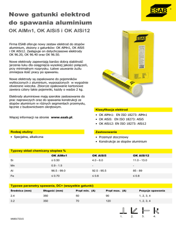 Nowe gatunki elektrod do spawania aluminium OK AlMn1, OK AlSi5 i OK AlSi12 Firma ESAB oferuje nowy zestaw elektrod do stopów aluminium, złożony z gatunków: OK AlMn1, OK AlSi5 i OK AlSi12. Zastępuje on dotychczasowe elektrody OK 96.20, OK 96.40 oraz OK 96.50. Nowe elektrody zapewniają bardzo dobrą stabilność jarzenia łuku dla osiągnięcia wysokiej jakości połączeń, przy minimalnym rozprysku. Łatwe usuwanie żużlu zmniejsza ilość pracy po spawaniu. Nowe elektrody są zapakowane do pojemników wytłoczonych z aluminium, wyposażonych w wygodnie otwierane wieczka. Zbiorcze opakowanie kartonowe zawiera cztery takie pojemniki, każdy o wadze 2 kg. Elektrody aluminiowe mają szerokie zastosowanie do prac naprawczych oraz do spawania konstrukcji ze stopów aluminium w różnych segmentach przemysłu, łącznie z budownictwem okrętowym. Klasyfikacja elektrod • OK AlMn1: EN ISO 18273: AlMn1 Więcej informacji na stronie www.esab.pl. • OK AlSi5: EN ISO 18273: AlSi5 • OK AlSi12: EN ISO 18273: AlSi12 Rodzaj otuliny Zastosowanie • Specjalna, alkaliczna • Przemysł stoczniowy • Konstrukcje ze stopów aluminium Typowy skład chemiczny stopiwa % OK AlMn1 OK AlSi5 OK AlSi12 Si ≤ 0.50 4.0 - 6.0 11.0 - 13.0 Mn 0.9 - 1.5 - - Al 96.5 - 99.0 92.5 - 95.5 85 - 89 Fe ≤ 0.70 ≤ 0.8 ≤ 0.8 Typowe parametry spawania, DC+ (wszystkie gatunki) Średnica (mm) Długość (mm) Prąd min. (A) Prąd max. (A) Pozycje spawania 2.4 350 50 90 1, 2, 3, 4 3.2 350 70 120 1, 2, 3, 4 XA00173315 Zalecane suszenie 120°C, 1h Informacja o opakowaniach i zastąpionych produktach Nr katalogowy Zastąpiony produkt Ilość wewn. opak./karton Waga nowych opakowań 96012430U0 OK 96.20 (96202530S0) 4 4 x 2 kg 96013230U0 OK 96.20 (96203230S0) 4 4 x 2 kg 96022430U0 OK 96.40 (96402530S0) 4 4 x 2 kg 96023230U0 OK 96.40 (96403230S0) 4 4 x 2 kg 96032430U0 OK 96.50 (96502530S0) 4 4 x 2 kg 96033230U0 OK 96.50 (96503230S0) 4 4 x 2 kg Dane do zamówienia Nazwa nowego produktu Ilość elektrod/karton Waga/karton, kg 96012430U0 Paleta, kg OK AlMn1 2.4 x 350 mm 4 x 226 8.0 600 96013230U0 OK AlMn1 3.2 x 350 mm 4 x 150 8.0 600 96022430U0 OK AlSi5 2.4 x 350 mm 4 x 231 8.0 600 96023230U0 OK AlSi5 3.2 x 350 mm 4 x 147 8.0 600 96032430U0 OK AlSi12 2.4 x 350 mm 4 x 230 8.0 600 96033230U0 OK AlSi12 3.2 x 350 mm 4 x 150 8.0 600 Image 2 optional Image 3 optional Wymiary palety: 1200 x 800 mm Wewnętrzne opakowanie wytłoczone jest ze stopu aluminium i ma łatwe do otworzenia wieczko ESAB Polska Sp. z o.o. 40 – 114 Katowice Ul. Ściegiennego 3 NIP 527-26-27-655 KRS 000356431 Nowy karton zawiera cztery wewnętrzne opakowania, każde o wadze 2 kg Kontakt: Tel. +48 32 3511 100 Fax. +48 32 3511 120 E-mail: [email protected] www.esab.pl XA00173315 Firma ESAB zastrzega prawo do zmian w specyfikacji bez powiadomienia Nr katalogowy