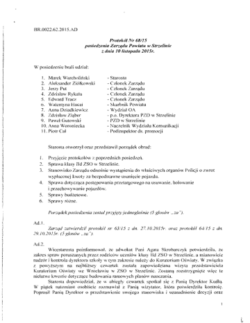 Protokół Nr 68/15 posiedzenia Zarządu Powiatu wStrzelinie Z dnia 10 listopada 2015r. W posiedzeniu brali