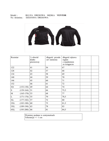 Model .: Tk./ dzianina.: BLUZA DRESOWA MĘSKA VENTOR DZIANINA DRESOWA Rozmiar ½ obwód klatki piersiowej długość przodu od ramienia długość rękawa raglan z mankietem ze ściągacza 122 41 56 67 128 42 57 68 134 43 58 69 140 44 59 70 146 45 60 71 152 46 61 72 XS (153-158) 49 64 74 S (159-164) 51 66 75,5 M (165-170) 53 68 77 L (171-176) 55 70 78,5 XL (177-182) 57 72 80 2XL (183-188) 60 75 81,5 3XL (189-194) 63 78 83 4XL (195-200) 66 81 84,5 Wymiary podane w centymetrach Tolerancja +/- 1 cm