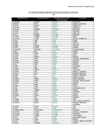 Tabela czasowników nieregularnych 2. Czasowniki mające dwie takie same formy (przeszłą i imiesłowu) Bezokolicznik Forma przeszła to to to to to to to to to to to to to to to to to to to to to to to to to to to to to to to to to to to to to to to to to to to to to awake bend bind breed bring build burn buy catch creep dig feed feel fight find foretell get hang have hear hold keep kneel lay lead leap learn leave lend light lose make mean meet pay read say seek sell send shine sit sleep smell spend awoke bent bound bred brought built burnt bought caught crept dug fed felt fought found foretold got hung had heard held kept knelt laid led lept learnt left lent lit lost made ment met paid read said sought sold sent shone sat slept smelt spent Imiesłów bierny tzn. Past Participle awoke bent bound bred brought built burnt bought caught crept dug fed felt fought found foretold got hung had heard held kept knelt laid led lept learnt left lent lit lost made ment met paid read said sought sold sent shone sat slept smelt spent to to to to to to to to to to stand spit understand strike sweep teach tell weep win think stood spat understood struck swept taught told wept won thought stood spat understood struck swept taught told wept won thought Znaczenie budzić się zgiąć się, skręcać wiązać coś hodować przynieść budować palić coś kupować łapać pełzać, czołgać się kopać karmić czuć się walczyć znaleźć przepowiedzieć dostać wisieć mieć słyszeć trzymać, organizować trzymać klęczeć położyć prowadzić skakać uczuć się opuścić, wyjechać pożyczyć (komuś) zapalić, zaświecać zgubić, stracić robić (wykonać) znaczyć, mieć na myśli spotkać płacić czytać powiedzieć (że) szukać sprzedać wysłać świecić siedzieć spać czuć, zapach, pachnieć spędzać, wydawać pieniądze stać pluć rozumieć uderzyć, strajkować zamiatać uczyć kogoś powiedzieć komuś płakać wygrać, zdobyć zwyciężyć myśleć