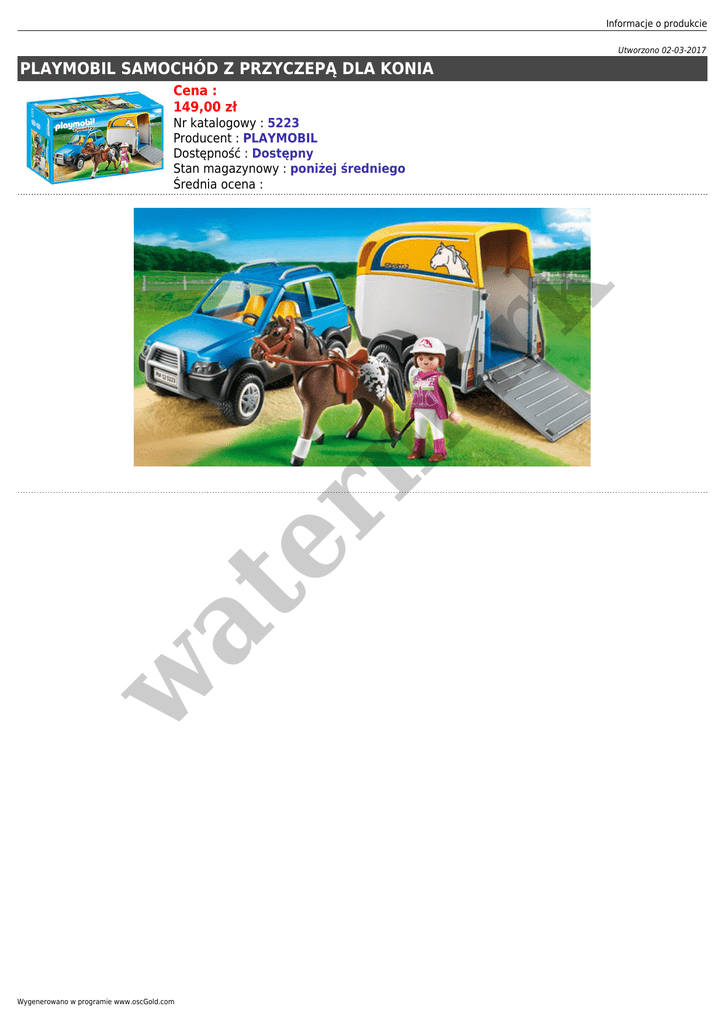 Informacje o produkcie Utworzono 02-03-2017 PLAYMOBIL SAMOCHÓD Z PRZYCZEPĄ DLA KONIA Cena : 149,00 zł w at er m ar k Nr katalogowy : 5223 Producent : PLAYMOBIL Dostępność : Dostępny Stan magazynowy : poniżej średniego Średnia ocena : Wygenerowano w programie www.oscGold.com