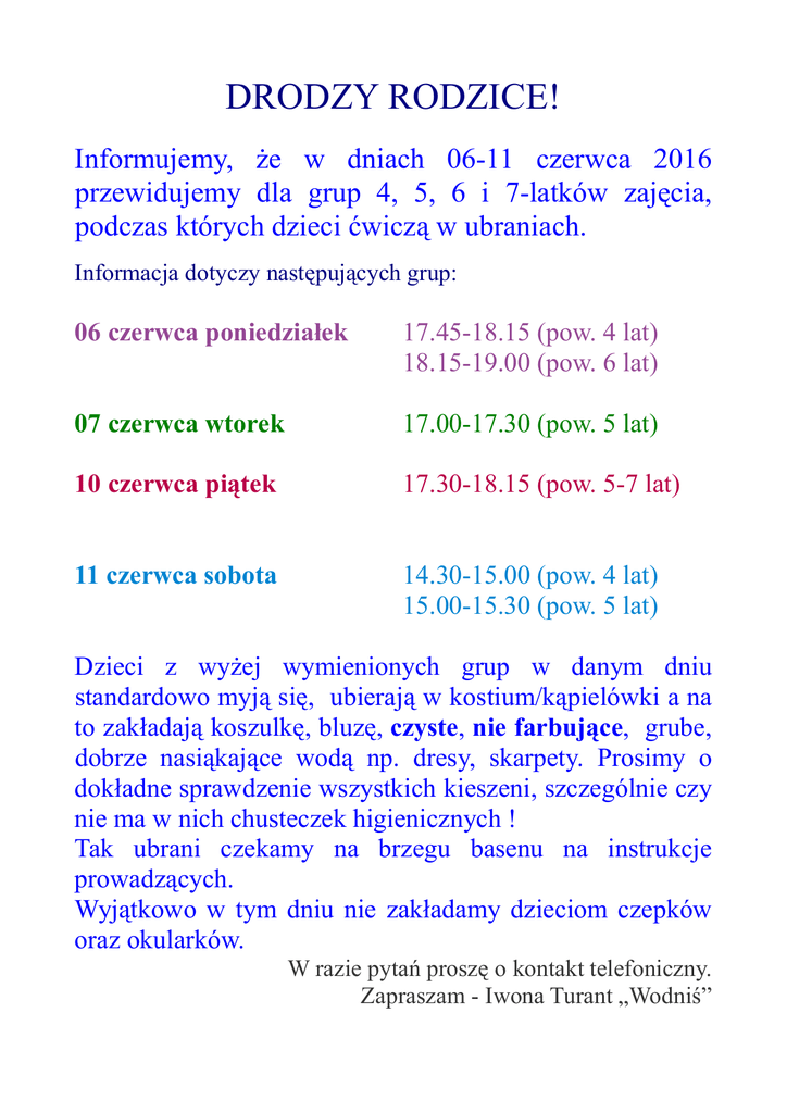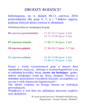 DRODZY RODZICE! Informujemy, że w dniach 06-11 czerwca 2016 przewidujemy dla grup 4, 5, 6 i 7-latków zajęcia, podczas których dzieci ćwiczą w ubraniach. Informacja dotyczy następujących grup: 06 czerwca poniedziałek 17.45-18.15 (pow. 4 lat) 18.15-19.00 (pow. 6 lat) 07 czerwca wtorek 17.00-17.30 (pow. 5 lat) 10 czerwca piątek 17.30-18.15 (pow. 5-7 lat) 11 czerwca sobota 14.30-15.00 (pow. 4 lat) 15.00-15.30 (pow. 5 lat) Dzieci z wyżej wymienionych grup w danym dniu standardowo myją się, ubierają w kostium/kąpielówki a na to zakładają koszulkę, bluzę, czyste, nie farbujące, grube, dobrze nasiąkające wodą np. dresy, skarpety. Prosimy o dokładne sprawdzenie wszystkich kieszeni, szczególnie czy nie ma w nich chusteczek higienicznych ! Tak ubrani czekamy na brzegu basenu na instrukcje prowadzących. Wyjątkowo w tym dniu nie zakładamy dzieciom czepków oraz okularków. W razie pytań proszę o kontakt telefoniczny. Zapraszam - Iwona Turant „Wodniś”