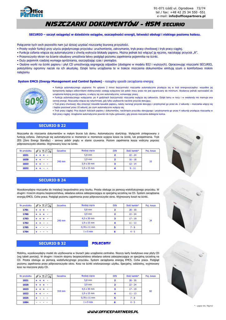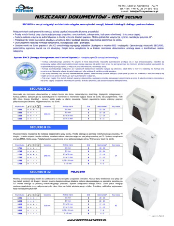 91-071 Łódź ul. Ogrodowa 72/74 tel / fax: +48 42 25 34 550 -551 e-mail: [email protected] NISZCZARKI DOKUMENTÓW - HSM SECURIO SECURIO – szczyt osiągnięć w dziedzinie osiągów, oszczędności energii, łatwości obsługi i niskiego poziomu hałasu. Połączenie tych cech pozwoliło nam już dzisiaj uzyskać niszczarkę biurową przyszłości. • Prosty wybór funkcji przy użyciu pojedynczego przycisku: uruchomienie, zatrzymanie, tryb pracy chwilowej i tryb pracy ciągłej. • Funkcja cofania włącza się automatycznie z chwilą wykrycia blokady papieru. Można jednak też włączyć ją ręcznie, naciskając przycisk „R”. • Przezroczysty ekran na ścianie obudowy umożliwia łatwy podgląd poziomu zapełnienia pojemnika na ścinki. • Duży pojemnik rzadziej wymaga opróżniania, oszczędzając czas i pieniądze. • Osobne worki na ścinki papieru i płyt CD umożliwiają segregację odpadów (dostępne w modelu B32 i wyższych). Opracowując niszczarki SECURIO, położyliśmy ogromny nacisk na ich akustykę. Dzięki temu urządzenia te w trakcie niszczenia dokumentów emitują szum o komfortowo niskim natężeniu System EMCS (Energy Management and Control System) - rozsądny sposób zarządzania energią: • Funkcja automatycznego usypiania: Po upływie 2 minut bezczynności niszczarka automatycznie przełącza się w tryb energooszczędny: wszystkie jej komponenty będące odbiornikami elektryczności zostają wyłączone lub pobór mocy przez nie jest ograniczany do minimum. Wystarczy jednak wprowadzić do urządzenia kolejną porcję papieru, a włączy się ono automatycznie, wznawiając pracę. • Funkcja automatycznego wyłączania: po 4 godzinach bezczynności niszczarka wyłącza się całkowicie. Dzięki temu w nocy i w weekendy nie marnuje ona cennej energii. Niszczarka włącza się natychmiast, gdy tylko użytkownik naciśnie przycisk sterujący. • Tryb pracy chwilowej: Aby zniszczyć niewielki kawałek papieru, należy nacisnąć przycisk sterujący i przytrzymać go przez ok. 2 sekundy – niszczarka włączy się i będzie pracować przez 10 sekund, po czym automatycznie wyłączy się. • Tryb pracy ciągłej: Przy dużych ilościach papieru i dokumentów, naciśnięcie przycisku sterującego i przytrzymanie go przez 4 sekundy przełącza niszczarkę w tryb pracy ciągłej. Urządzenie automatycznie powróci do trybu gotowości, gdy proces niszczenia dobiegnie końca. SECURIO B 22 Niszczarka do niszczenia dokumentów w małym biurze lub domu. Automatyczny start/stop. Wyłącznik zintegrowany z funkcją cofania. Zatrzymuje się automatycznie w momencie w momencie wyjęcia kosza na ścinki, lub przepełnienia. Tryb ZES (Zero Energy Standby) - zerowy pobór prądu w stanie czuwania. Poziom zapełnienia kosza widiczny poprzez półprzezroczyste okienko. Wyjmowany kosz na ścinki. Nr produktu Szczelina Rodzaj cięcia DIN Ilość kartek* 5,8 mm 2 22 - 24 3,9 mm 2 16 - 18 3,9 x 30 mm 3 12 - 14 4 9 - 11 1831 + + + - 1830 + + - - 1833 + + - - 1832 + + - - 1,9 x 15 mm 240 mm Poj. kosza 33 SECURIO B 24 Wysokowydajna niszczarka do instalacji bezpośrednio przy biurku. Prosta obsługa za pomocą wielofukcyjnego przycisku. W drugim i trzecim stopniu bezpieczeństwa, składana osłona zabezpieczająca ze specjalną szczeliną na CD. System zarządzania energią EMCS. Cicha praca. Podgląd poziomu zapełnienia przez półprzezroczyste okno. Wyjmowany koszt na ścinki. Rodzaj cięcia DIN Ilość kartek* 5,8 mm 2 28 - 30 - 3,9 mm 2 22 - 24 - 4,5 x 30 mm 3 17 - 19 - 1,9 x 15 mm 4 11 - 13 - - 0,78 x 11 mm 5 7-8 - - 1 x 5 mm 6 4-5 Nr produktu Szczelina 1781 + + + - 1780 + + + 1783 + + + 1782 + + - 1785 + - 1784 + - 240 mm SECURIO B 32 Poj. kosza 34 polecamy Mobilny, wysokowydajny model do użytkowania w biurach jako urządzenie centralne. Niszczy karty kredytowe oraz płyty CD (wg tabeli poniżej). W drugim i trzecim stopniu bezpieczeństwa składana osłona zabezpieczająca ze specjalną szczeliną na CD. Prosta obsługa za pomocą wielofunkcyjnego przycisku. System zarządzania energią EMCS. Cicha praca. Podgląd poziomu zapełnienia przez półprzezroczyste okno. Kosz na ścinki wielorazowego użytku. Specjalny, oddzielny, wyjmowany kosz na niszczone płyty CD. Rodzaj cięcia DIN Ilość kartek* 5,8 mm 2 28 - 30 - 3,9 mm 2 22 - 24 - 4,5 x 30 mm 3 17 - 19 - 1,9 x 15 mm 4 11 - 13 - - 0,78 x 11 mm 5 7-8 - - 1 x 5 mm 6 4-5 Nr produktu Szczelina 1821 + + + - 1820 + + + 1823 + + + 1822 + + 1825 + - 1884 - - - 310 mm Poj. kosza 82 * - papier A4, 70g/m2 www.officepartners.pl 91-071 Łódź ul. Ogrodowa 72/74 tel / fax: +48 42 25 34 550 -551 e-mail: [email protected] NISZCZARKI DOKUMENTÓW - HSM SECURIO B 34 Mobilny, wysokowydajny model do użytkowania w biurach jako urządzenie centralne. Niszczy karty kredytowe jak również płyty CD. W drugim i trzecim stopniu bezpieczeństwa składana osłona zabezpieczająca ze specjalną szczeliną na CD. Prosta obsługa za pomocą wielofunkcyjnego przycisku. System zarządzania energią EMCS. Cicha praca. Podgląd poziomu zapełnienia przez półprzezroczyste okno. Kosz na ścinki wielorazowego użytku. Specjalny, oddzielny, wyjmowany kosz na niszczone płyty CD. Nr produktu Szczelina 1841 + + + + 1840 + + + - 1843 + + + - 1842 + + - 1844 - - - Rodzaj cięcia DIN Ilość kartek* 5,8 mm 2 30 - 32 3,9 mm 2 25 - 27 4,5 x 30 mm 3 20 - 22 - 1,9 x 15 mm 4 13 - 14 - 1 x 5 mm 6 5-6 310 mm Poj. kosza 100 P 36 Mobilny, wysokowydajny model dla całych departamentów lub pięter biurowych. Z łatwością niszczy karty kredytowe jak również płyty CD i dyskietki. Obsługa za pomoca wielofunkcyjnego przycisku, zintegrowanego z blokadą bezpieczeństwa. Składana osłona bezpieczeństwa z czujnikiem dotyku. Wyposażona w system automatycznego oliwienia noży tnących (wersje niszczące na ścinki). System EMCS. Pojemny kosz na ścinkiwielorazowego użytku. Podgląd poziomu zapełnienia przez półprzezroczyste okno. Specjalny oddzielny kosz n