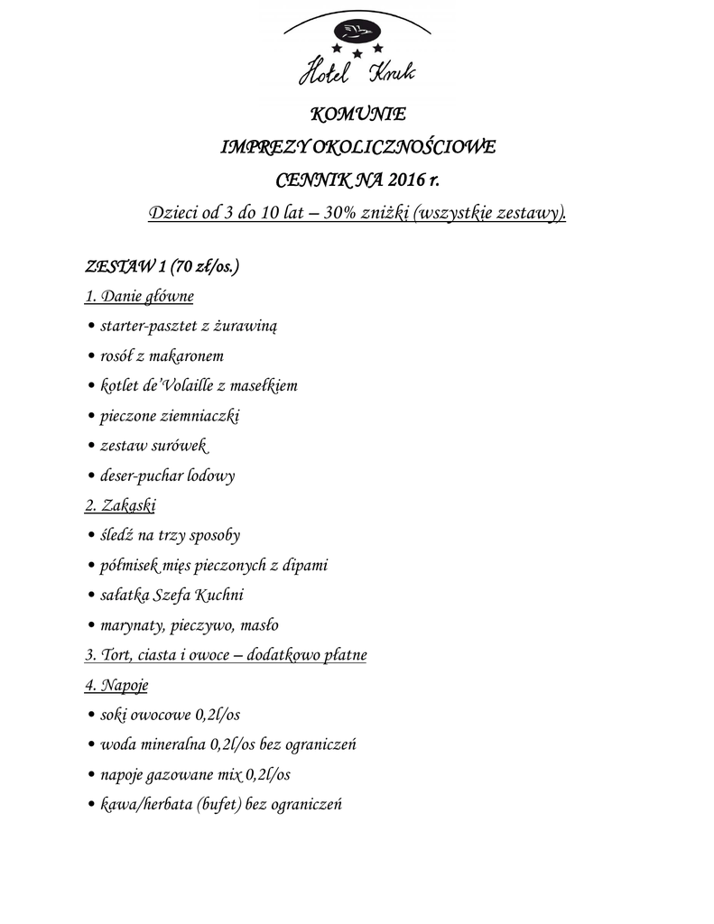 KOMUNIE IMPREZY OKOLICZNOŚCIOWE CENNIK NA 2016 r. Dzieci od 3 do 10 lat – 30% zniżki (wszystkie zestawy). ZESTAW 1 (70 zł/os.) 1. Danie główne • starter-pasztet z żurawiną • rosół z makaronem • kotlet de’Volaille z masełkiem • pieczone ziemniaczki • zestaw surówek • deser-puchar lodowy 2. Zakąski • śledź na trzy sposoby • półmisek mięs pieczonych z dipami • sałatka Szefa Kuchni • marynaty, pieczywo, masło 3. Tort, ciasta i owoce – dodatkowo płatne 4. Napoje • soki owocowe 0,2l/os • woda mineralna 0,2l/os bez ograniczeń • napoje gazowane mix 0,2l/os • kawa/herbata (bufet) bez ograniczeń ZESTAW 2 (70 zł/os.) 1. Danie główne • starter-carpaccio z kurczaka z sosem tatarskim • rosół z makaronem • pieczeń z karkówki w sosie pieczeniowo-pieprzowym • deser-puchar lodowy 2. Zakąski • śledź na trzy sposoby • półmisek mięs pieczonych z dipami • sałatka Szefa Kuchni • marynaty, pieczywo, masło 3. Tort, ciasta i owoce – dodatkowo płatne 4. Napoje • soki owocowe 0,2l/os • woda mineralna 0,2l/os bez ograniczeń • napoje gazowane mix 0,2l/os • kawa/herbata (bufet) bez ograniczeń ZESTAW 3 (100 zł/os.) 1. Danie główne • starter-tymbaliki z szynki • rosół z makaronem • faszerowane zraziki z karkówki • ziemniaki z wody • bukiet warzyw • deser-panna cotta 2. Zakąski • śledź na trzy sposoby • półmisek mięs pieczonych z dipami • jajka na trzy sposoby • ozorki po polsku w galarecie • sałatka Monte z grillowanym kurczakiem • marynaty, pieczywo, masło 3. Drugi posiłek gorący • Strogonow wołowy 4. Tort, ciasta i owoce – dodatkowo płatne 5. Napoje • soki owocowe 0,25l/os • woda mineralna 0,25l/os bez ograniczeń • napoje gazowane mix 0,25l/os • kawa/herbata (bufet) bez ograniczeń ZESTAW 4 (100 zł/os.) 1.Danie główne • starter-mini tatar z łososia • włoska zupa pomidorowa z bazylią • roladki z kurczaka ze szpinakiem i mozarellą • puree ziemniaczane • marchewka paryska • deser-puchar lodowy 2. Zakąski • śledź na trzy sposoby • półmisek mięs pieczonych z dipami • jajka na trzy sposoby • schab pieczony z chrzanem i jabłkami • sałatka Caltanisetta na słodko z kurczakiem • marynaty, pieczywo, masło 3. Drugi posiłek gorący • Gulaszowa węgierska 4. Tort, ciasta i owoce – dodatkowo płatne 5. Napoje • soki owocowe 0,25l/os • woda mineralna 0,25l/os bez ograniczeń • napoje gazowane mix 0,25l/os • kawa/herbata (bufet) bez ograniczeń ZESTAW 5 (120 zł/os.) 1. Danie główne • starter-mini tatar z wołowiny • rosół z kołdunami litewskimi • polędwiczki wieprzowe w sosie z zielonego pieprzu • kopytka • chrupiące warzywka • deser-puchar lodowy z owocami 2. Zakąski • śledź na trzy sposoby • półmisek mięs pieczonych z dipami oraz szlachetne wędliny • galantyna z drobiu z bakaliami • rolada z kurczaka ze szpinakiem zawijana w szynce parmeńskiej • jajka z musem łososiowym • sałatka warstwowa z szynką • pasztet z orzechami i żurawiną • marynaty, pieczywo, masło 3. Drugi posiłek gorący • filet drobiowy a’la Ciaciatore w sosie pomidorowym z pieczarkami podawany z gotowanymi ziemniakami 4. Trzeci posiłek gorący • barszczyk czerwony z uszkami 5. Tort, ciasta i owoce – dodatkowo płatne 6. Napoje • soki owocowe 0,3l/os • woda mineralna 0,3l/os bez ograniczeń • napoje gazowane mix 0,3l/os • kawa/herbata (bufet) bez ograniczeń ZESTAW 6 (120 zł/os.) 1.Danie główne • starter-carpaccio z łososia marynowanego w buraczkach • włoska zupa pomidorowa z bazylią • zrazy wołowe nadziewane suszonymi grzybami w boczku pieczone • kluski śląskie • buraczki zasmażane • deser-puchar lodowy 2. Zakąski • śledź na trzy sposoby • półmisek mięs pieczonych z dipami • rolada z łososia z mozzarellą i rukolą • schab w galarecie z mandarynkami • jajka z musem chrzanowym • sałatka szwajcarska • pasztet z kaczki z sosem malinowym • marynaty, pieczywo, masło 3. Drugi posiłek gorący • fileciki z kurczaka w bazylikowo-winogronowym sosie podawane z bukietem warzyw i ziemniaczkami z wody 4. Trzeci posiłek gorący • bulion z knedlikami drobiowymi 5. Tort, ciasta i owoce – dodatkowo płatne 6. Napoje • soki owocowe 0,3l/os • woda mineralna 0,3l/os bez ograniczeń • napoje gazowane mix 0,3l/os • kawa/herbata (bufet) bez ograniczeń Istnieje możliwość indywidualnego menu i jego wyceny.