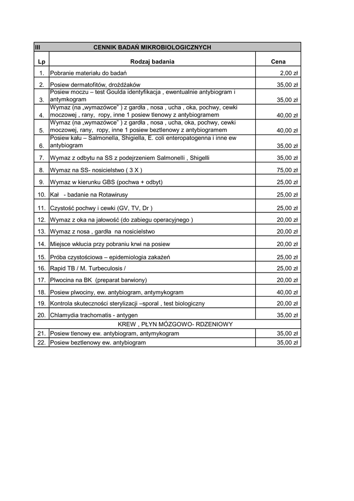 III CENNIK BADAŃ MIKROBIOLOGICZNYCH Lp Rodzaj badania