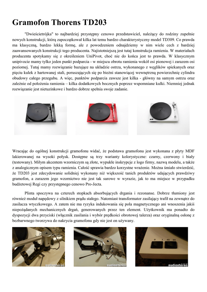 Gramofon Thorens TD203 "Dwieścietrójka" to najbardziej przystępny cenowo przedstawiciel, należący do rodziny zupełnie nowych konstrukcji, którą zapoczątkował kilka lat temu bardzo charakterystyczny model TD309. Co prawda ma klasyczną, bardzo lekką formę, ale z powodzeniem odnajdziemy w nim wiele cech z bardziej zaawansowanych konstrukcji tego producenta. Najistotniejszą jest tutaj konstrukcja ramienia. W materiałach producenta spotykamy się z określeniem UniPivot, choć nie do końca jest to prawda. W klasycznym unipivocie mamy tylko jeden punkt podparcia - w miejscu obrotu ramienia wokół osi pionowej i zarazem osi poziomej. Tutaj mamy rozwiązanie bazujące na układzie ostrza, wykonanego z węglików spiekanych oraz pięciu kulek z hartowanej stali, poruszających się po bieżni stanowiącej wewnętrzną powierzchnię cylindra obudowy całego przegubu. A więc, punktów podparcia zawsze jest kilka - główny na samym ostrzu oraz zależnie od położenia ramienia – kilka dodatkowych bocznych poprzez wspomniane kulki. Niemniej jednak rozwiązanie jest nietuzinkowe i bardzo dobrze spełnia swoje zadanie. Wracając do ogólnej konstrukcji gramofonu widać, że podstawa gramofonu jest wykonana z płyty MDF lakierowanej na wysoki połysk. Dostępne są trzy warianty kolorystyczne: czarny, czerwony i biały (testowany). Miłym akcentem wzorniczym są złote, wypukłe inskrypcje z logo firmy, nazwą modelu, a także z analogicznym opisem typu ramienia. Całość sprawia bardzo korzystne wrażenie. Można śmiało stwierdzić, że TD203 jest zdecydowanie solidniej wykonany niż większość tanich produktów udających prawdziwy gramofon, a zarazem jego wzornictwo nie jest tak surowe w wyrazie, jak to ma miejsce w przypadku budżetowej Regi czy przystępnego cenowo Pro-Jecta. Plinta spoczywa na czterech stopkach absorbujących drgania i rezonanse. Dobrze tłumiony jest również moduł napędowy z silnikiem prądu stałego. Natomiast transformator zasilający trafił na zewnątrz do zasilacza wtyczkowego. A zatem nie ma ryzyka indukowania się pola magnetycznego ani wnoszenia jakiś niepożądanych mechanicznych drgań, generowanych przez ten element. Użytkownik ma ponadto do dyspozycji dwa przyciski (włącznik zasilania i wybór prędkości obrotowej talerza) oraz oryginalną osłonę z bezbarwnego tworzywa do nakrycia gramofonu gdy nie jest on używany. Firmowa wkładka, określona jako TPU257 przypomina jako żywo najtańszy model Audiotechniki ponoć modyfikowany na potrzeby tego gramofonu (Producent deklaruje, że masa efektywna ramienia TP82 wynosi 11 g). Tak czy owak, wkładka w zupełności "wystarcza" na początek i nie tylko. Można ją nabyć jako część zamienną w sytuacji gdyby oryginalna już się by zużyła. Wyprowadzenie sygnału następuje przez standardowy przewód dołączony na stałe i zakończony typowymi cinchami. Rozwiązanie skuteczne i nie degradujące w żadnej mierze delikatnego sygnału wyjściowego. Cinchom towarzyszy naturalnie przewód GND, który należy podpiąć pod stosowny zacisk we wzmacniaczu lub przedwzmacniaczu gramofonowym. Deklaracja "Plug and Play" ma tutaj także inny wymiar, sprowadzający się do braku możliwości upgrade'u. Konfiguracja: Wzmacniacz Rotela nie został wybrany do testu całkiem przypadkowo. Po pierwsze, z nieoficjalnych źródeł wiadomo, że znany europejski producent wkładek gramofonowych - Ortofon - testuje swoje wkładki typu MM właśnie na wejściach gramofonowych znajdujących się na pokładzie wzmacniaczy Rotela. Wejścia te wykorzystują niskoszumne wzmacniacze operacyjne dedykowane do zastosowań w audio oraz korekcję RIAA umieszczoną w pętli ujemnego sprzężenia zwrotnego w konfiguracji nieodwracającej. Rozwiązanie takie gwarantuje to czysty, dynamiczny dźwięk pozbawiony zniekształceń i szumu. Po drugie, walory brzmieniowe tego modelu wyznaczają poziom odniesienia dla urządzeń z zakresu cenowego 2-4 tys. zł, dedykowanych zarówno dla zaawansowanych, jak i początkujących audiofilów. Podobnie zestawy głośnikowe PSB Imagine X1T, jako naturalne środowisko pracy wzmiankowanego wzmacniacza. Brzmienie: Większość przystępnych cenowo urządzeń ma wyraźnie zaakcentowaną sygnaturę brzmieniową. Tak też jest w przypadku testowanego gramofonu. TD203 nie należy do grupy produktów, którym można wytknąć coś konkretnego. Natomiast z pewnością jest za co go chwalić. Niewątpliwie jest starannie i w przemyślany sposób opracowany nie tylko od strony wizualnej, ale także pod względem sonicznym. Jego estetyka brzmieniowa opiera się na silnej podstawie basowej i ciepłej barwie. Osiągnięto dobrą równowagę tonalną i wypełnienie poszczególnych dźwięków. Żaden z zakresów nie jest przerysowany. Żadnemu też niczego nie ujęto. Nie mniej jednak łatwa jest do wychwycenia pewna maniera, z którą TD203 interpretuje nagrania. Nie jest to granie wyczynowe, epatujące słuchacza ogromem detali i szybkością oddawania transjentów. Jest za to bardzo miłe dla uszu, wręcz fizjologiczne, a przy tym bardzo wciągające. Niezależnie od gatunku muzyki słuchanie płyt sprawia przyjemność i oto przede wszystkim chodzi... Konkluzja: TD203 to propozycja głównie dla osób wracających po latach do analogu. Mogą się nim zainteresować także esteci szukający ładnie wykonanego i przyjemnie brzmiącego gramofonu w przystępnej cenie. W naszym odczuciu wart jest każdej złotówki i stąd w pełni zasłużona rekomendacja. Dane techniczne: napęd: paskowy z subtalerzem pośrednim prędkości: 33 1/3 oraz 45 obr./min. talerz: wykonany z ABS, średnica 304,8 mm (12 cali), masa 0,8 kg ramię: Thorens TP 82, długość efektywna 228,6 mm (9 cali) wymiary (szer. x głęb. x wys.): 400 x 320 x 93 mm masa: 3,53 kg Co było grane (kolejność alfabetyczna): Chris Rea, Looking For The Summer, z albumu Auberge, eastwest records 1991 Deep Purple, Knocking At Your Back Door, z alb