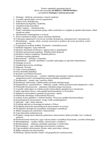 Zestaw zagadnień egzaminacyjnych dla II roku kierunku OCHRONA ŚRODOWISKA z przedmiotu Ekologia i ochrona przyrody Ekologia - definicja, powiązania z innymi naukami. Czynniki ograniczające rozwój organizmów. Pojęcie niszy ekologicznej. Scharakteryzuj higrofity i hydrofity. Charakterystyka kserofitów. Epifity i pnącza – charakterystyka. Podaj i scharakteryzuj poznane grupy roślin wydzielane ze względu na sposób odżywiania i skład chemiczny gleby. 8. Mechanizmy termoregulacji u zwierząt. 9. Prawo minimum Liebiga i prawo tolerancji Shelforda. 10. Tolerancja organizmów żywych na czynniki ekologiczne; stenotypowość i eurytypowość. 11. Bioindykacja – zasady, zalety, systemy stosowane w praktyce do oceny powietrza, wody i powierzchni ziemi. 12. Typologiczny podział siedlisk. Wymienić i scharakteryzować. 13. Siedlisko bagienne. Typy torfowisk. 14. Sposoby określania liczebności i zagęszczenia w populacjach. 15. Struktura przestrzenna populacji. Współczynnik dyspersji. 16. Struktura wiekowa populacji. Struktura płciowa. 17. Struktura socjalna populacji. 18. Rozrodczość – definicja i wskaźniki. 19. Śmiertelność – sposoby określania i czynniki wpływające na zjawisko śmiertelności. 20. Strategie życiowe. 21. Gradacje (przyczyny, przebieg). 22. Migracje. Inwazje. 23. Typy wzrostu populacji. 24. Fazy dynamiki populacji. 25. Kryteria wyróżniania biocenoz. 26. Zależności biocenotyczne – wymień i zdefiniuj najważniejsze rodzaje zależności antagonistycznych i nieantagonistycznych pomiędzy populacjami. 27. Konkurencja – zasady, typy, możliwe efekty. 28. Dominacja, frekwencja, współczynnik znaczenia ekologicznego. 29. Drapieżnictwo i pasożytnictwo – definicja, zasady. Omów przystosowania drapieżców i ofiar. 30. Wskaźniki biocenotyczne – parametry charakteryzujące biocenozę. 31. Czynniki wpływające na zróżnicowanie różnorodności gatunkowej w przestrzeni. 32. Jakie zagrożenia niesie z sobą spadek bioróżnorodności w Przyrodzie. 33. Składowe różnorodności gatunkowej (poziomy i skale). 34. Wskaźniki określające różnorodność biocenoz. 35. Zmiany liczby gatunków w historii biosfery. Przyczyny spadku bioróżnorodności. 36. Synantropizacja ekosystemów. Grupy roślin synantropijnych. 37. Sukcesja – typy i etapy sukcesji. 38. Przebieg sukcesji na zarastających polach w Polsce. 39. Produkcja pierwotna najważniejszych ekosystemów na świecie. 40. Wydajności ekologiczne (asymilacji, konsumpcji i produkcji). 41. Bilans energetyczny autotrofów i heterotrofów. 42. Typy łańcuchów pokarmowych. 43. Przepływ energii przez łańcuchy pokarmowe ekosystemów lądowych (łąka, las) i wodnych (jezioro). 44. Promieniowanie słoneczne i jego wykorzystanie w produkcji ekosystemu, czynniki różnicujące. 45. Biomanipulacje – zasada, rodzaje, zastosowanie w praktyce. 46. Bioakumulacja – definicja, przykłady spotykane w środowisku. 47. Bioremediacje – typy technologii stosowanych w praktyce. 48. Typy produkcji ekosystemów (brutto, netto, pierwotna, wtórna). 49. Bilans energetyczny heterotrofów. 50. Definicja i geneza biomów Ziemi i ich geograficzne rozmieszczenie. 1. 2. 3. 4. 5. 6. 7. 51. Lasy liściaste jako biom formacji roślinnej, rozmieszczenie, obszar, zróżnicowanie fito- i zoologiczne. 52. Dżungla tropikalna jako biom formacji leśnej, rozmieszczenie, obszar, specyfika warunków siedliskowych, zróżnicowanie gatunkowe. 53. Stepy, lasostepy i sawanny jako biomy, rozmieszczenie, obszar, zróżnicowanie warunki siedliskowe. 54. Specyficzne cechy środowiska wodnego. Porównanie warunków w środowisku morskim i słodkowodnym. 55. Grupy ekologiczne organizmów wodnych. 56. Sukcesja ekosystemów wodnych. Mechanizm eutrofizacji wód. 57. Typy troficzne ekosystemów wodnych. 58. Typy miktyczne ekosystemów wodnych. 59. Ekosystem leśny – struktura i funkcje. 60. Specyfika funkcjonowania agroekosytemów. 61. Unikatowe krajobrazy Polski na tle Europy. 62. Krajobraz pobrzeża południowo-bałtyckiego. 63. Krajobraz pojezierza południowo- i wschodnio-bałtyckiego. 64. Krajobraz rozległych nizin Polski. 65. Krajobraz wyżyn Polski. 66. Krajobraz górski Polski. 67. Rozwój ochrony przyrody, jej twórcy, zakres i związki z innymi naukami. 68. Akty prawne dotyczące ochrony przyrody w Polsce. 69. Prawno-organizacyjne podstawy ochrony przyrody w świecie (Światowa Karta Przyrody, ważniejsze konwencje i ustawy). 70. IUCN – działalność, komisje, priorytety. 71. WWF – działalność, osiągnięcia. 72. UNESCO MaB i Program Światowego Dziedzictwa – opisać działalność, wymienić jakie są na terenie Polski. 73. EEA – opisać działalność, struktura. 74. Greenpeace – działalność, osiągnięcia. 75. Birdlife International - działalność. 76. Inne inicjatywy międzynarodowe z zakresu ochrony przyrody – ProGeo, Stowarzyszenie Przyjaciół Ziemi, Młodzież a Środowisko Europy, Młodzieżowa Akcja Leśna. 77. Struktura organizacyjna ochrony przyrody w Polsce – zadania poszczególnych organów administracyjnych. 78. Organy doradcze i opiniodawcze w ochronie przyrody w Polsce. 79. Przestrzenne formy ochrony przyrody w Polsce. 80. Wymienić wszystkie parki narodowe w Polsce i opisać ich status międzynarodowy, omówić wybrany. 81. Indywidualne formy ochrony zasobów przyrody. 82. Ochrona gatunkowa roślin i grzybów (podstawa prawna, ochrona całkowita i częściowa, zakazy dla roślin i grzybów objętych ochroną ścisłą, przykładowe gatunki). 83. Ochrona gatunkowa zwierząt (podstawa prawna, ochrona całkowita, zakazy dla zwierząt objętych ochroną ścisła, przykładowe gatunki). 84. Czerwone księgi i listy roślin wymarłych i zagrożonych (przyczyny wymierania, działy i kategorie zagrożeń, przykładowe gatunków). 85. Czerwone księgi i listy zwierząt wymarłych i zagrożonych (przyczyny wymierania, działy i kategorie zagrożeń, przykładowe gatunków). 86. Międzynarodow