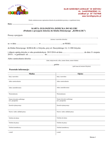 KLUB DZIECIĘCY„KORALIK” W GIŻYCKU UL. DASZYŃSKIEGO 14, [email protected] 87 7327908 www.koralikgizycko.pl Osoby zainteresowane zapisaniem dziecka do przedszkola prosimy o wypełnienie karty. Data: ……………………………. KARTA ZGŁOSZENIA DZIECKA DO KLUBU (Podanie o przyjęcie dziecka do Klubu Dziecięcego „KORALIK”) Proszę o przyjęcie …………………………………………………………………………………………………….…….., (imiona i nazwisko dziecka) ur. w dniu …………………………… w …………………………., nr PESEL ………………………………… do Klubu Dziecięcego KORALIK w Giżycku, przy ul. Daszyńskiego 14, 11-500 Giżycko i objęcie opieką dziecka w roku przedszkolnym 2015/2016 od dnia ......………….................... do dnia 31 sierpnia 2016 r. w godzinach od ………………….. do……………………………. Adres zamieszkania dziecka: ………………………………………………………………………………………... (kod, miejscowość, ulica, numer domu, numer lokalu) ………….………………………………………………., gmina ……………….………............................................ (jeśli inna niż miasto Giżycko) Pozostałe informacje: Matka Ojciec Imię i nazwisko: Imię i nazwisko: Adres zamieszkania: Adres zamieszkania: Adres zameldowania: Adres zameldowania: Wykształcenie: Wykształcenie: Numer dowodu osobistego (ew. paszportu) Numer dowodu osobistego (ew. paszportu) Zawód wykonywany: Zawód wykonywany: Nazwa i adres zakładu pracy: Nazwa i adres zakładu pracy: Telefon do domu: Telefon do domu: Telefon do pracy: Telefon do pracy: Telefon komórkowy: Telefon komórkowy: e-mail: e-mail: Strona 1 KLUB DZIECIĘCY„KORALIK” W GIŻYCKU UL. DASZYŃSKIEGO 14, [email protected] 87 7327908 www.koralikgizycko.pl Osoby upoważnione do odbioru dziecka (poza Rodzicami zgłoszonymi na pierwszej stronie): Imię i nazwisko: Nr dokumentu: Imię i nazwisko: Nr dokumentu: Imię i nazwisko: Nr dokumentu: Dane na temat dziecka: Jak dziecko lubi być nazywane? Czy dziecko uczęszczało już do przedszkola? TAK / NIE Ew. Przyczyny zmiany klubu/żłobka: TAK / NIE W jakich godzinach: Jakie są ulubione zabawy dziecka, czym się interesuje, co lubi robić? Czy dziecko śpi w ciągu dnia? Jakie są przyzwyczajenia związane z usypianiem? Czy dziecko jest leworęczne? TAK / NIE Czy dziecko często choruje TAK / NIE Czy dziecko sygnalizuje swoje potrzeby? Jeśli tak to w jaki sposób? TAK / NIE Najczęstsze choroby: Jedzenie Picie Spanie Złe samopoczucie Przebyte choroby zakaźne Jak dziecko reaguje w przypadku gorączki? Czy dziecko korzysta z toalety? Jeśli korzysta - w jaki sposób sygnalizuje potrzebę? Strona 2 KLUB DZIECIĘCY„KORALIK” W GIŻYCKU UL. DASZYŃSKIEGO 14, [email protected] 87 7327908 www.koralikgizycko.pl Czy dziecko miało wypadek/ki? ew. jakie TAK / NIE Czy dziecko jest uczulone? ew. na co? TAK / NIE Informacje rodzeństwie (liczba, wiek): TAK / NIE Czy dziecko je samodzielnie ? Ulubione potrawy: Potrawy, których nie lubi: Rodzeństwo Ulubiona bajka Czy dziecko jest wychowywane przez jednego rodzica? TAK / NIE Dodatkowe informacje o dziecku i rodzinie mogące wpłynąć na funkcjonowanie dziecka w przedszkolu (stan zdrowia, ewentualne potrzeby specjalne itp.) Zobowiązuję się do regularnego uiszczania- zgodnie ze statutem, regulaminem oraz umową Klubu Dziecięcego Koralik należnej ode mnie opłaty z tytułu korzystania dziecka z klubu ( opłata stała , opłata za wyżywienie). Oświadczam, że biorę na siebie pełną odpowiedzialność prawną za bezpieczeństwo dziecka od chwili odebrania go z palcówki przez upoważnione przeze mnie osoby. Oświadczam, że w sytuacji zagrożenia zdrowia lub życia mojego dziecka, wyrażam zgodę na wezwanie pogotowia oraz konieczne zabiegi medyczne. Oświadczam, że wyrażam zgodę na umieszczanie zdjęć mojego dziecka na stronie internetowej www.koralikgizycko.pl Wyrażam zgodę na zbieranie, przetwarzanie i wykorzystanie w celach związanych z przyjęciem i pobytem w przedszkolu naszego dziecka, danych osobowych naszych i dziecka oraz upoważnionych do odbioru dziecka osób, przez Dyrektora i Kierownika Klubu zgodnie z ustawą z dnia 29 sierpnia 1997 r. o ochronie danych osobowych. ……………………………………………. Giżycko, dnia …………………………………… Podpis rodzica/ opiekuna Strona 3