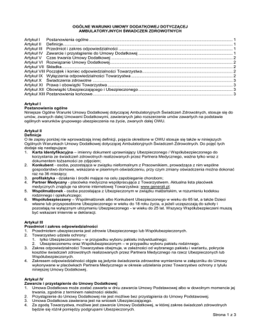 OGÓLNE WARUNKI UMOWY DODATKOWEJ DOTYCZĄCEJ AMBULATORYJNYCH ŚWIADCZEŃ ZDROWOTNYCH Artykuł I Postanowienia ogólne .................................................................................................................... 1 Artykuł II Definicje......................................................................................................................................... 1 Artykuł III Przedmiot i zakres odpowiedzialności ............................................................................................ 1 Artykuł IV Zawarcie i przystąpienie do Umowy Dodatkowej ............................................................................ 1 Artykuł V Czas trwania Umowy Dodatkowej .................................................................................................. 2 Artykuł VI Rozwiązanie Umowy Dodatkowej................................................................................................... 2 Artykuł VII Składka.......................................................................................................................................... 2 Artykuł VIII Początek i koniec odpowiedzialności Towarzystwa......................................................................... 2 Artykuł IX Wyłączenia odpowiedzialności Towarzystwa .................................................................................. 2 Artykuł X Świadczenia zdrowotne ................................................................................................................. 3 Artykuł XI Prawa i obowiązki Towarzystwa ..................................................................................................... 3 Artykuł XII Obowiązki Ubezpieczającego i Ubezpieczonego ............................................................................ 3 Artykuł XIII Postanowienia końcowe................................................................................................................. 3 Artykuł I Postanowienia ogólne Niniejsze Ogólne Warunki Umowy Dodatkowej dotyczącej Ambulatoryjnych Świadczeń Zdrowotnych, stosuje się do umów, zwanych dalej Umowami Dodatkowymi, zawieranych jako rozszerzenie umów zawartych na podstawie ogólnych warunków grupowego ubezpieczenia na życie, zwanych dalej OWU. Artykuł II Definicje O ile zapisy poniżej nie wprowadzają innej definicji, pojęcia określone w OWU stosuje się także w niniejszych Ogólnych Warunkach Umowy Dodatkowej dotyczącej Ambulatoryjnych Świadczeń Zdrowotnych. Do pojęć tych dodaje się następujące: 1. Karta Identyfikacyjna – imienny dokument uprawniający Ubezpieczonego / Współubezpieczonego do korzystania ze świadczeń zdrowotnych realizowanych przez Partnera Medycznego, ważna tylko wraz z dokumentem tożsamości ze zdjęciem; 2. Konkubent - osoba, pozostająca w związku nieformalnym z Pracownikiem, prowadząca z nim wspólne gospodarstwo domowe, wskazana w pisemnym oświadczeniu, przy czym zmiany oświadczenia można dokonać raz na 36 miesięcy; 3. profilaktyka - działania i środki mające na celu zapobieganie chorobom; 4. Partner Medyczny - placówka medyczna współpracująca z Towarzystwem. Aktualna lista placówek medycznych znajduje na stronie internetowej Towarzystwa: www.generali.pl; 5. Współmałżonek - osoba pozostająca z Ubezpieczonym w związku małżeńskim, w rozumieniu kodeksu rodzinnego i opiekuńczego; 6. Współubezpieczony – Współmałżonek albo Konkubent Ubezpieczonego w wieku do 65 lat, a także Dzieci własne lub przysposobione Ubezpieczonego w wieku do 18 roku życia, a jeżeli uczęszczają do szkoły i pozostają na wyłącznym utrzymaniu Ubezpieczonego - w wieku do 25 lat. Wszyscy Współubezpieczeni muszą być wskazani imiennie w deklaracji. Artykuł III Przedmiot i zakres odpowiedzialności 1. Przedmiotem ubezpieczenia jest zdrowie Ubezpieczonego lub Współubezpieczonych. 2. Towarzystwo udziela ochrony: 1. tylko Ubezpieczonemu – w przypadku wyboru pakietu indywidualnego; 2. Ubezpieczonemu oraz Współubezpieczonym – w przypadku wyboru pakietu rodzinnego. 3. Zakres odpowiedzialności Towarzystwa obejmuje, w zależności od wybranego pakietu i wariantu, pokrycie kosztów świadczeń zdrowotnych realizowanych przez Partnera Medycznego na rzecz Ubezpieczonych lub Współubezpieczonych. 4. Zakresem odpowiedzialności objęte są jedynie świadczenia zdrowotne wymienione w załączniku do Umowy wykonywane w placówkach Partnera Medycznego w okresie udzielania przez Towarzystwo ochrony z tytułu niniejszej Umowy Dodatkowej. Artykuł IV Zawarcie i przystąpienie do Umowy Dodatkowej 1. Umowa Dodatkowa może zostać zawarta w dniu zawarcia Umowy Podstawowej albo w dowolnym momencie jej trwania, zgodnie z terminem należności składki. 2. Przystąpienie do Umowy Dodatkowej nie jest możliwe bez przystąpienia do Umowy Podstawowej. 3. Umowa Dodatkowa zawierana jest na wniosek Ubezpieczającego. 4. Za zgodą Towarzystwa, możliwe jest zawarcie Umowy Dodatkowej, w której zakres świadczeń zdrowotnych będzie się różnił pomiędzy podgrupami Ubezpieczonych. Strona 1 z 3 5. 6. Wariant zakresu świadczeń zdrowotnych oraz wybrany pakiet (indywidualny albo rodzinny) podane są w certyfikacie. Do Umowy Dodatkowej może przystąpić osoba, która nie ukończyła 65 lat. Artykuł V Czas trwania Umowy Dodatkowej 1. Umowa Dodatkowa zawierana jest na 1 rok, z tym że jeżeli zawierana jest pomiędzy rocznicami Polisy, zostaje zawarta na okres do najbliższej rocznicy Polisy. 2. Umowa Dodatkowa zostaje przedłużona na kolejny okres roczny, o ile obowiązuje Umowa Podstawowa i żadna ze stron nie postanowi inaczej. 3. Oświadczenie wyrażające wolę nieprzedłużania Umowy Dodatkowej na kolejny okres powinno być złożone do wiadomości drugiej strony na piśmie, nie później niż na 30 dni przed upływem okresu, na jaki Umowa Dodatkowa została zawarta. Artykuł VI Rozwiązanie Umowy Dodatkowej 1. Umowa Dodatk