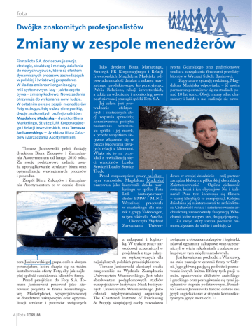 fota Dwójka znakomitych profesjonalistów Zmiany w zespole menedżerów Firma Fota S.A. dostosowuje swoją strategię, strukturę i metody działania do nowych wyzwań, które są efektem dynamicznych procesów zachodzących w polskiej i światowej gospodarce. W ślad za zmianami organizacyjnymi i systemowymi idą – jak to często bywa – zmiany kadrowe. Nowe zadania otrzymują do wykonania nowi ludzie. W ostatnim okresie zespół menedżerów Foty wzbogacił się o dwa silne punkty, dwoje znakomitych profesjonalistów: Magdalenę Madejską – dyrektor Biura Marketingu, Strategii, PR Korporacyjnego i Relacji Inwestorskich, oraz Tomasza Janiszewskiego – dyrektora Biura Zakupów i Zarządzania Asortymentem. Tomasz Janiszewski pełni funkcję dyrektora Biura Zakupów i Zarządzania Asortymentem od lutego 2010 roku. Za swoje podstawowe zadanie uważa uporządkowanie struktury biura oraz optymalizację wewnętrznych procesów i procedur. Zespół Biura Zakupów i Zarządzania Asortymentem to w ocenie dyrek- tora Janiszewskiego grupa osób z dużym potencjałem, która skupia się na takim kształtowaniu oferty Foty, aby jak najlepiej spełnić oczekiwania klientów firmy. Przed przejściem do Foty S.A. Tomasz Janiszewski pracował jako kierownik projektu w firmie konsultingowej Marketplanet, wyspecjalizowanej w doradztwie zakupowym oraz optymalizacji struktur i procesów związanych 4 Fota FORUM Jako dyrektor Biura Marketingu, Strategii, PR Korporacyjnego i Relacji Inwestorskich Magdalena Madejska odpowiada za całość działań z zakresu marketingu produktowego, korporacyjnego, Public Relations, relacji inwestorskich, a także za wdrożenie i monitoring nowo zdefiniowanej strategii spółki Fota S.A. Jej celem jest prowadzenie efektywnych i skutecznych akcji wsparcia sprzedaży, konsekwentna polityka budowania wizerunku spółki i jej marek, a przede wszystkim aktywne włączenie się w proces budowania trwałych relacji z klientami. Wiążę się to na przykład z rewitalizacją sieci warsztatów Leader Service i Leader Service Truck. Przed rozpoczęciem pracy na obecnym stanowisku Magdalena Madejska pracowała jako kierownik działu marketingu w spółce Fota Ltd. (autoryzowany dealer BMW i MINI). Wcześniej pracowała w marketingu dla marek z grupy Volkswagen, w tym także dla Porsche. Ukończyła Wydział Zarządzania Uniwer- sytetu Gdańskiego oraz podyplomowe studia z zarządzania finansami przedsiębiorstw w Wyższej Szkole Bankowej. Zapytana o sytuację rodzinną, Magdalena Madejska odpowiada: – Z moim partnerem poznaliśmy się na studiach ponad 10 lat temu. Oboje mamy silne charaktery i każde z nas realizuje się zawo- z zakupami i logistyką. W trakcie pracy zawodowej uczestniczył w projektach z tego zakresu wykonywanych dla największych polskich przedsiębiorstw. Tomasz Janiszewski ukończył studia magisterskie na Wydziale Zarządzania Uniwersytetu Warszawskiego. Jest także absolwentem podyplomowych studiów europejskich w Instytucie Nauk Politycznych Uniwersytetu Warszawskiego. Jako członek międzynarodowej organizacji The Chartered Institute of Purchasing & Supply, skupiającej osoby zawodowo związane z obszarem zakupów i logistyki, zdawał egzaminy zakupowe oraz uczestniczył w wielu szkoleniach z zakresu zakupów, w tym międzynarodowych. Jest kawalerem, pochodzi z Warszawy, na stałe pracuje w centrali firmy w Gdyni. Jego główną pasją są podróże i poznawanie innych kultur. Efekty tych pasji to m.in. opanowanie alfabetów arabskiego i greckiego oraz posługiwanie się tymi językami w stopniu podstawowym. Ponadto Tomasz Janiszewski bardzo dobrze zna język angielski oraz w stopniu komunikatywnym język niemiecki.  dowo w swojej dziedzinie – mój partner zarządza klubem z piłkarskiej ekstraklasy. Zainteresowania? – Ogólna ciekawość świata, ludzi i ich obyczajów. No i kulinaria! Poza tym interesuje się filmem – raczej klasyką (i to europejską). Kolejna dziedzina jej zainteresowań to architektura. Ciekawość świata i zainteresowanie architekturą zaowocowały fascynacją Włochami, które nazywa swą drugą ojczyzną. Za swoje atuty uważa poczucie humoru, dystans do siebie i ambicję.