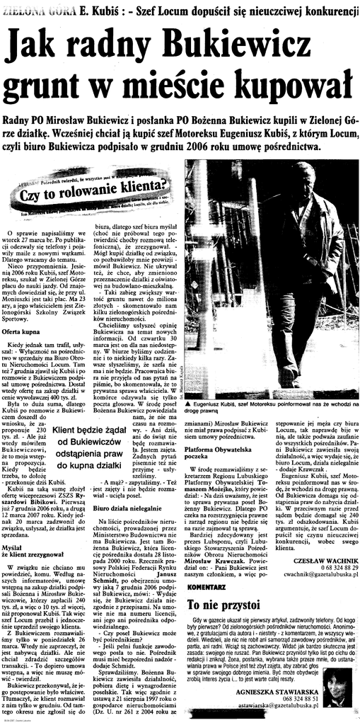 «tjmi E. Kubiś: - Szef Locum dopuścił się nieuczciwej konkurencji Jak radny Bukiewicz grunt w mieście kupował Radny PO Mirosław Bukiewicz i posłanka PO Bożenna Bukiewicz kupili w Zielonej Górze działkę. Wcześniej chciał ją kupić szef Motoreksu Eugeniusz Kubiś, z którym Locum, czyli biuro Bukiewicza podpisało w grudniu 2006 roku umowę pośrednictwa. biura, dlatego szef biura myślał (choć nie próbował tego potwierdzić choćby rozmową telefoniczną), że zrezygnował. Mógł kupić działkę od związku, co pozbawiłoby mnie prowizji mówił Bukiewicz. Nie ukrywał też, że chce, aby zmieniono przeznaczenie działki z oświatowej na budowlano-mieszkalną. - Taki zabieg zwiększy wartość gruntu nawet do miliona złotych - skomentowało nam kilku zielonogórskich pośredników nieruchomości. Chcieliśmy usłyszeć opinię Oferta kupna Bukiewicza na temat nowych informacji. Od czwartku 30 Kiedy jednak tam trafił, usły- marca jest on dla nas niedostępszał: - Wyłączność na pośrednic- ny. W biurze byliśmy codzientwo w sprzedaży ma Biuro Obro- nie i to niekiedy kilka razy. Zatu Nieruchomości Locum. Tam wsze słyszeliśmy, że szefa nie też 7 grudnia zjawił się Kubiś i po ma i nie będzie. Pracownica biurozmowie z Bukiewiczem podpi- ra nie przyjęła od nas pytań na sał umowę pośrednictwa. Dostał piśmie, bo skomentowała, że to wtedy ofertę na zakup działki w prywatna sprawa właściciela. W komórce odzywała się tylko cenie wywoławczej 400 tyś. zł. Była to duża suma, dlatego poczta głosowa. W środę poseł Kubiś po rozmowie z Bukiewi- Bożenna Bukiewicz powiedziała czem doszedł do nam, że nie ma wniosku, że zaczasu na rozmoproponuje 230 Klient będzie żądat wy. - Ani dziś, tyś. zł. - Ale już ani do świąt nie od Bukiewiczów będę rozmawiawtedy mówiłem Buk ie wieżowi, ła. Jestem zajęta. odstąpienia praw Żadnych pytań że to moja wstępna propozycja. też nie do kupna dziatki pisemnie Kiedy będzie przyjmę - usłytrzeba, to dołożę szeliśmy. - przekonuje dziś Kubiś. - A mąż? - zapytaliśmy. - Też Kubiś na taką sumę złożył • jest zajęty i nie będzie rozmaofertę wiceprezesowi ZSZS Ry- wiał - ucięła poseł. szardowi Bibikowi. Pierwszą już 7 grudnia 2006 roku, a drugą Biuro działa nielegalnie 12 marca 2007 roku. Kiedy jednak 20 marca zadzwonił do Na liście pośredników nieruzwiązku, usłyszał, że działka jest chomości, prowadzonej przez sprzedana. Ministerstwo Budownictwa nie ma Bukiewicza. Jest tam BoMyślał żenna Bukiewicz, która licenże klient zrezygnował cję pośrednika dostała 28 listopada 2000 roku. Rzecznik praW związku nie chciano mu sowy Polskiej Federacji Rynku powiedzieć, komu. Według na- Nieruchomości Janusz szych informatorów, umowę Schmidt, po obejrzeniu umowstępną na zakup działki podpi- wy jaką 7 grudnia 2006 podpisali Bożenna i Mirosław Bukie- sał Bukiewicz, mówi: - Wydaje wiczowie, którzy zapłacili 240 się, że Bukiewicz działa nietyś. zł, a więc o 10 tyś. zł więcej, zgodnie z przepisami. Na umoniż proponował Kubiś. Tak więc wie nie ma numeru licencji, szef Locum przebił i jednocze- ani jego ani pośrednika odpośnie uprzedził swojego klienta. wiedzialnego. Z Bukiewiczem rozmawiali- Czy poseł Bukiewicz może śmy tylko w poniedziałek 26 być pośrednikiem? marca. Wtedy nie zaprzeczył, że - Jeśli pełni funkcje zawodojest nabywcą działki. Ale nie wego posła to nie. Pośrednik chciał zdradzić szczegółów musi mieć bezpośredni nadzór transakcji. - To dopiero umowa dodaje Schmidt. wstępna, a więc nie muszę móSprawdziliśmy. Bożenna Buwić - twierdził. kiewicz zawiesiła działalność, Bukiewicz przekonywał, że je- pobiera dietę i wynagrodzenie go postępowanie było właściwe. poselskie. Tak więc zgodnie z Tłumaczył, że klient rozmawiał ustawą z 21 sierpnia 1997 roku o z nim tylko w grudniu. Od tam- gospodarce nieruchomościami tego okresu nie zgłosił się do (Dz. U. nr 261 z 2004 roku ze O sprawie napisaliśmy we wtorek 27 marca br. Po publikacji odezwały się telefony i pojawiły maile z nowymi wątkami. Dlatego wracamy do tematu. Nieco przypomnienia. Jesienią 2006 roku Kubiś, szef Motoreksu, szukał w Zielonej Górze placu do nauki jazdy. Od znajomych dowiedział się, że przy ul. Moniuszki jest taki plac. Ma 23 ary, a jego właścicielem jest Zielonogórski Szkolny Związek Sportowy. A Eugeniusz Kubiś, szef Motoreksu poinformował nas że wchodzi na drogę prawną zmianami) Mirosław Bukiewicz nie miał prawa podpisać z Kubisiem umowy pośrednictwa. Platforma Obywatelska poczeka W środę rozmawialiśmy z sekretarzem Regionu Lubuskiego Platformy Obywatelskiej Tomaszem Możejko, który powiedział: - Na dziś uważamy, że jest to sprawa prywatna poseł Bożenny Bukiewicz. Dlatego PO czeka na rozstrzygnięcia prawne i zarząd regionu nie będzie się na razie zajmował tą sprawą. Bardziej zdecydowany jest prezes Lubsponu, czyli Lubuskiego Stowarzyszenia Pośredników Obrotu Nieruchomości Mirosław Krawczak. Powiedział on: - Pani Bukiewicz jest naszym członkiem, a więc po- stepowanie jej męża czy biura Locum, tak naprawdę bije w nią, ale także podważa zaufanie do wszystkich pośredników. Pani Bukiewicz zawiesiła swoją działalność, a więc wydaje się, że biuro Locum, działa nielegalnie - dodaje Krawczak . Eugeniusz Kubiś, szef Motoreksu poinformował nas w środę, że wchodzi na drogę prawną. Od Bukiewicza domaga się odstąpienia praw do nabycia działki. W przeciwnym razie przed sądem będzie domagał się 240 tyś. zł odszkodowania. Kubiś argumentuje, że szef Locum dopuścił się czynu nieuczciwej konkurencji, wobec swego klienta. CZESŁAW WACHNIK O 68 324 88 29 [email protected] KOMENTARZ To nie przystoi Gdy w gazecie ukazat się pierwszy artykuł, zadzwoniły telefony. Od kogo byty pierwsze? Od zielonogórskich pośredników nieruchomości. Anonimowe, z grat