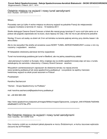 Forum Sekcji Spadochronowej - Sekcja Spadochronowa-Aeroklub Białostocki - SKOKI SPADOCHRONOW Wygenerowano: 2 March, 2017, 19:41 Ostatnie miejsca na wyjazd i nowy tunel aerodynami Autor: Skybabe - 2011/03/07 14:19 _____________________________________ Witam, Pozostały nam już tylko 4 wolne miejsca na skoczny wyjazd na południe Francji do miejscowości Lezignan-Corbiere w terminie 31 marca - 10 kwietnia 2011 Strefe obsługuje Cessna Grand Caravan a ticket dla naszej grupy kosztuje 21 euro czyli tyle samo co w polsce ale pogoda zapowiada sie na dużo, dużo lepszą niż tutaj :) Bo nie ma to jak słoneczne południe Nocleg 15 euro od osoby za dzień ok 3 km od lotniska na terenie pięknej winnicy przy domku basen i do wina blisko Ale to nie wszystko! Na strefie od września rusza NOWY TUNEL AERODYNAMICZNY! a wraz z nim my ruszamy z wyjazdami. :woohoo: W listopadzie otwieramy pierwsze terminy wyjazdowe Tunel ma konstrukcję podobną jak tunel w Bedford, ale ma jedną zasadniczą zaletę! Jest pierwszym tunelem w Europie, który znajduje się na strefie spadochronowej więc od razu z tunelu wskakujemy do samolotu i skaczemy z Cessny Grand Caravan :woohoo: Wszystkich zainteresowanych zapraszam do śledzenia tematu na naszej stronie www.tandemy.podlasie.pl lub www.spadochrony.podlasie.pl i oczywiście na wpólny marcowo kwietniowy wyjazd na skoki przed sezonem w Polsce! Pozdrawiam Karolina Sacharczuk "Asman - Grupa Spadochrony na Podlasiu" mail: [email protected] tel. +48 602 665 299 http://www.spadochrony.bialystok.pl/images/fbfiles/images/Ogloszenie_Lezignan_640-9763e9c7fa5540b e8a80ab67c1d7219e.JPG ============================================================================ Re:Ostatnie miejsca na wyjazd i nowy tunel aerodynami Autor: CezarSky - 2011/03/08 13:20 _____________________________________ Ooo możemy zrobić po za skokami jakieś pływanie w morzu Śródziemnym, w końcu lazurowe wybrzeże zaczyna się od Pirenejów. 1/2 Forum Sekcji Spadochronowej - Sekcja Spadochronowa-Aeroklub Białostocki - SKOKI SPADOCHRONOW Wygenerowano: 2 March, 2017, 19:41 ============================================================================ Re:Ostatnie miejsca na wyjazd i nowy tunel aerodynami Autor: tomaszek - 2011/03/08 20:15 _____________________________________ Hejj!!! Jakie ceny za tunel?? Hejj!! ============================================================================ Re:Ostatnie miejsca na wyjazd i nowy tunel aerodynami Autor: Skybabe - 2011/03/08 20:40 _____________________________________ Hej W chwili obecnej mamy informacje, że cenny będą zbliżone do cen jakie są w Bottrop a napewno dużo niższe niż w Aerokarcie. Dokładnego cennika jeszcze nie mamy. poniżej link ze zdjęciem o postępie prac i jak będzie wyglądał ten tunel :laugh: www.flyzone.fr/wp-content/uploads/2...wuza-2.jpg www.flyzone.fr/infrastructure/comment-ca-marche/ www.flyzone.fr/infrastructure/ pozdrawiam Karolina Sacharczuk ============================================================================ 2/2