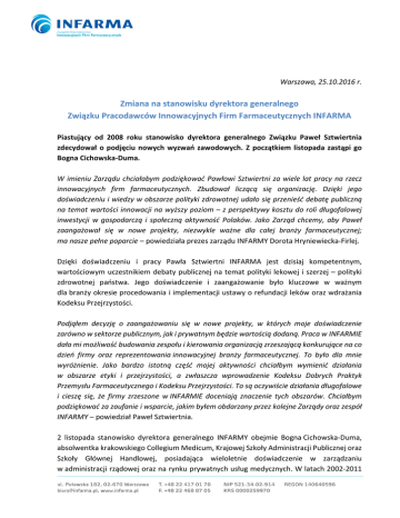 Warszawa, 25.10.2016 r. Zmiana na stanowisku dyrektora generalnego Związku Pracodawców Innowacyjnych Firm Farmaceutycznych INFARMA Piastujący od 2008 roku stanowisko dyrektora generalnego Związku Paweł Sztwiertnia zdecydował o podjęciu nowych wyzwań zawodowych. Z początkiem listopada zastąpi go Bogna Cichowska-Duma. W imieniu Zarządu chciałabym podziękować Pawłowi Sztwiertni za wiele lat pracy na rzecz innowacyjnych firm farmaceutycznych. Zbudował liczącą się organizację. Dzięki jego doświadczeniu i wiedzy w obszarze polityki zdrowotnej udało się przenieść debatę publiczną na temat wartości innowacji na wyższy poziom – z perspektywy kosztu do roli długofalowej inwestycji w gospodarczą i społeczną aktywność Polaków. Jako Zarząd chcemy, aby Paweł zaangażował się w nowe projekty, niezwykle ważne dla całej branży farmaceutycznej; ma nasze pełne poparcie – powiedziała prezes zarządu INFARMY Dorota Hryniewiecka-Firlej. Dzięki doświadczeniu i pracy Pawła Sztwiertni INFARMA jest dzisiaj kompetentnym, wartościowym uczestnikiem debaty publicznej na temat polityki lekowej i szerzej – polityki zdrowotnej państwa. Jego doświadczenie i zaangażowanie było kluczowe w ważnym dla branży okresie procedowania i implementacji ustawy o refundacji leków oraz wdrażania Kodeksu Przejrzystości. Podjąłem decyzję o zaangażowaniu się w nowe projekty, w których moje doświadczenie zarówno w sektorze publicznym, jak i prywatnym będzie wartością dodaną. Praca w INFARMIE dała mi możliwość budowania zespołu i kierowania organizacją zrzeszającą konkurujące na co dzień firmy oraz reprezentowania innowacyjnej branży farmaceutycznej. To było dla mnie wyróżnienie. Jako bardzo istotną część mojej aktywności chciałbym wymienić działania w obszarze etyki i przejrzystości, a zwłaszcza wprowadzenie Kodeksu Dobrych Praktyk Przemysłu Farmaceutycznego i Kodeksu Przejrzystości. To są oczywiście działania długofalowe i cieszę się, że firmy zrzeszone w INFARMIE doceniają znaczenie tych obszarów. Chciałbym podziękować za zaufanie i wsparcie, jakim byłem obdarzany przez kolejne Zarządy oraz zespół INFARMY – powiedział Paweł Sztwiertnia. 2 listopada stanowisko dyrektora generalnego INFARMY obejmie Bogna Cichowska-Duma, absolwentka krakowskiego Collegium Medicum, Krajowej Szkoły Administracji Publicznej oraz Szkoły Głównej Handlowej, posiadająca wieloletnie doświadczenie w zarządzaniu w administracji rządowej oraz na rynku prywatnych usług medycznych. W latach 2002-2011 Bogna Cichowska-Duma pracowała w Ministerstwie Gospodarki jako starszy specjalista, a następnie jako zastępca dyrektora w Departamencie Funduszy Europejskich oraz w Polskiej Agencji Rozwoju Przedsiębiorczości, w Departamencie Koordynacji Wdrażania Programów oraz Rozwoju Kadr w Przedsiębiorstwach. Od 2011 roku związana jest z sektorem prywatnej opieki medycznej. Przez cztery lata kierowała Centrum Medycznym Medicover w Wilanowie, a od 2015 roku była dyrektorem zarządzającym jednej z placówek sieci LuxMed. Jak podkreśla nowa dyrektor generalna: praca w INFARMIE stanowi wyzwanie, które pozwoli mi w pełni wykorzystać doświadczenia z sektora publicznego i prywatnego. Jako główny cel stawiam sobie kontynuowanie działań INFARMY zmierzających do pogłębiania dialogu społecznego, służącego zwiększeniu dostępu polskich pacjentów do innowacyjnych terapii. Prezes zarządu INFARMY Dorota Hryniewiecka-Firlej jest przekonana, że: Bogna CichowskaDuma będzie umacniać pozycję Związku w publicznej dyskusji na temat wartości i miejsca innowacji w systemie ochrony zdrowia. O INFARMIE Związek Pracodawców Innowacyjnych Firm Farmaceutycznych INFARMA reprezentuje 28 wiodących firm sektora farmaceutycznego, prowadzących działalność badawczo-rozwojową i produkujących leki innowacyjne. INFARMA jest członkiem międzynarodowej organizacji zrzeszającej innowacyjną branżę farmaceutyczną – Europejskiej Federacji Przemysłu i Stowarzyszeń Farmaceutycznych (EFPIA), a także Pracodawców RP oraz Krajowej Izby Gospodarczej.