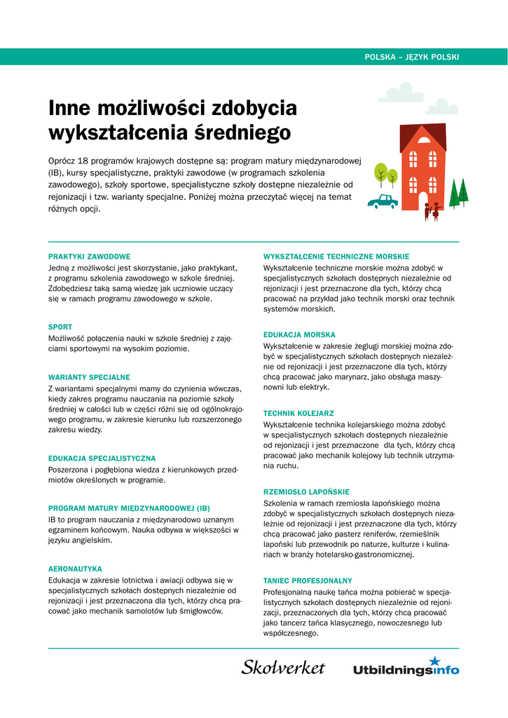 POLSKA – JĘZYK POLSKI Inne możliwości zdobycia wykształcenia średniego Oprócz 18 programów krajowych dostępne są: program matury międzynarodowej (IB), kursy specjalistyczne, praktyki zawodowe (w programach szkolenia zawodowego), szkoły sportowe, specjalistyczne szkoły dostępne niezależnie od rejonizacji i tzw. warianty specjalne. Poniżej można przeczytać więcej na temat różnych opcji. PRAKTYKI ZAWODOWE WYKSZTAŁCENIE TECHNICZNE MORSKIE Jedną z możliwości jest skorzystanie, jako praktykant, z programu szkolenia zawodowego w szkole średniej. Zdobędziesz taką samą wiedzę jak uczniowie uczący się w ramach programu zawodowego w szkole. Wykształcenie techniczne morskie można zdobyć w specjalistycznych szkołach dostępnych niezależnie od rejonizacji i jest przeznaczone dla tych, którzy chcą pracować na przykład jako technik morski oraz technik systemów morskich. SPORT Możliwość połączenia nauki w szkole średniej z zajęciami sportowymi na wysokim poziomie. WARIANTY SPECJALNE Z wariantami specjalnymi mamy do czynienia wówczas, kiedy zakres programu nauczania na poziomie szkoły średniej w całości lub w części różni się od ogólnokrajowego programu, w zakresie kierunku lub rozszerzonego zakresu wiedzy. EDUKACJA SPECJALISTYCZNA Poszerzona i pogłębiona wiedza z kierunkowych przedmiotów określonych w programie. EDUKACJA MORSKA Wykształcenie w zakresie żeglugi morskiej można zdobyć w specjalistycznych szkołach dostępnych niezależnie od rejonizacji i jest przeznaczone dla tych, którzy chcą pracować jako marynarz, jako obsługa maszynowni lub elektryk. TECHNIK KOLEJARZ Wykształcenie technika kolejarskiego można zdobyć w specjalistycznych szkołach dostępnych niezależnie od rejonizacji i jest przeznaczone dla tych, którzy chcą pracować jako mechanik kolejowy lub technik utrzymania ruchu. RZEMIOSŁO LAPOŃSKIE PROGRAM MATURY MIĘDZYNARODOWEJ (IB) IB to program nauczania z międzynarodowo uznanym egzaminem końcowym. Nauka odbywa w większości w języku angielskim. Szkolenia w ramach rzemiosła lapońskiego można zdobyć w specjalistycznych szkołach dostępnych niezależnie od rejonizacji i jest przeznaczone dla tych, którzy chcą pracować jako pasterz reniferów, rzemieślnik lapoński lub przewodnik po naturze, kulturze i kulinariach w branży hotelarsko-gastronomicznej. AERONAUTYKA Edukacja w zakresie lotnictwa i awiacji odbywa się w specjalistycznych szkołach dostępnych niezależnie od rejonizacji i jest przeznaczona dla tych, którzy chcą pracować jako mechanik samolotów lub śmigłowców. TANIEC PROFESJONALNY Profesjonalną naukę tańca można pobierać w specjalistycznych szkołach dostępnych niezależnie od rejonizacji, przeznaczonych dla tych, którzy chcą pracować jako tancerz tańca klasycznego, nowoczesnego lub współczesnego.