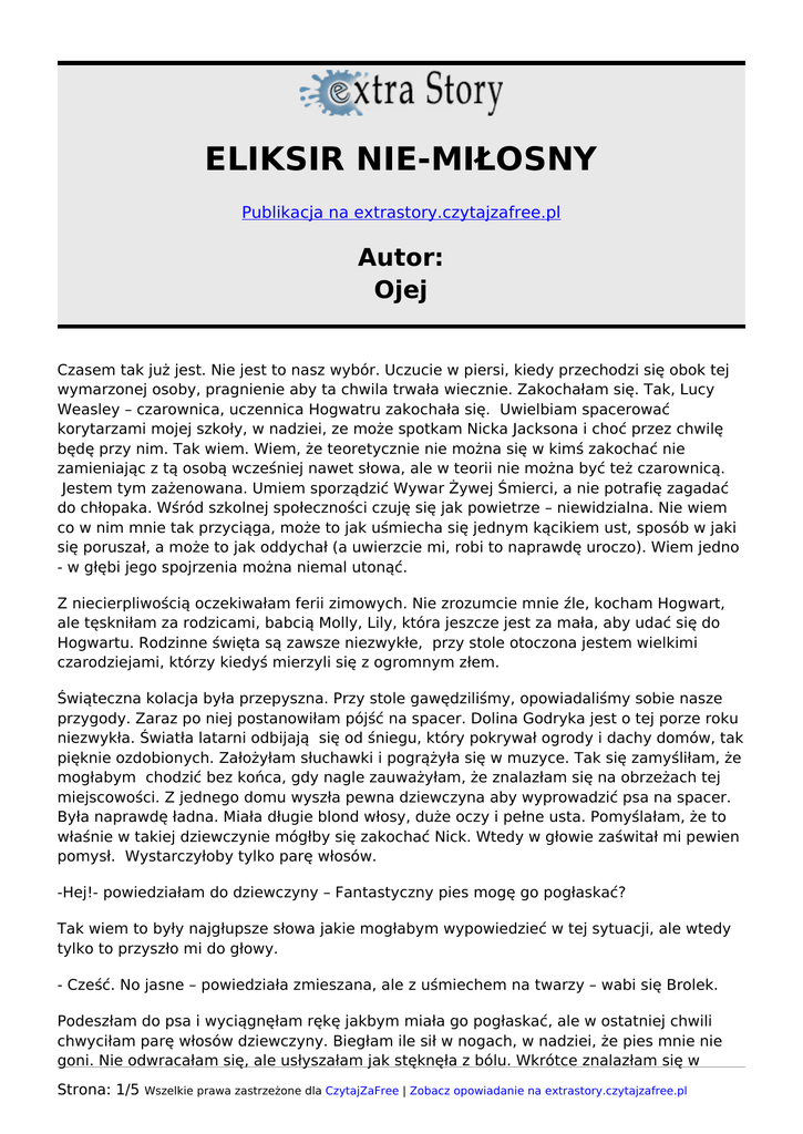 ELIKSIR NIE-MIŁOSNY Publikacja na extrastory.czytajzafree.pl Autor: Ojej Czasem tak już jest. Nie jest to nasz wybór. Uczucie w piersi, kiedy przechodzi się obok tej wymarzonej osoby, pragnienie aby ta chwila trwała wiecznie. Zakochałam się. Tak, Lucy Weasley – czarownica, uczennica Hogwatru zakochała się. Uwielbiam spacerować korytarzami mojej szkoły, w nadziei, ze może spotkam Nicka Jacksona i choć przez chwilę będę przy nim. Tak wiem. Wiem, że teoretycznie nie można się w kimś zakochać nie zamieniając z tą osobą wcześniej nawet słowa, ale w teorii nie można być też czarownicą. Jestem tym zażenowana. Umiem sporządzić Wywar Żywej Śmierci, a nie potrafię zagadać do chłopaka. Wśród szkolnej społeczności czuję się jak powietrze – niewidzialna. Nie wiem co w nim mnie tak przyciąga, może to jak uśmiecha się jednym kącikiem ust, sposób w jaki się poruszał, a może to jak oddychał (a uwierzcie mi, robi to naprawdę uroczo). Wiem jedno - w głębi jego spojrzenia można niemal utonąć. Z niecierpliwością oczekiwałam ferii zimowych. Nie zrozumcie mnie źle, kocham Hogwart, ale tęskniłam za rodzicami, babcią Molly, Lily, która jeszcze jest za mała, aby udać się do Hogwartu. Rodzinne święta są zawsze niezwykłe, przy stole otoczona jestem wielkimi czarodziejami, którzy kiedyś mierzyli się z ogromnym złem. Świąteczna kolacja była przepyszna. Przy stole gawędziliśmy, opowiadaliśmy sobie nasze przygody. Zaraz po niej postanowiłam pójść na spacer. Dolina Godryka jest o tej porze roku niezwykła. Światła latarni odbijają się od śniegu, który pokrywał ogrody i dachy domów, tak pięknie ozdobionych. Założyłam słuchawki i pogrążyła się w muzyce. Tak się zamyśliłam, że mogłabym chodzić bez końca, gdy nagle zauważyłam, że znalazłam się na obrzeżach tej miejscowości. Z jednego domu wyszła pewna dziewczyna aby wyprowadzić psa na spacer. Była naprawdę ładna. Miała długie blond włosy, duże oczy i pełne usta. Pomyślałam, że to właśnie w takiej dziewczynie mógłby się zakochać Nick. Wtedy w głowie zaświtał mi pewien pomysł. Wystarczyłoby tylko parę włosów. -Hej!- powiedziałam do dziewczyny – Fantastyczny pies mogę go pogłaskać? Tak wiem to były najgłupsze słowa jakie mogłabym wypowiedzieć w tej sytuacji, ale wtedy tylko to przyszło mi do głowy. - Cześć. No jasne – powiedziała zmieszana, ale z uśmiechem na twarzy – wabi się Brolek. Podeszłam do psa i wyciągnęłam rękę jakbym miała go pogłaskać, ale w ostatniej chwili chwyciłam parę włosów dziewczyny. Biegłam ile sił w nogach, w nadziei, że pies mnie nie goni. Nie odwracałam się, ale usłyszałam jak stęknęła z bólu. Wkrótce znalazłam się w Strona: 1/5 Wszelkie prawa zastrzeżone dla CzytajZaFree | Zobacz opowiadanie na extrastory.czytajzafree.pl domu cioci Gini, w którym obmyślałam plan, żartobliwie nazwany przeze mnie „Operacja Jackson” Po powrocie do Hogwartu od razu zaczęłam gromadzić składniki. Zamierzałam sporządzić Eliksir Wielosokowy. Jego przygotowanie nie należy do najłatwiejszych, a działanie jest krótkie – po godzinie wraca się do swojej naturalnej postaci. Po miesiącu udało mi się skończyć eliksir, niektóre składniki ukradłam. Moja starsza siostraPrefekt Naczelny z pewnością skarciłaby mnie za takie zachowanie. Szykowałam się do wizyty w Hogsmeade. Do plecaka spakowałam parę ubrań, które pożyczyłam od Viktorie – srebrnowłosej piękności, mojej kuzynki. Udałam się do pubu pod Trzema Miotłami. Tam w łazience wypiłam eliksir. Smakował jak rozgotowana kapusta, pachniał jak spleśniałe mięso. Kiedy już miałam zwymiotować, poczułam falę ostrego bólu w każdej części mojego ciała. Czułam jakby skóra roztopiła się na mnie jak gorący wosk. Upadłam na kolana. Po jakiś 2 minutach otrząsnęłam się. Wyszłam z łazienki i spojrzałam w lustro. Uśmiechała się tam do mnie dziewczyna, około 16 lat, chodzący ideał. To dodało mi odwagi. Wyszłam z łazienki i zajęłam stolik naprzeciwko Nicka. Rozmawiał z kolegami, którzy na ten moment nie byli zbyt pożądani. Machnęłam różdżką i cicho wypowiedziałam zaklęcie. Chwilę później jeden podskoczył i oznajmił zzieleniały, że musi koniecznie iść do toalety. Kelnerka przyniosła mi zamówione jedzenie, a ja cieszyłam się, bo zostało mi tylko dwóch do przegonienia. Możecie więc sobie wyobrazić jak bardzo się ucieszyłam, kiedy tych dwoje wstało i pożegnało się z Nickiem. Został sam przy stoliku. Skrobał cos piórem na pergaminie. Skorzystałam z okazji. Wstałam i z talerzem pełnym jedzenia podeszłam do niego. - Mogę się dosiąść?- zapytałam nie odrywając wzroku od jego pięknych oczu - Jasne. Usiadłam naprzeciwko niego, patrząc na jego zmieszaną minę. Jego ręka zatrzymała się nad pergaminem. - Dzięki, wiesz czekam na koleżankę z tej waszej szkoły. Przyjechałam ją odwiedzić, ale miałyśmy się spotkać dopiero za półgodziny, a nie lubię jeść sama. Także jeszcze raz dziękuję, że pozwoliłeś mi się dosiąść. – powiedziałam to wszystko jednym tchem, co wyraźnie go rozbawiło. - Nie jesteś z Hogwartu?? - Nie, właściwie to chodzę do Beauxbatons, ale przyjechałam do Szkocji na ślub siostry. Tygodniowa przepustka. Dalsza rozmowa jakoś się potoczyła. Byłabym chyba najszczęśliwszą dziewczyną, gdybym go nie okłamywała. Starałam się unikać niektórych tematów, ale nie zawsze mi się to udawało. Speszyłam się kiedy się zapytał: - Za 10 minut minie godzina, a twojej koleżanki jeszcze nie ma. Jak się ona w ogóle nazywa? -Hymm.. ja… Dzięki! Nie sądziłam, że tak bardzo chcesz mnie się pozbyć. Musiałam reagować szybko. Niedługo przestanie działać eliksir. Strona: 2/5 Wszelkie prawa zastrzeżone dla CzytajZaFree | Zobacz opowiadanie na extrastory.czytajzafree.pl - Nie, ja