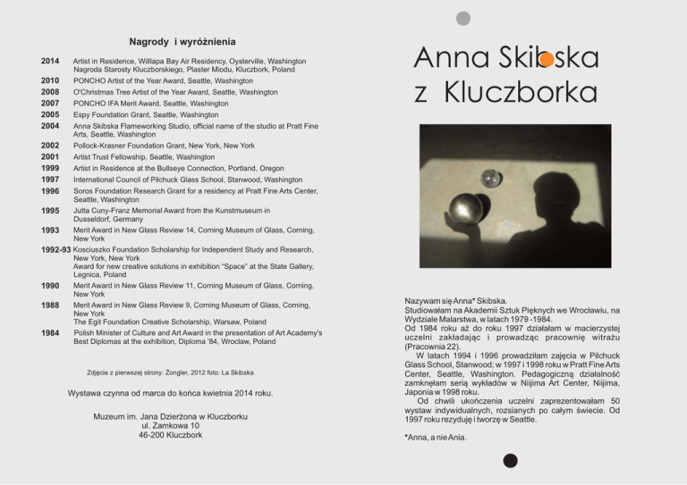 Nagrody i wyró¿nienia 2014 Artist in Residence, Willlapa Bay Air Residency, Oysterville, Washington Nagroda Starosty Kluczborskiego, Plaster Miodu, Kluczbork, Poland 2010 2008 2007 2005 2004 PONCHO Artist of the Year Award, Seattle, Washington 2002 2001 1999 1997 1996 O'Christmas Tree Artist of the Year Award, Seattle, Washington PONCHO IFA Merit Award, Seattle, Washington Anna Skibska z Kluczborka Espy Foundation Grant, Seattle, Washington Anna Skibska Flameworking Studio, official name of the studio at Pratt Fine Arts, Seattle, Washington Pollock-Krasner Foundation Grant, New York, New York Artist Trust Fellowship, Seattle, Washington Artist in Residence at the Bullseye Connection, Portland, Oregon International Council of Pilchuck Glass School, Stanwood, Washington Soros Foundation Research Grant for a residency at Pratt Fine Arts Center, Seattle, Washington 1995 Jutta Cuny-Franz Memorial Award from the Kunstmuseum in Dusseldorf, Germany 1993 Merit Award in New Glass Review 14, Corning Museum of Glass, Corning, New York 1992-93 Kosciuszko Foundation Scholarship for Independent Study and Research, New York, New York Award for new creative solutions in exhibition “Space” at the State Gallery, Legnica, Poland 1990 Merit Award in New Glass Review 11, Corning Museum of Glass, Corning, New York 1988 Merit Award in New Glass Review 9, Corning Museum of Glass, Corning, New York The Egit Foundation Creative Scholarship, Warsaw, Poland 1984 Polish Minister of Culture and Art Award in the presentation of Art Academy's Best Diplomas at the exhibition, Diploma '84, Wroclaw, Poland Zdjêcie z pierwszej strony: ¯ongler, 2012 foto: La Skibska Wystawa czynna od marca do koñca kwietnia 2014 roku. Muzeum im. Jana Dzier¿ona w Kluczborku ul. Zamkowa 10 46-200 Kluczbork Nazywam siê Anna* Skibska. Studiowa³am na Akademii Sztuk Piêknych we Wroc³awiu, na Wydziale Malarstwa, w latach 1979 -1984. Od 1984 roku a¿ do roku 1997 dzia³a³am w macierzystej uczelni zak³adaj¹c i prowadz¹c pracowniê witra¿u (Pracownia 22). W latach 1994 i 1996 prowadzi³am zajêcia w Pilchuck Glass School, Stanwood; w 1997 i 1998 roku w Pratt Fine Arts Center, Seattle, Washington. Pedagogiczn¹ dzia³alnoœæ zamknê³am seri¹ wyk³adów w Niijima Art Center, Niijima, Japonia w 1998 roku. Od chwili ukoñczenia uczelni zaprezentowa³am 50 wystaw indywidualnych, rozsianych po ca³ym œwiecie. Od 1997 roku rezydujê i tworzê w Seattle. *Anna, a nie Ania. La Skibska, w czarnej peruce, z czerwon¹ pomadk¹ na ustach, nosz¹ca wysokie i tego¿ samego koloru co pomadka obcasy (niezamieszczone na zdjêciu), opowiada o wystawie w kluczborskim Muzeum im. Jana Dzier¿ona: Prezentujê w rodzinnym mieœcie wystawê moich najnowszych prac stworzonych na zamówienie kluczborskiego Muzeum, a zatytu³owan¹ “La Skibska i pies ogrodnika”. Wystawa strze¿ona jest przez amerykañskiego buldoga, który œpi w pracy ale … œni o mnie, codziennie od 8 do 16-tej, z wyj¹tkiem poniedzia³ków. Na wystawie przedstawiam moj¹ najnowsz¹ pasjê - fotografiê i collage, tj. seriê autoportretów, przyprawionych œl¹skim poczuciem humoru i opatrzonych przymru¿eniem oka, koniecznym nie tylko dla fotografuj¹cego.