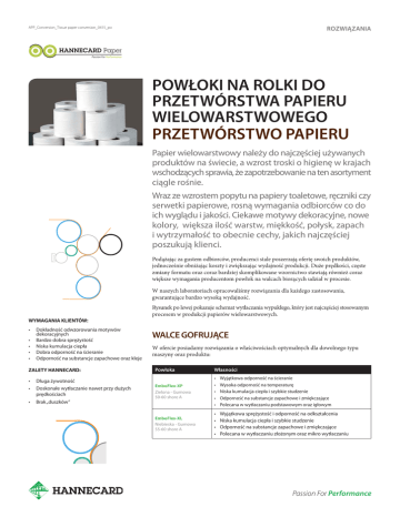 ROZWIĄZANIA APP_Conversion_Tissue paper conversion_0415_po HANNECARD Paper Passion For Performance POWŁOKI NA ROLKI DO PRZETWÓRSTWA PAPIERU WIELOWARSTWOWEGO PRZETWÓRSTWO PAPIERU Papier wielowarstwowy należy do najczęściej używanych produktów na świecie, a wzrost troski o higienę w krajach wschodzących sprawia, że zapotrzebowanie na ten asortyment ciągle rośnie. Wraz ze wzrostem popytu na papiery toaletowe, ręczniki czy serwetki papierowe, rosną wymagania odbiorców co do ich wyglądu i jakości. Ciekawe motywy dekoracyjne, nowe kolory, większa ilość warstw, miękkość, połysk, zapach i wytrzymałość to obecnie cechy, jakich najczęściej poszukują klienci. Podążając za gustem odbiorców, producenci stale poszerzają ofertę swoich produktów, jednocześnie obniżając koszty i zwiększając wydajność produkcji. Duże prędkości, częste zmiany formatu oraz coraz bardziej skomplikowane wzornictwo stawiają również coraz większe wymagania producentom powłok na walcach biorących udział w procesie. W naszych laboratoriach opracowaliśmy rozwiązania dla każdego zastosowania, gwarantujące bardzo wysoką wydajność. WYMAGANIA KLIENTÓW: • Dokładność odwzorowania motywów dekoracyjnych • Bardzo dobra sprężystość • Niska kumulacja ciepła • Dobra odporność na ścieranie • Odporność na substancje zapachowe oraz kleje ZALETY HANNECARD: • Długa żywotność • Doskonałe wytłaczanie nawet przy dużych prędkościach • Brak „duszków” Rysunek po lewej pokazuje schemat wytłaczania wypukłego, który jest najczęściej stosowanym procesem w produkcji papierów wielowarstwowych. WALCE GOFRUJĄCE W ofercie posiadamy rozwiązania o właściwościach optymalnych dla dowolnego typu maszyny oraz produktu: Powłoka Własności EmboFlex-XP Zielona - Gumowa 50-60 shore A • • • • • Wyjątkowa odporność na ścieranie Wysoka odporność na temperaturę Niska kumulacja ciepła i szybkie studzenie Odporność na substancje zapachowe i zmiękczające Polecana w wytłaczaniu podstawowym oraz igłowym EmboFlex-XL Niebieska - Gumowa 55-60 shore A • • • • Wyjątkowa sprężystość i odporność na odkształcenia Niska kumulacja ciepła i szybkie studzenie Odporność na substancje zapachowe i zmiękczające Polecana w wytłaczaniu złożonym oraz mikro wytłaczaniu Passion For Performance HANNECARD Paper Passion For Performance WYMAGANIA KLIENTA: • • • Bardzo dobre przenoszenie kleju (wodnego) Wysoka precyzja geometrii Brak defektów powierzchni ZALETY HANNECARD: • Powłoki gumowe i poliuretanowe • Doskonałe przenoszenie kleju (kolorowego) • Czystość i jednorodność powłok • Duża precyzja wykończenia • Powłoki łatwe w czyszczeniu • Rozwiązania z użyciem rękawów (sleevów) WYMAGANIA KLIENTA: • Wysoka twardość • Dobra gładkość powierzchni • Stabilność geometrii w trakcie użytkowania ZALETY HANNECARD: • Powłoki gumowe i poliuretanowe • Gładkie wykończenie ułatwiające odklejanie arkusza • Stabilność siły docisku i geometrii • Powłoki łatwe w czyszczeniu WALCE NANOSZĄCE (KLISZOWE) Wraz z rozwojem technologii zwiększył się znacznie rozmiar i ciężar walców nanoszących, natomiast wymagania użytkowników w kwestii dokładności wymiarów, czystości powłoki, braku defektów powierzchni itd. pozostały na niezmienionym poziomie. Priorytetem stało się również zmniejszenie zużycia kleju. Odpowiadając na potrzeby naszych klientów, proponujemy w swej ofercie powłoki o wyjątkowej wydajności oraz bardzo wysokiej precyzji wykończenia. Wszystkie nasze rozwiązania można stosować również na rękawach (sleevach) kompozytowych. Naszym klientom oferujemy nowe rękawy z powłoką lub samą wymianę powłoki na używanych rękawach. Powłoka Własności GlueFlex Zielona - Gumowa 65 shore A • Idealna czystość • Doskonałe własności przenoszenia • Długa żywotność GlueFlex-XP Granatowa - Poliuretanowa 60-70 shore A • • • • Idealna czystość Doskonałe własności przenoszenia Zwiększona odporność na ścieranie Odporność na substancje zapachowe WALCE DUBLUJĄCE (MARRYING ROLLS) O jakości papieru wielowarstwowego decydują własności walców dublujących używanych w łączeniu poszczególnych warstw, a szczególnie stabilność ich docisku. Powłoka Własności CombiStar Czarna - Gumowa 85-95 shore A • Bardzo dobre własności fizyczne i odporność na ścieranie • Gładka powierzchnia ułatwiająca odklejanie arkusza CombiStar-XP Biała - Poliuretanowa 90 shore A • Doskonałe własności fizyczne i odporność na ścieranie • Dobra równomierność docisku • Łatwiejsze odklejanie arkusza INNE ZASTOSOWANIA W swojej ofercie mamy również rozwiązania przeznaczone do wykańczania higienicznych artykułów papierowych : • Powłoki na rolki nabierające klej • Powłoki na cylindry i rękawy nanoszące oraz dociskowe używane w druku elementów dekoracyjnych (druk fleksograficzny lub wklęsłodruk) DODATKOWE INFORMACJE? Dokładniejsze informacje są dostępne u miejscowego przedstawiciela Hannecard i na stronie internetowej: www.hannecard.com • Powłoki na walce nanoszące, przeznaczone do nanoszenia substancji zapachowych i zmiękczających na gotowy papier. • Powłoki na walce stosowane w nawijaniu i cięciu Passion For Performance