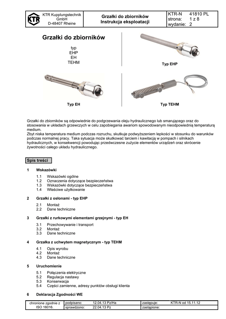 KTR Kupplungstechnik GmbH D-48407 Rheine Grzałki do zbiorników Instrukcja eksploatacji KTR-N 41810 PL strona: 1z8 wydanie: 2 Grzałki do zbiorników typ EHP EH TEHM Typ EHP Typ EH Typ TEHM Grzałki do zbiorników są odpowiednie do podgrzewania oleju hydraulicznego lub smarującego oraz do stosowania w układach grzewczych w celu zapobiegania awariom spowodowanym nieodpowiednią temperaturą medium. Zbyt niska temperatura medium podczas rozruchu, skutkuje podwyższeniem lepkości w stosunku do warunków podczas normalnej pracy. Taka sytuacja może skutkować tarciem i kawitacją w pompach i silnikach hydraulicznych, w konsekwencji powodując przedwczesne zużycie elementów urządzeń oraz skrócenie żywotności całego układu hydraulicznego. Spis treści 1 Wskazówki 1.1 1.2 1.3 1.4 2 Grzałki z osłonami - typ EHP 2.1 2.2 3 Opis wyrobu Montaż Dane techniczne Uruchomienie 5.1 5.2 5.3 5.4 6 Przechowywanie i transport Montaż Dane techniczne Grzałka z uchwytem magnetycznym - typ TEHM 4.1 4.2 4.3 5 Montaż Dane techniczne Grzałki z rurkowymi elementami grzejnymi - typ EH 3.1 3.2 3.3 4 Wskazówki ogólne Oznaczenia dotyczące bezpieczeństwa Wskazówki dotyczące bezpieczeństwa Właściwe użytkowanie Połączenia elektryczne Regulacja nastawy Konserwacja Części zamienne, adresy punktów obsługi klienta Deklaracja Zgodności WE chronione zgodnie z ISO 16016. podpisano: sprawdzono: 12.04.13 Pz/Ha 22.04.13 Pz zastępuje: zastąpione: KTR-N od 15.11.12 KTR Kupplungstechnik GmbH D-48407 Rheine Grzałki do zbiorników Instrukcja eksploatacji KTR-N 41810 PL strona: 2z8 wydanie: 2 1 Wskazówki 1.1 Wskazówki ogólne Proszę zapoznać z niniejszą instrukcją przed zamontowaniem grzałki. Proszę zwrócić szczególną uwagę na uwagi dotyczące bezpieczeństwa montażu! Instrukcja montażu jest elementem wyrobu. Proszę przechowywać ją przez cały czas użytkowania grzałki. Prawa autorskie niniejszej instrukcji zastrzeżone przez KTR Kupplungstechnik GmbH. 1.2 Oznaczenia dotyczące bezpieczeństwa STOP ! NIEBEZPIECZEŃSTWO! Niebezpieczeństwo uszkodzenia ciała i utraty zdrowia. OSTROŻNIE! Możliwe uszkodzenie maszyny / urządzenia. UWAGA! Szczególnie ważna informacja. 1.3 Wskazówki dotyczące bezpieczeństwa STOP NIEBEZPIECZEŃSTWO! Podczas montażu, regulacji oraz czynności konserwacyjnych grzałki należy bezwzględnie upewnić się, że cały układ jest zabezpieczony przed przypadkowym uruchomieniem i nie znajduje się pod ciśnieniem. Rozgrzana grzałka oraz gorący lub znajdujący się pod ciśnieniem olej hydrauliczny niosą ze sobą poważne zagrożenie uszkodzenia ciała. Z tego powodu należy bezwzględnie zapoznać się z całością niniejszej instrukcji. Wszystkie czynności związane ze sprzęgłem muszą być wykonane zgodnie z zasadą - „Po pierwsze bezpiecznie". Przed przystąpieniem do prac należy upewnić się czy został odłączony układ hydrauliczny oraz współpracujące urządzenia. Należy zabezpieczyć układ przed przypadkowym włączeniem - na przykład poprzez umieszczenie informacji w miejscu pracy lub poprzez usunięcie bezpiecznika zasilania. 1.4 Właściwe użytkowanie Do montażu lub konserwacji grzałki, może przystąpić osoba która dokładnie przeczytała i zrozumiała niniejszą instrukcję, posiada odpowiednie kwalifikacje, została upoważniona i jest do tego uprawniona Grzałki mogą być używane jedynie zgodnie z danymi technicznymi. Nieautoryzowane modyfikacje w wykonaniu grzałek są niedopuszczalne. Nie ponosimy żadnej odpowiedzialności za wprowadzone zmiany jak i ich skutki. Zastrzegamy sobie prawo do wprowadzenia technicznych modyfikacji grzałek prowadzących do ich ulepszenia. Grzałki określone w instrukcji, odpowiadają stanowi technicznemu w chwili powstania niniejszej instrukcji. chronione zgodnie z ISO 16016. podpisano: sprawdzono: 12.04.13 Pz/Ha 22.04.13 Pz zastępuje: zastąpione: KTR-N od 15.11.12 KTR Kupplungstechnik GmbH D-48407 Rheine KTR-N 41810 PL strona: 3z8 wydanie: 2 Grzałki do zbiorników Instrukcja eksploatacji 2 Grzałki z osłonami - typ EHP 2.1 Montaż Podczas montażu grzałki z osłoną do króćca należy zastosować odpowiednią dla danego medium uszczelkę. Jeżeli istnieje taka możliwość, dławik kablowy grzałki powinien być zwrócony do dołu. Grzałkę należy wkręcić poziomo w króciec zbiornika, znajdujący się poniżej poziomu oleju podczas pracy układu. Minimalny poziom oleju powinien znajdować się 50 mm ponad zamontowaną grzałką. W przypadku grzałek z regulacją temperatury, użytkownik jest odpowiedzialny za dokonanie odpowiedniej nastawy temperatury wyłączenia (dokładność przełączania ± 3 °C). Ceramiczne elementy grzejne są wymienialne (montaż bez spuszczania oleju). Wartość dopuszczalnego obciążenia powierzchni grzałki w danym medium, musi być użytkownikowi znana i nie może być przekraczana. UWAGA! Dla grzałek bez zintegrowanej regulacji temperatury, należy zapewnić oddzielne (zewnętrzne) urządzenie do regulacji temperatury (np. regulator przemysłowy KTR). rysunek 1: typ EHP – G 1 1/2“ bez regulacji temperatury rysunek 2: typ EHP – G 2“ bez regulacji temperatury rysunek 3: typ EHP (TA/TI) – G 2“ z regulacją temperatury 2.2 Dane techniczne Grzałki standardowe ujęte w tabeli 1, przeznaczone są do olejów hydraulicznych z dopuszczalnym obciążeniem powierzchni grzałki 1,5 W/cm2. Tabela 1: Wymiary – Dane techniczne grzałek EHP [W] T [mm] 400 600 800 1000 1200 1400 1600 1800 2000 2200 2400 2800 3200 3600 4000 200 300 400 500 600 700 800 900 1000 1100 1200 1400 1600 1800 2000 chronione zgodnie z ISO 16016. napięcie zasilania moc grzejna [V] [W] 230 230 230 230 230 230 230 230 230 230 230 230 230 3x400 3x400 500 750 1000 1250 1450 1700 1950 2200 2450 2700 2950 3450 3900 4400 4900 podpisano: sprawdzono: 12.04.13 Pz/Ha 22.04.13 Pz głębokość zanurzenia T [mm] 200 300 400 500 600 700 800 900 1000 1100 1200 1400 1600 1800 2000 m