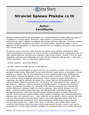 Stroiciel Śpiewu Ptaków cz III Publikacja na extrastory.czytajzafree.pl Autor: LechMucha Jastrząb siedział przed chatą i przyglądał się z zainteresowaniem stadku gilów buszujących w gałęziach na krzaku głogu. Śmieszne, małe ptaszki w czerwonych kubraczkach przeskakiwały lekko z gałązki na gałązkę, poszukując pokarmu. Jastrząb – jak każdy stroiciel – mógł przyglądać się ptakom bez końca. Ich widok, śpiew, nieustanny rwetes i ruch w gałęziach drzew sprawiały mu ogromną przyjemność, tym większą, że teraz w zimie ptaków było wokoło mniej. W pewnej chwili w drzwiach chaty ukazała się ciężka postać Badory, gospodarza, który udzielił Jastrzębiowi schronienia na zimę w zamian za niewielką pomoc w gospodarstwie. Od kilku tygodni Jastrząb mieszkał wraz z Badorą i jego liczną rodziną, i dzieląc z nimi ich życie, stopniowo nabierał coraz większego szacunku dla ich przekonań, dla sposobu, w jaki żyją, a przede wszystkim – dla ich codziennej, ciężkiej pracy. – Można zasiadać – powiedział Badora. – Już idę – odparł Jastrząb i poczuł, że jest głodny. Po obiedzie postanowił pójść na spacer do lasu. Już od dawna nie latał i chciał przywołać jakiegoś dużego ptaka. Brakowało mu poczucia wolności, pędu wichru w skrzydłach, szumu powietrza w uszach. Był tak zniecierpliwiony, że nie zauważył dwóch ludzi podążających jego śladem. Zapuścił się głęboko w las, z dala od ludzkich siedzib, w miejsce, gdzie kilka dni wcześniej widział latającego ponad lasem sokoła. Usiadł na polanie pod drzewem, i napawając się piękną scenerią zimowego lasu, czekał. Było już późne popołudnie, gdy zauważył ptaka. Wyjął zza pazuchy flet i zaczął grać. Po chwili wpadł w trans i poczuł, że jest ptakiem – pięknym, wolnym, szybkim jak strzała sokołem. Szybował nad zimowym lasem, na przemian wznosząc się i opadając. Ptak, którego przywołał, był w doskonałej formie. Widocznie niedawno udało mu się coś upolować, gdyż wbrew obawom nie czuł głodu. Latał dla samej przyjemności lotu, dla tego jedynego, niepowtarzalnego uczucia, jakiego doświadczyć może tylko stroiciel śpiewu ptaków wcielony w ptaka. Zbliżał się wieczór. Zobaczył ponad polami wielkie stado szpaków składające się z kilkuset osobników. Odezwał się w nim instynkt łowcy, i choć właściwie nie był głodny, jednak instynkt ten wziął nad nim górę. Ruszył w kierunku stada. Szpaki, gdy tylko zobaczyły sokoła zbiły się w ciaśniejszą gromadę. Drapieżnik nieco zdezorientowany wielką liczbą małych ptaków, zaczął krążyć ponad nimi i nagle runął z góry jak kamień w sam środek stada. Stado zawróciło natychmiast jakby kierowane jedną ręką, jednak nie było w stanie ujść swemu prześladowcy. Ściana małych ptaków rozstąpiła się, przepuszczając przez środek sokoła, by Strona: 1/3 Wszelkie prawa zastrzeżone dla CzytajZaFree | Zobacz opowiadanie na extrastory.czytajzafree.pl tuż za nim zbić się ponownie w gromadę. Widok setek ptaków – poruszających się jednocześnie, zawracających nagle, wznoszących się, to znów opadających – był wspaniały. Jednak w pewnej chwili ogarnęło go uczucie strachu. Poczuł, że nie może wrócić do ludzkiej postaci. Coś takiego nigdy mu się nie przytrafiło. Natychmiast zawrócił, by odszukać swe ludzkie ciało, pozostawione na polanie pod drzewem. Gdy nadleciał nad polanę, zobaczył że dwóch ludzi niesie jego nieprzytomne ciało, na którego głowę był nałożony hełm. Zrozumiał, że to właśnie ten hełm nie pozwala na powrót jaźni do ciała. Pojął, że został uwięziony w ciele sokoła. Zbliżył się jeszcze bardziej do napastników i w jednym z nich rozpoznał przybłędę, który kilka dni temu pojawił się we wsi i kręcił się wszędzie, jakby czegoś lub kogoś szukając. Nagle drugi z ludzi upuścił nogi jego ciała i odwrócił się, spoglądając w górę. Podniósł do ramienia kuszę i strzelił. Jastrząb gwałtownie zmienił kierunek lotu, próbując uniknąć bełtu. Jednak było już za późno. Pocisk dosięgnął prawego skrzydła ptaka. Ból, który poczuł, niemal sparaliżował jego ruchy. Ostatkiem sił, walcząc z ogarniającym go omdleniem, Jastrząb wcielony w sokoła zdołał odlecieć na bezpieczną odległość, i tracąc w końcu przytomność, spadł na ściółkę pomiędzy drzewami. Teraz nie tylko był uwięziony w ciele ptaka, ale też ciężko ranny… Katja podeszła do leżącego na stole nieprzytomnego człowieka i spojrzała na niego z żalem. Znajdowali się – ona, Zoe i Vladimir – w pracowni alchemicznej tego ostatniego, w piwnicy domu, w którym spotkali się po raz pierwszy. Ciało stroiciela w ekranującym hełmie spoczywało na drewnianym stole. Mężczyzna sprawiał wrażenie głęboko nieprzytomnego, pogrążonego w letargu. Oddychał bardzo wolno, równie wolno biło jego serce. – Pamiętaj – powiedziała – obiecałeś, że po wszystkim go uwolnisz. – Nagle gwałtownie odwróciła głowę, spojrzała na Vladimira i jej oczy zapłonęły gniewem. – Zabiłeś go, ty skurwysynu! – wrzasnęła – zabiłeś go, ty wieprzu, strzeliłeś do niego, gdy był ptakiem! – wrzeszczała – zapominasz, że jestem telepatką, przede mną nic nie ukryjesz… Mężczyzna bez ostrzeżenia z całych sił uderzył ją w twarz tak szybko i niespodziewanie, że nie zdążyła się uchylić. – Uspokój się – powiedział chłodno – on nie zginął. Ta durna, zezowata, łamaga nie trafiła dużego ptaka z kilku metrów. Prawdopodobnie tylko go ranił. I cholernie nam to utrudni robotę. – Gówno mnie obchodzi twoja zasrana robota! – krzyknęła przez łzy Katja – Nic dla ciebie nie zrobię. – Tak? – Vladimir uśmiechnął się szyderczo – to poderżnę mu gardło i nawet, jeśli ptak przeżył, to nie będzie miał gdzie wrócić, a ty możesz